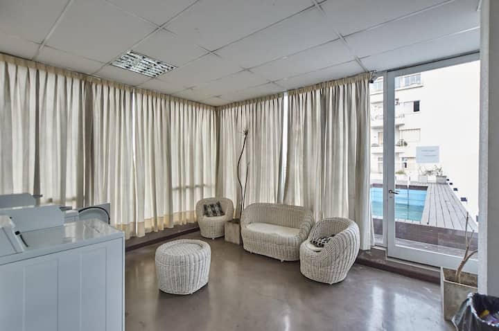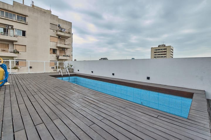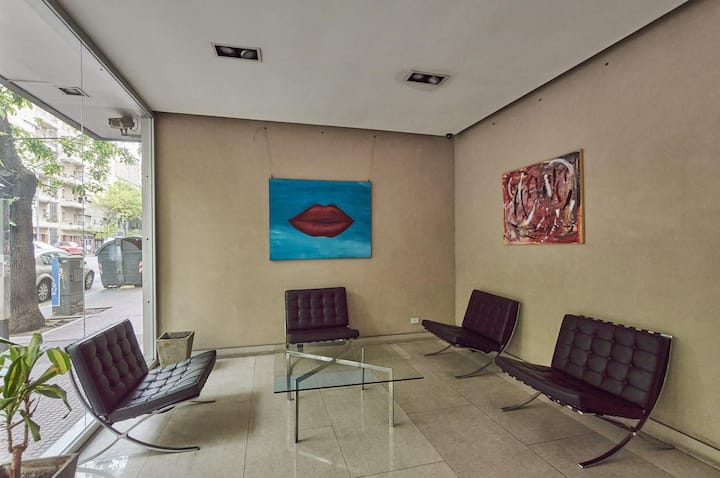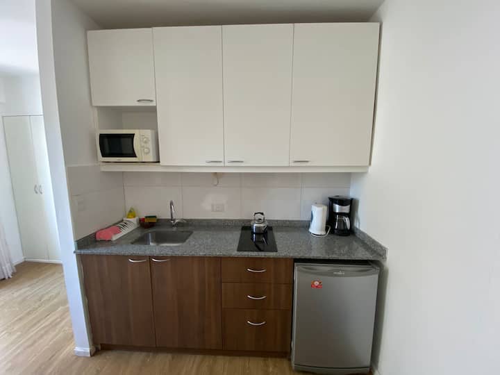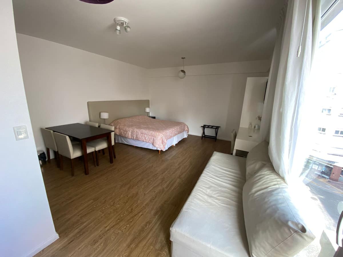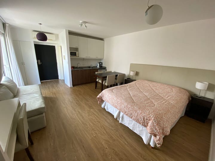 Departamento de 1 dormitorio en San Telmo con cama doble y sofá cama. Incluye una cocina pequeña para preparar y guardar alimentos. En el ambiente privado se dispone de una zona de descanso.