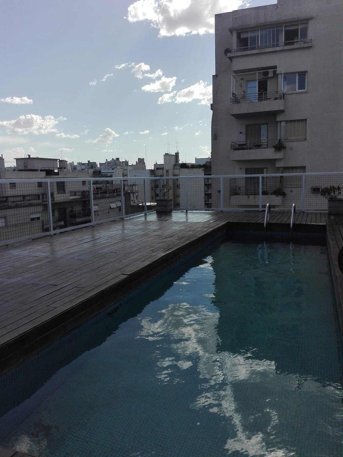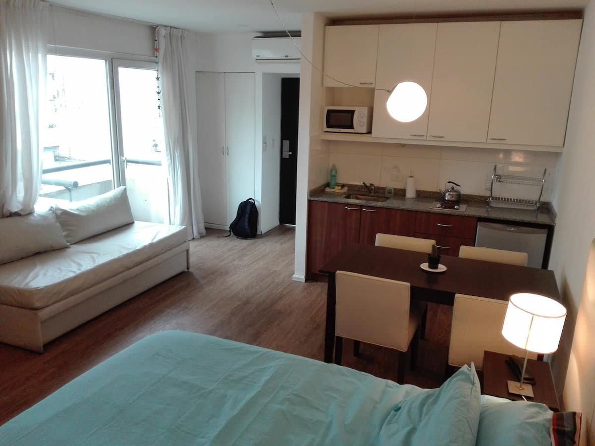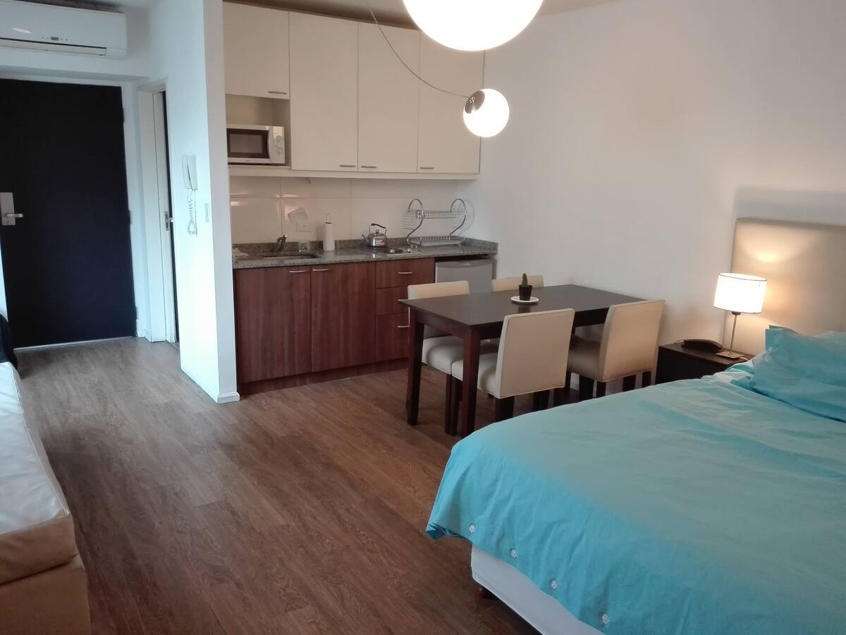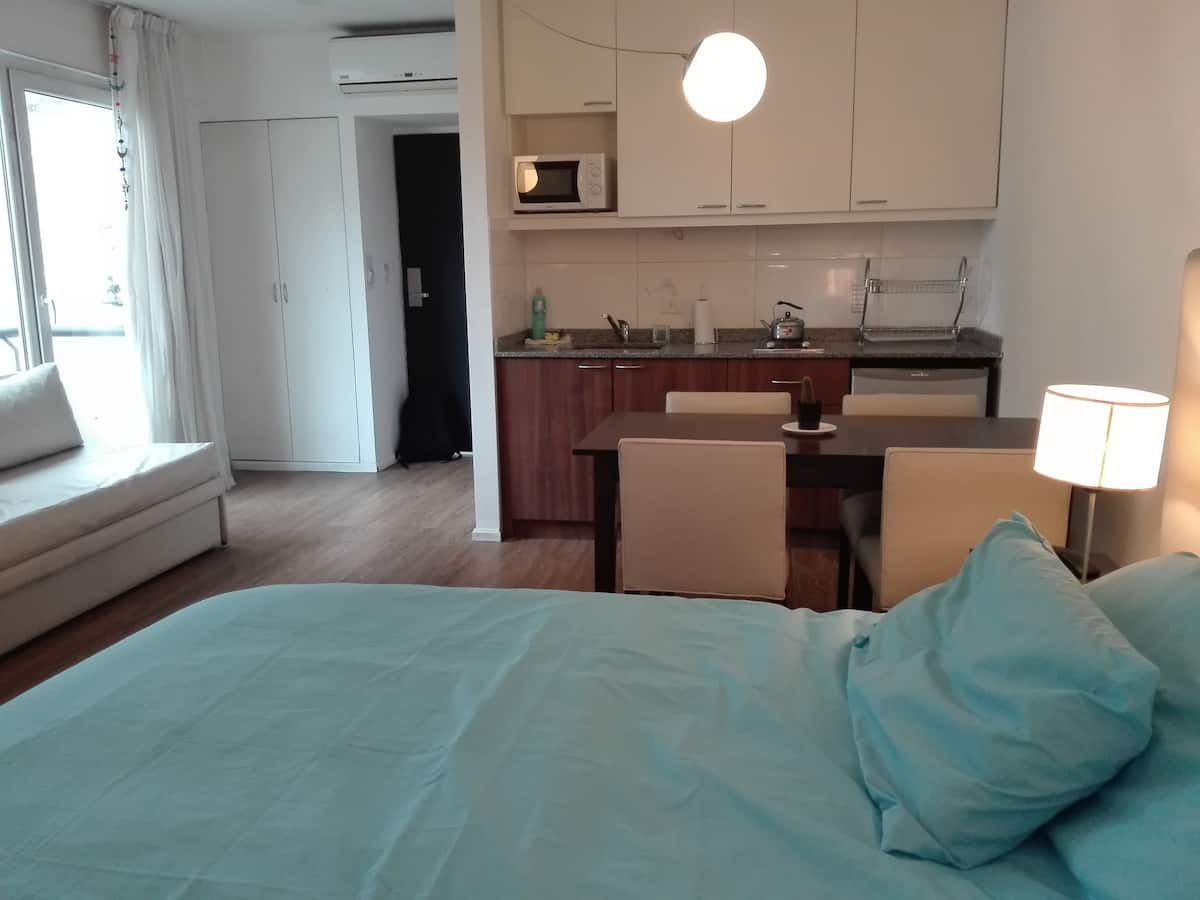 Monoambiente en San Telmo con pileta. Cuenta con cama para 2 personas y cocina pequeña para preparar y guardar alimentos. Hay posibilidad de alojar a un pasajero adicional o un niño en una silla ubicada en el mismo ambiente.