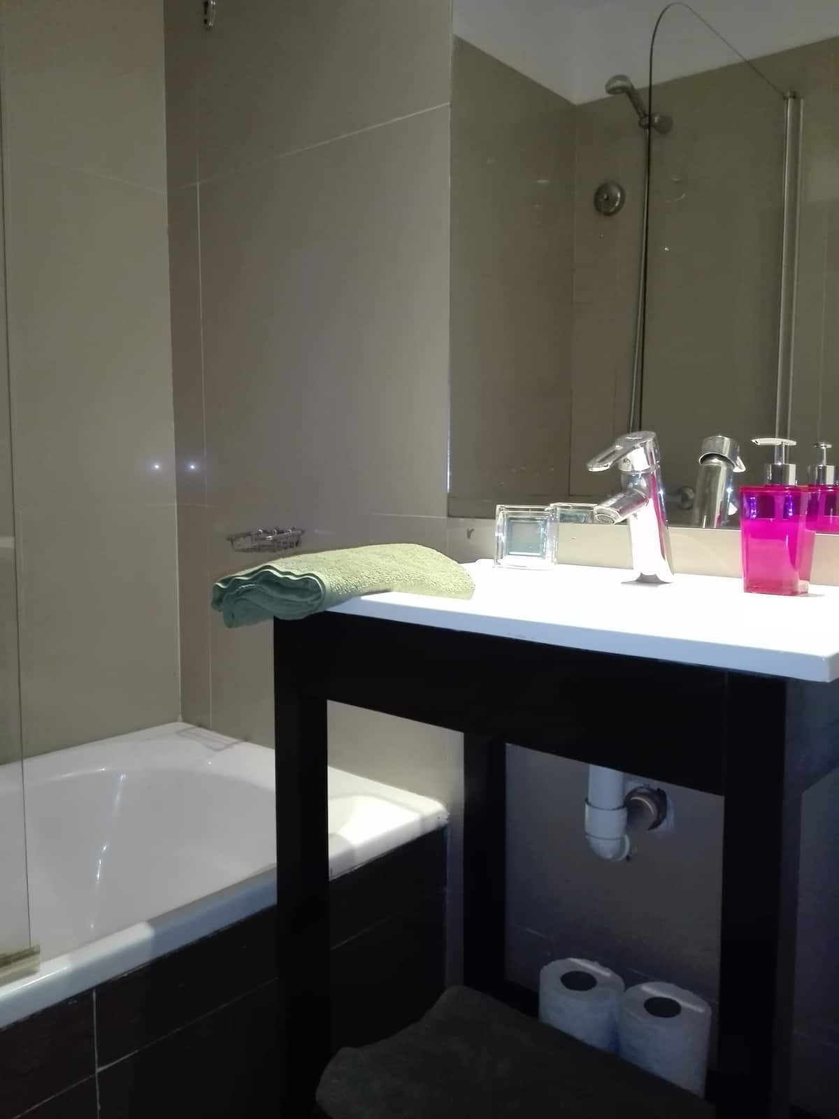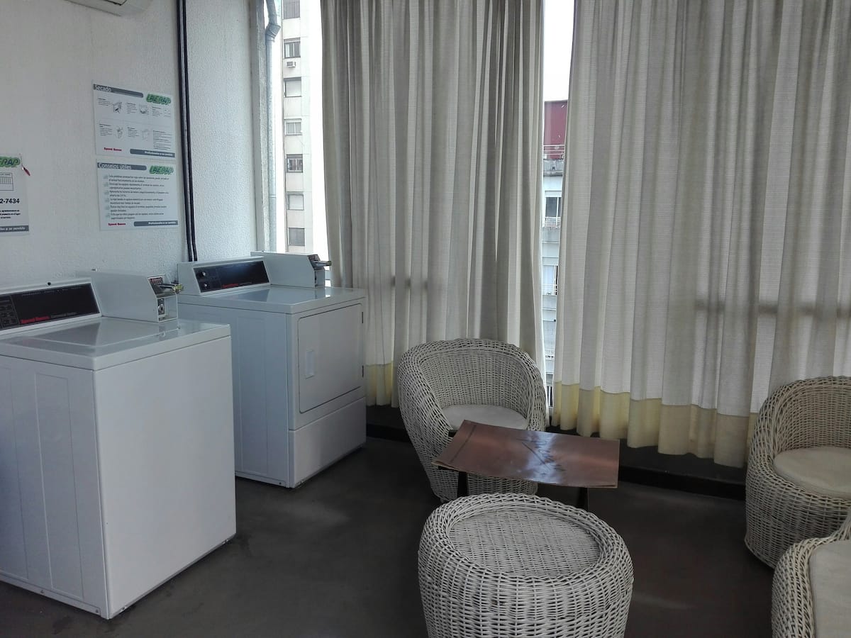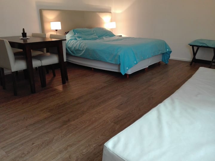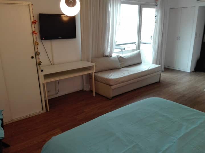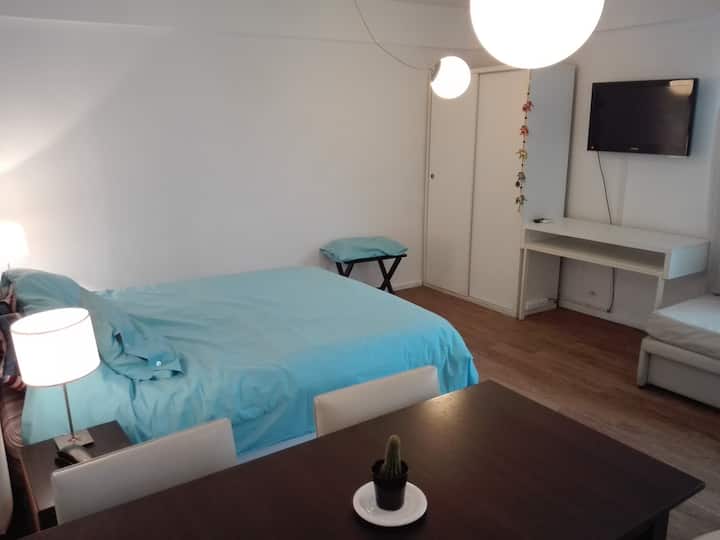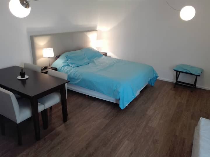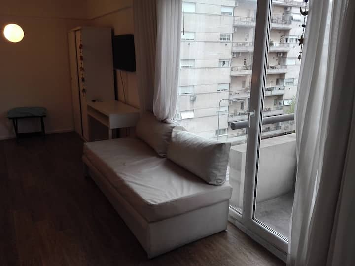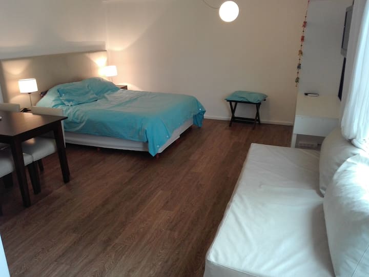 Monoambiente en San Telmo con pileta. Cuenta con cama para 2 personas y cocina pequeña para preparar y guardar alimentos. Hay posibilidad de alojar a un pasajero adicional o un niño en una silla ubicada en el mismo ambiente.
