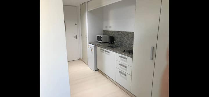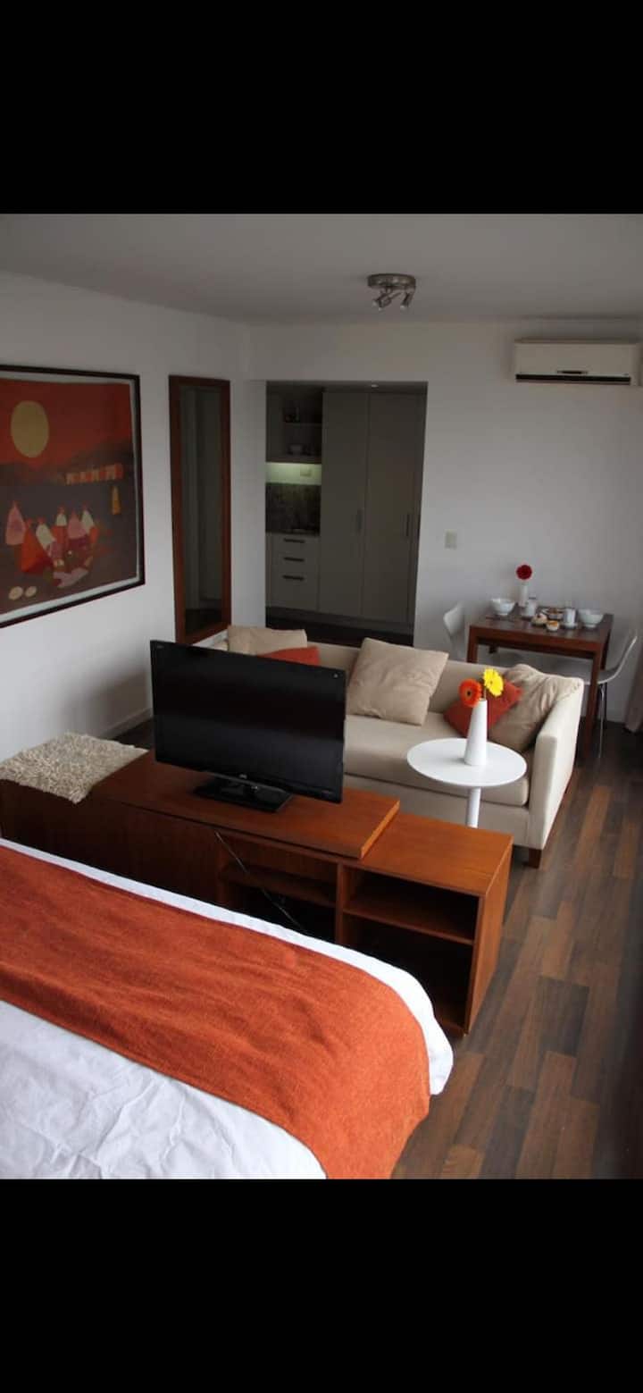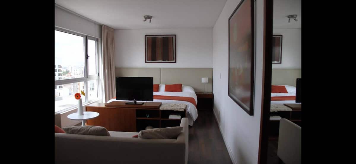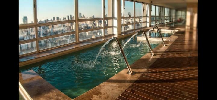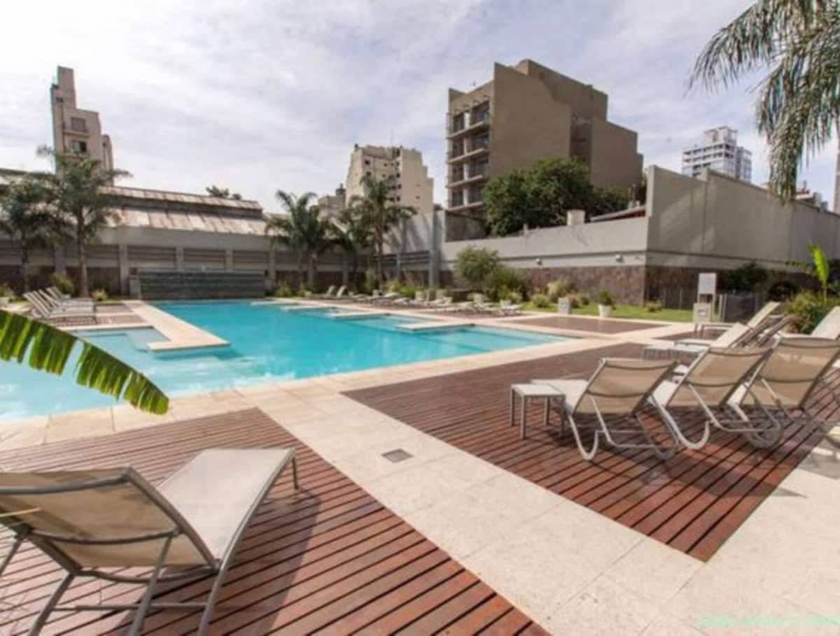 Monoambiente en Torre Quartier San Telmo, amoblado y equipado. Cuenta con aire acondicionado frío/calor, cable y WiFi de 50 MB. El edificio dispone de pileta climatizada, jacuzzi, sauna, gimnasio, laundry y áreas de trabajo. La disponibilidad de pileta climatizada, sauna y spa es para mayores de 16 años, y los niños mayores de 3 años sin pañal pueden ingresar a la pileta exterior.