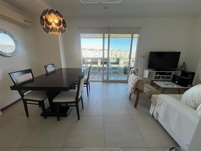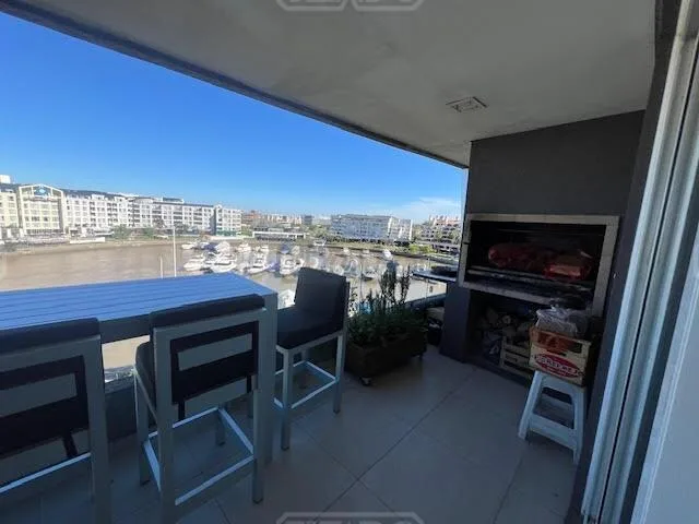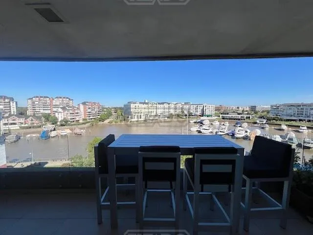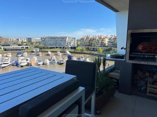 Departamento de 2 ambientes en alquiler en el Complejo Vista Bahía, Bahía Grande de Nordelta, en 4° piso y primera línea sobre el río, sin muebles. Cuenta con AA en ambos ambientes, living-comedor con cocina integrada y cocina eléctrica. Incluye toilette y baño en el dormitorio con hidromasaje, placard de piso a techo, balcón aterrazado con parrilla y calefacción por losa radiante individual. Tiene cochera cubierta. El complejo ofrece piscina climatizada y piscina exterior, SUM, gimnasio, sauna,