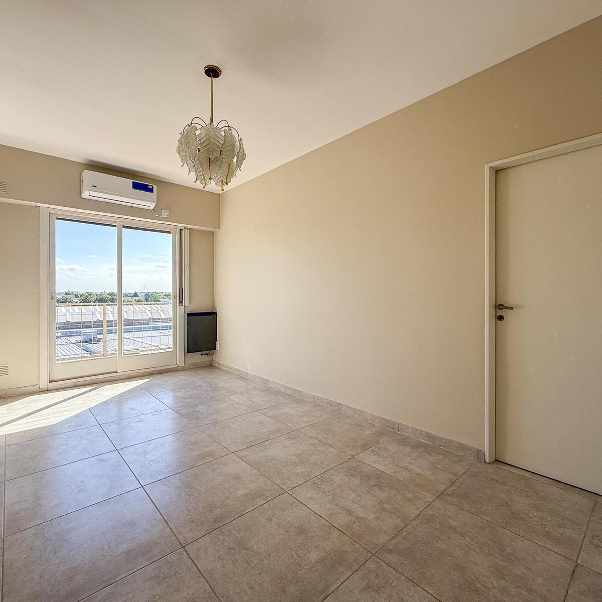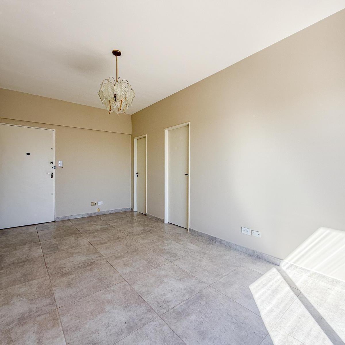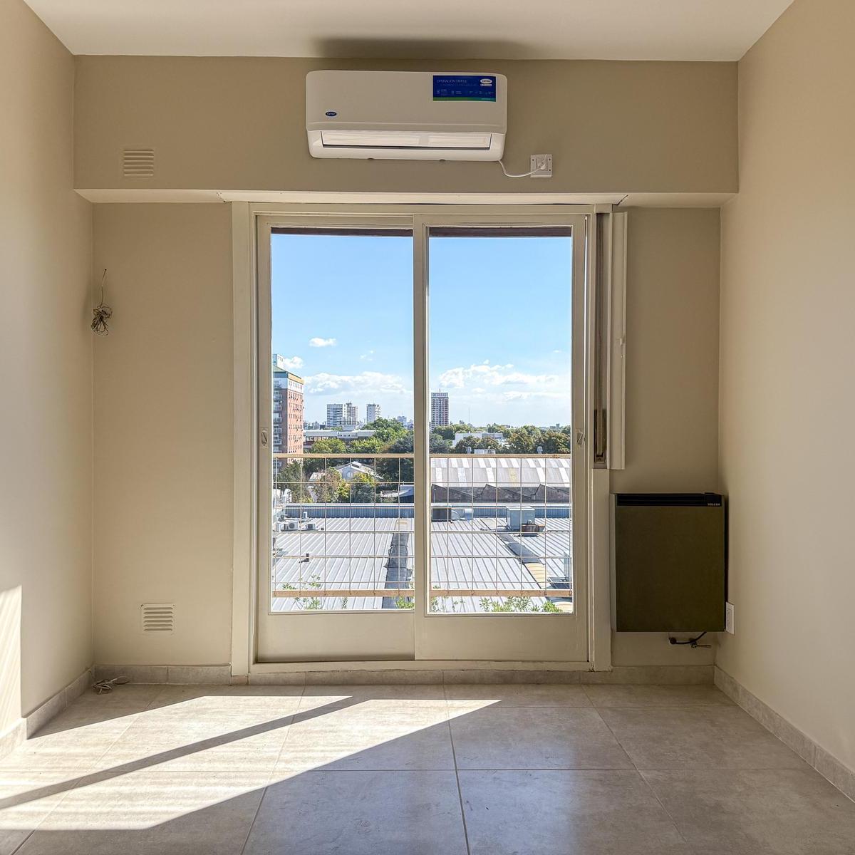 Apartamento de 2 ambientes com varanda em formato de terraço e vista aberta. Cozinha independente com fogão a gás, armários sob e sobre a bancada, além de área de lavanderia. Sala de estar e jantar com acesso à varanda, quarto com armário embutido e banheiro completo. Condomínio de $ 75.000, com Aysa incluso. Locação com fiança de aluguel (caución) excluída. Fica a 100 metros da Av. Juan B. Justo.