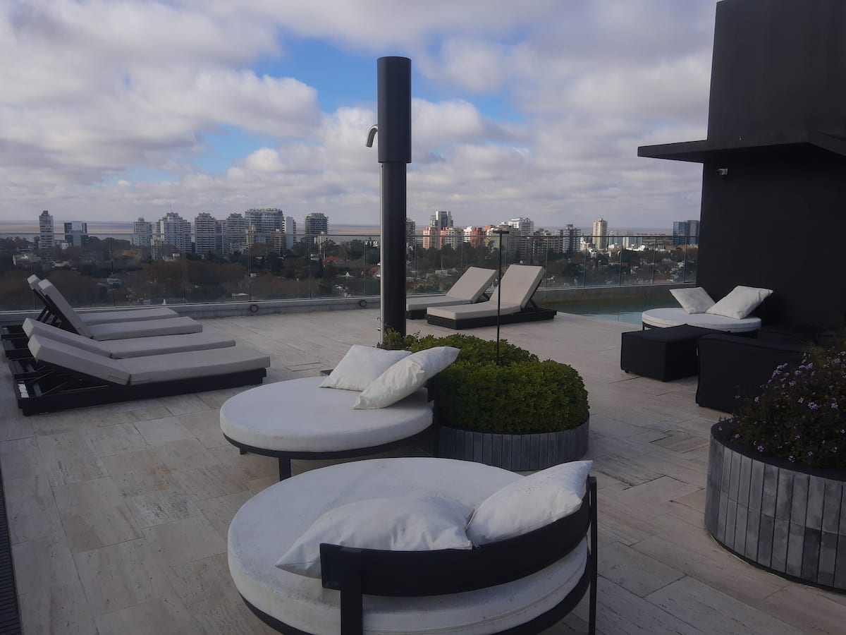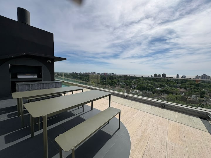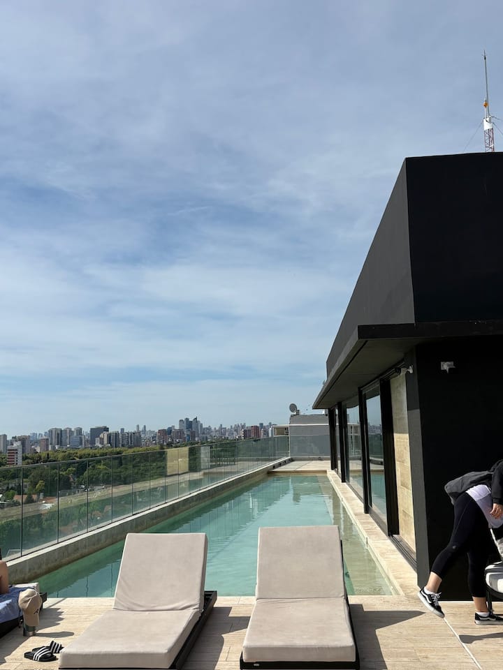 Departamento en Vicente López descrito como a estrenar. Se indica que tiene pileta climatizada y espacio exterior, con vistas. La publicación menciona cercanía al aeropuerto Jorge Newbery y al acceso a la autopista Gral. Paz, y proximidad al río y la costanera.