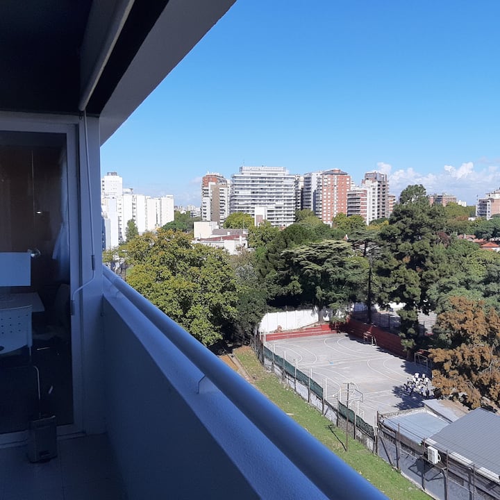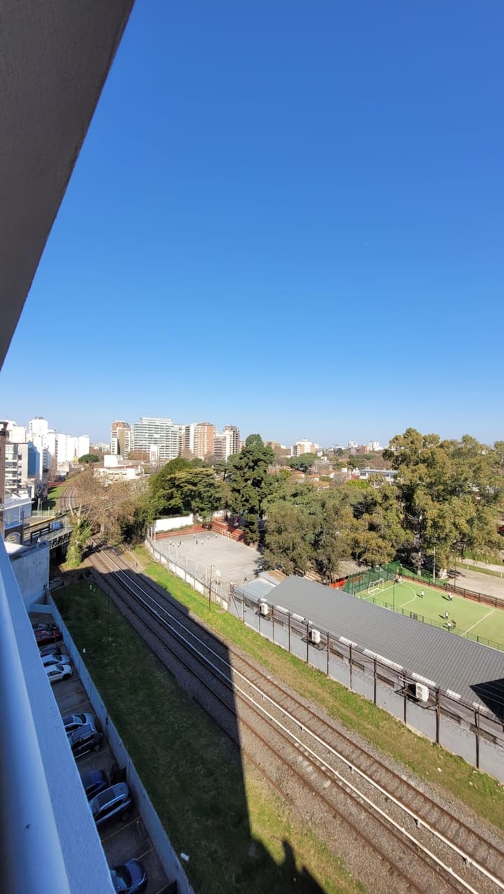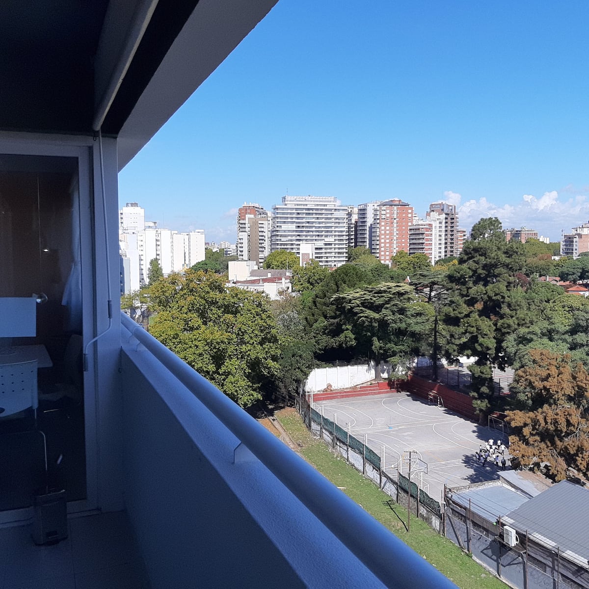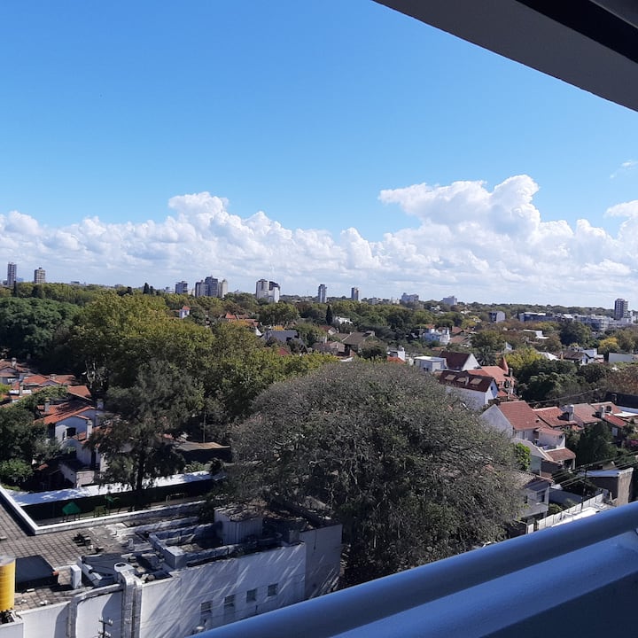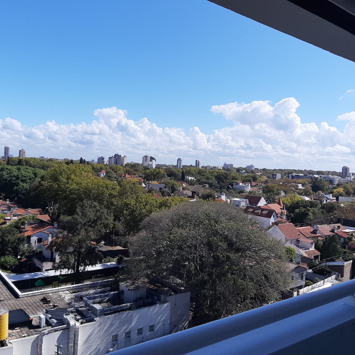 Departamento de 1 dormitorio de 2 ambientes en Vicente López, en un edificio de 12 años, en el 8° piso y al contrafrente, con vista abierta al arboleda de Olivos. Living con TV y escritorio, ventanas con doble vidriado, y aire acondicionado en el dormitorio con cortinas black-out. Cuenta con balcón y acceso a terraza compartida con pileta y deck, además de Wi-Fi (router inalámbrico). Se informan 4 departamentos por piso y 2 ascensores, con seguridad privada 24 horas. Se menciona aparcamiento pag