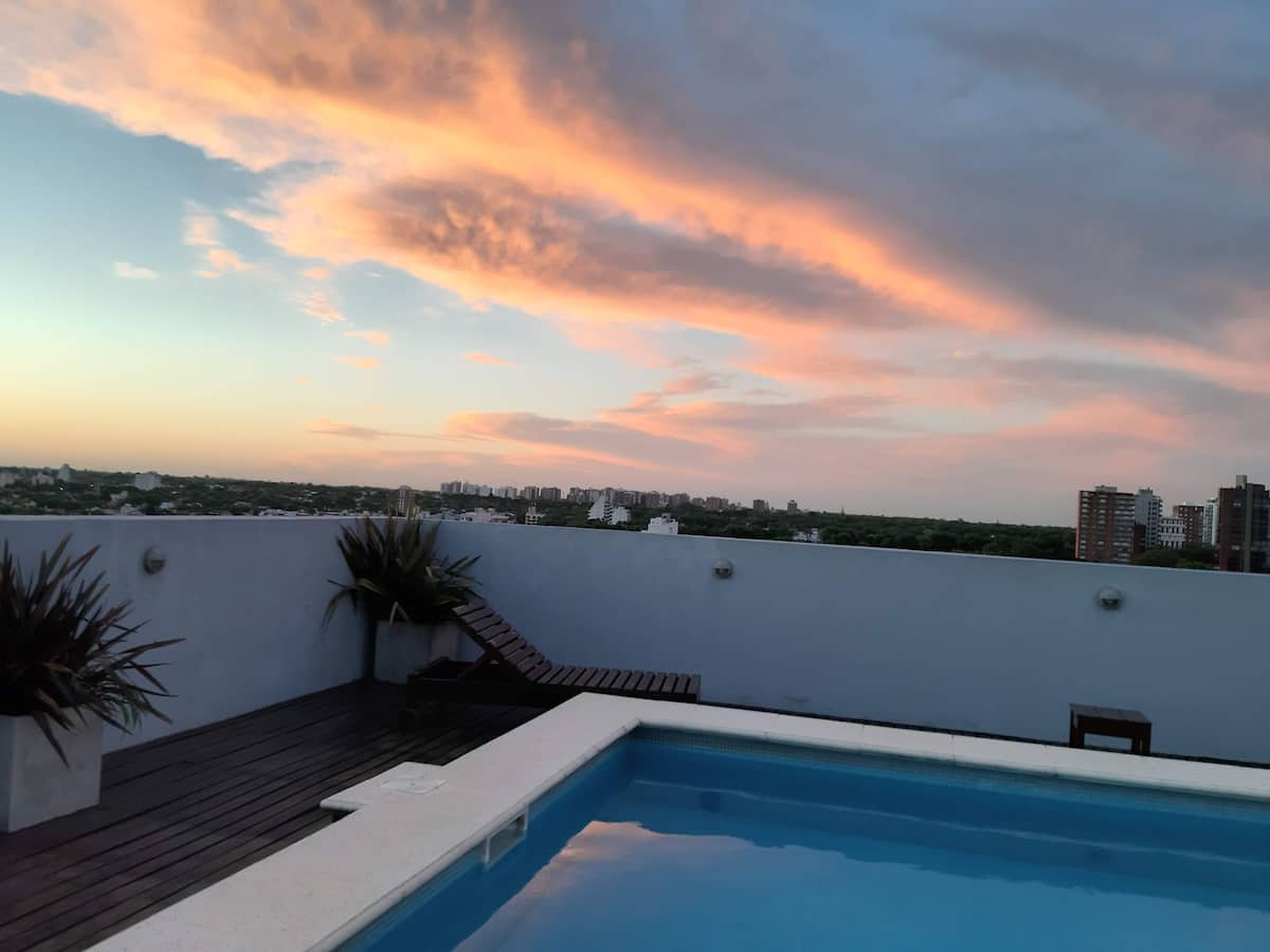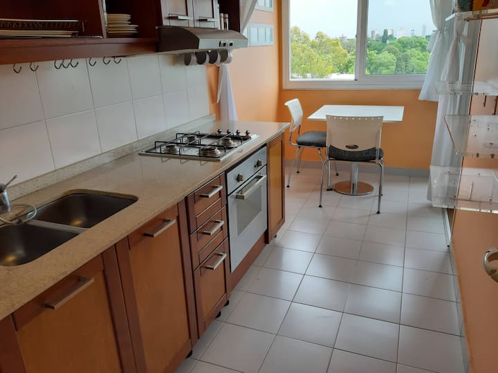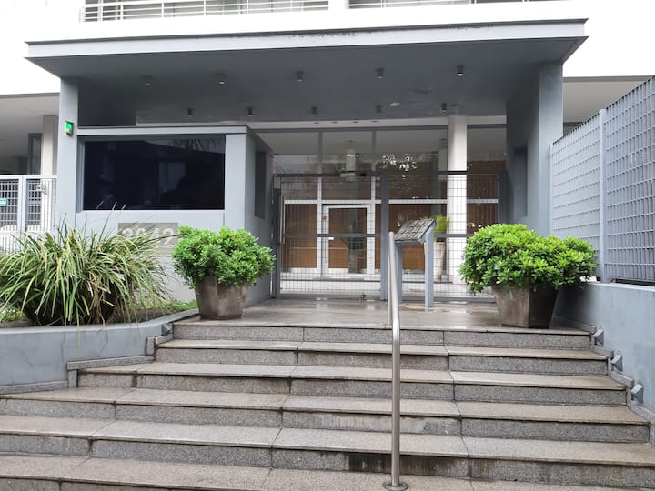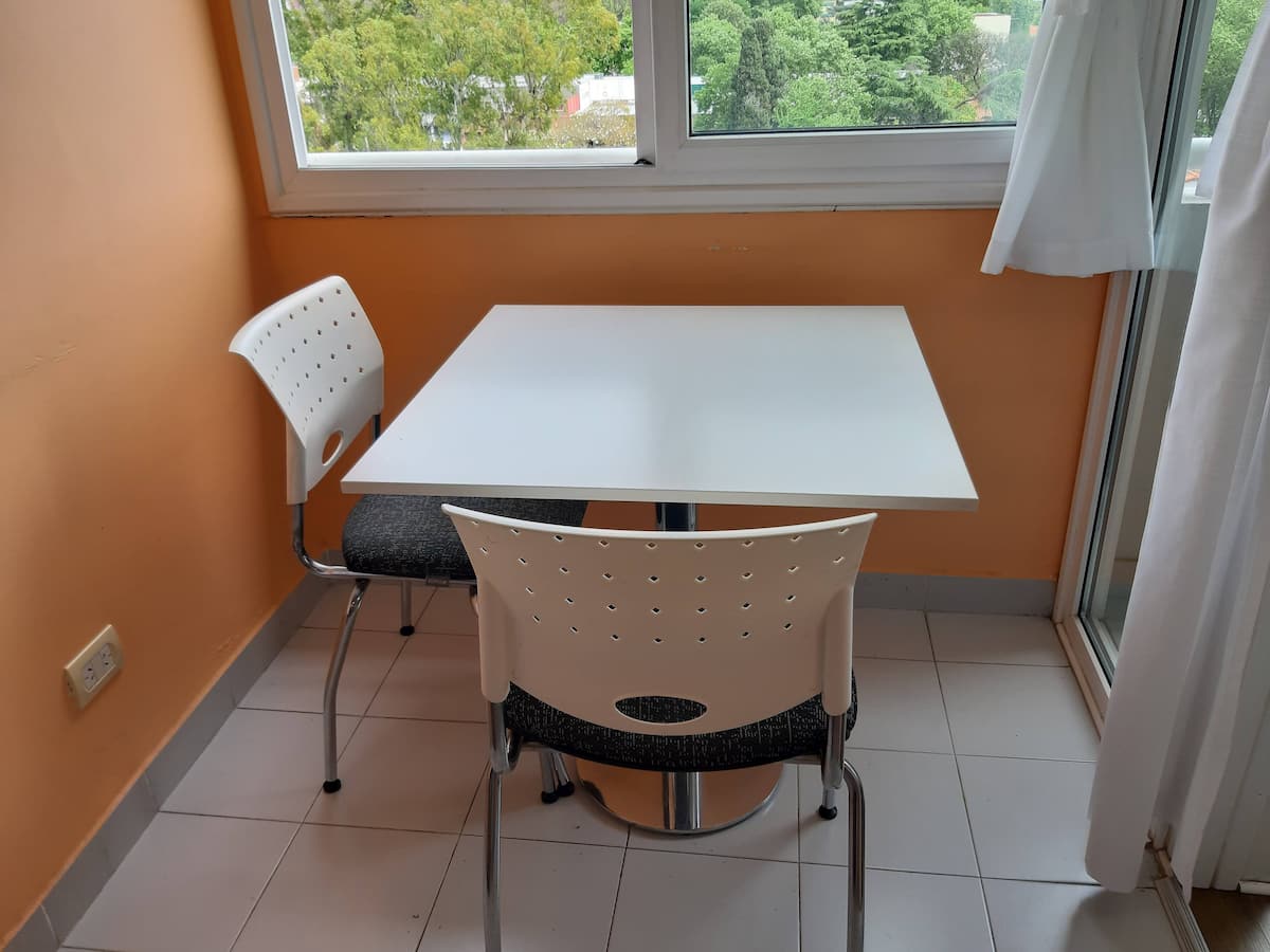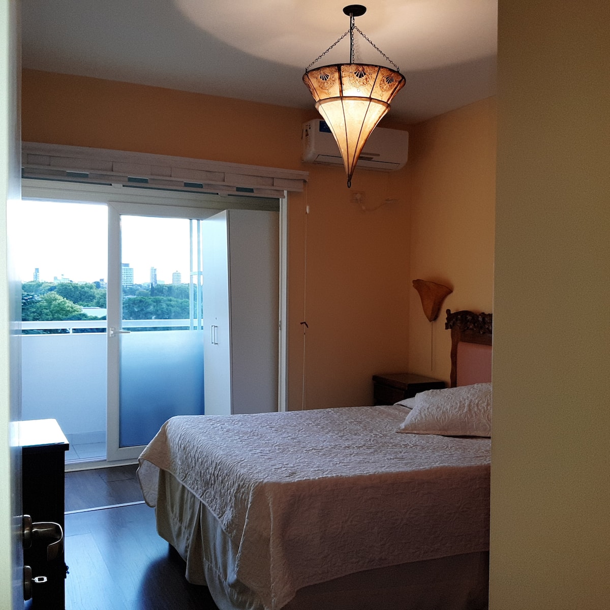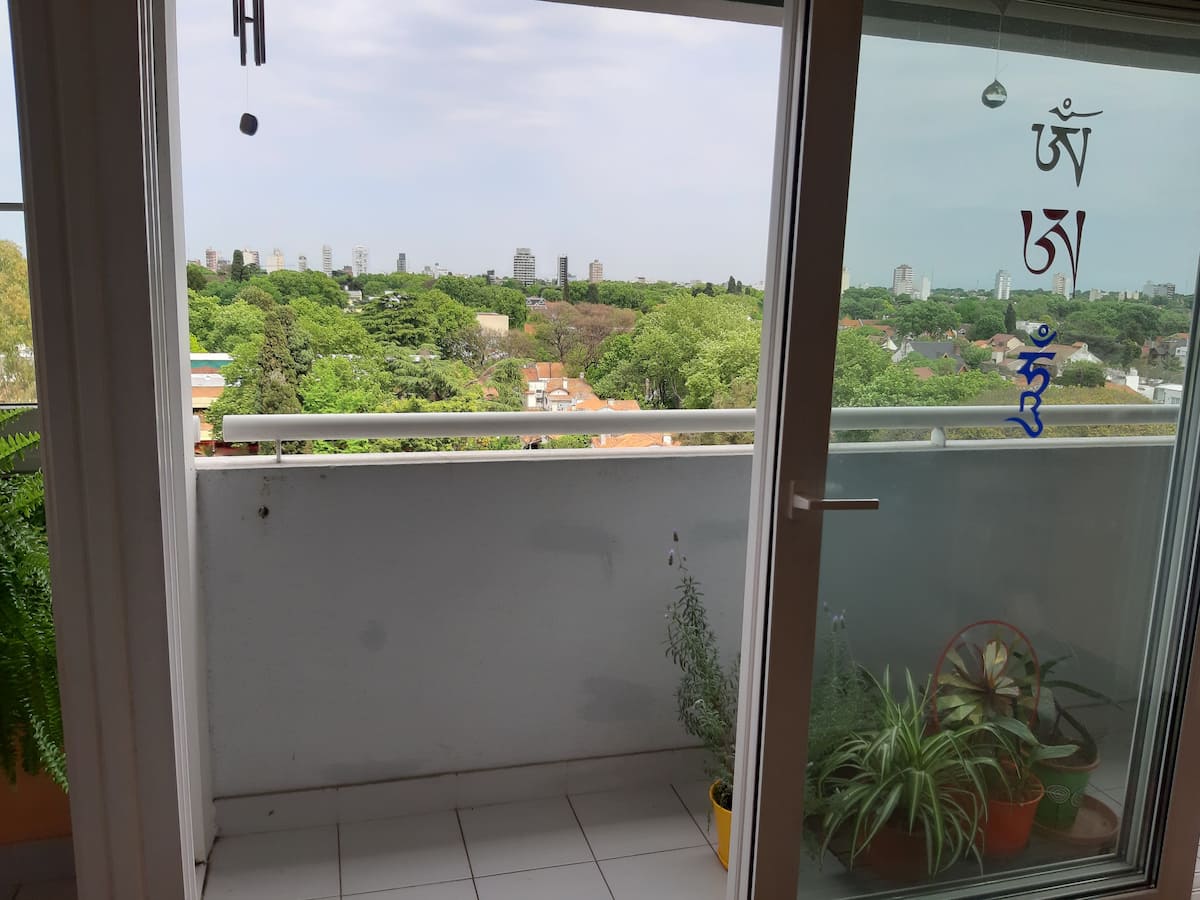 Departamento de 1 dormitorio de 2 ambientes en Vicente López, en un edificio de 12 años, en el 8° piso y al contrafrente, con vista abierta al arboleda de Olivos. Living con TV y escritorio, ventanas con doble vidriado, y aire acondicionado en el dormitorio con cortinas black-out. Cuenta con balcón y acceso a terraza compartida con pileta y deck, además de Wi-Fi (router inalámbrico). Se informan 4 departamentos por piso y 2 ascensores, con seguridad privada 24 horas. Se menciona aparcamiento pag