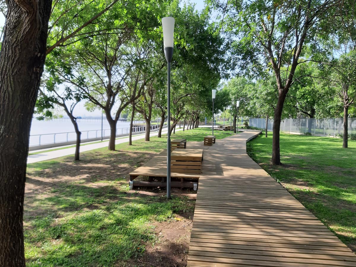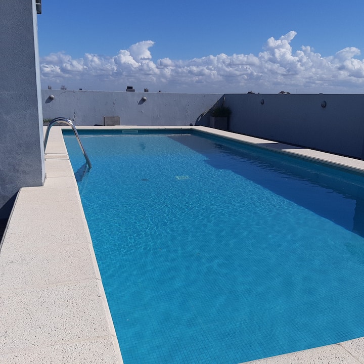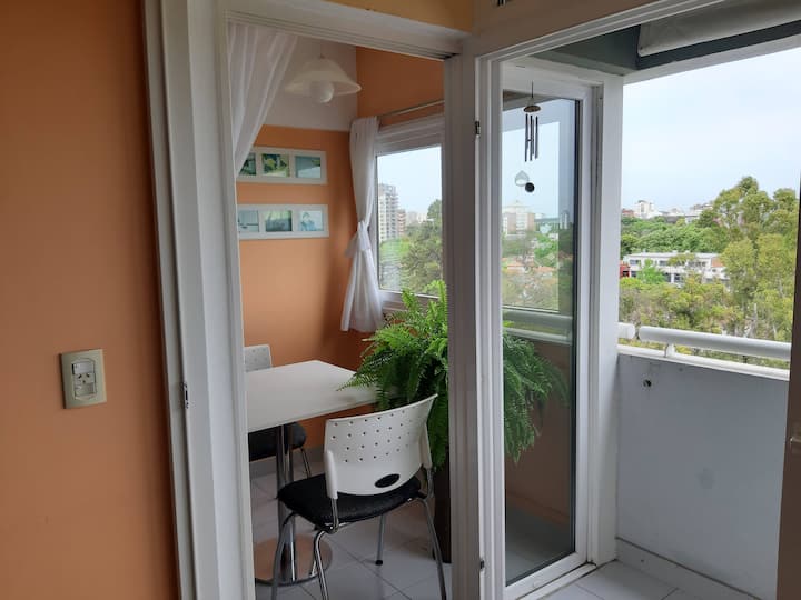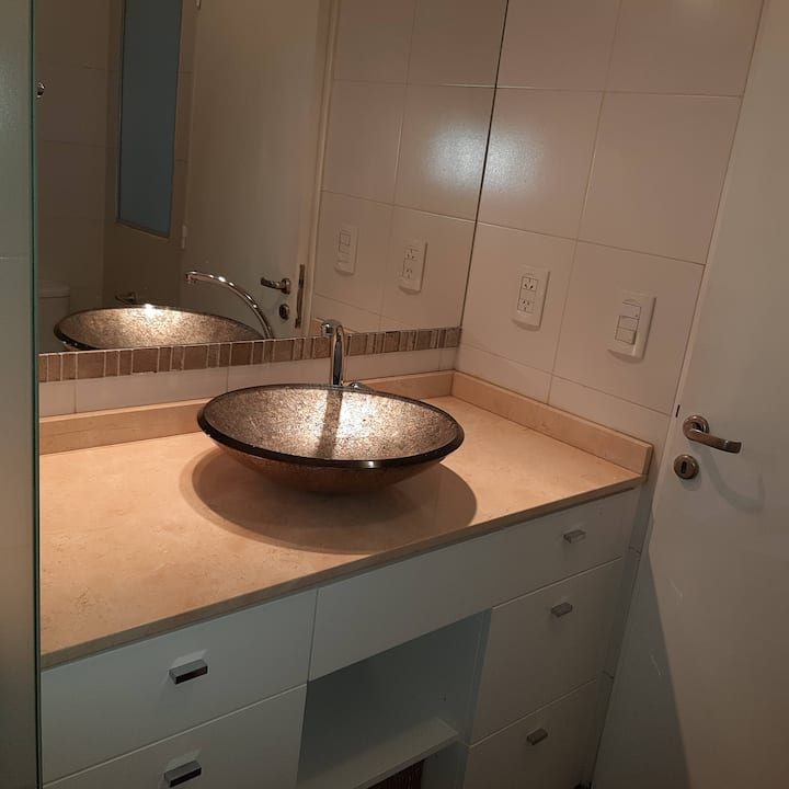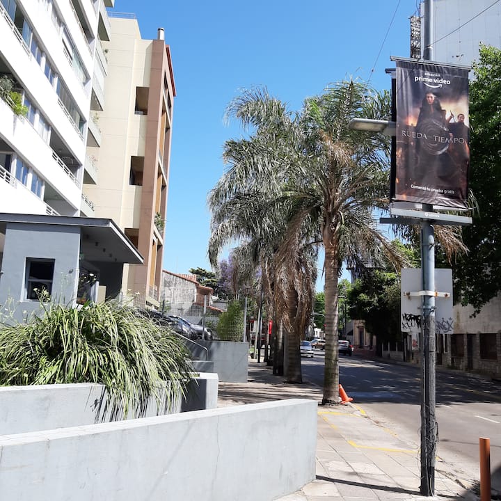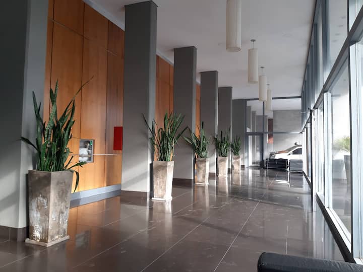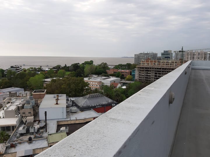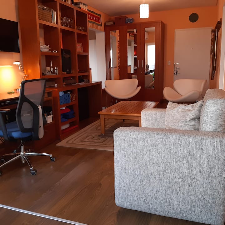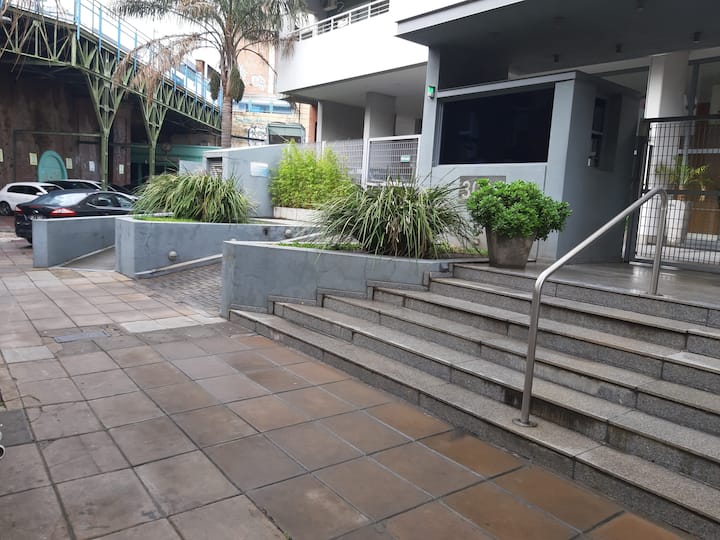 Departamento de 1 dormitorio de 2 ambientes en Vicente López, en un edificio de 12 años, en el 8° piso y al contrafrente, con vista abierta al arboleda de Olivos. Living con TV y escritorio, ventanas con doble vidriado, y aire acondicionado en el dormitorio con cortinas black-out. Cuenta con balcón y acceso a terraza compartida con pileta y deck, además de Wi-Fi (router inalámbrico). Se informan 4 departamentos por piso y 2 ascensores, con seguridad privada 24 horas. Se menciona aparcamiento pag