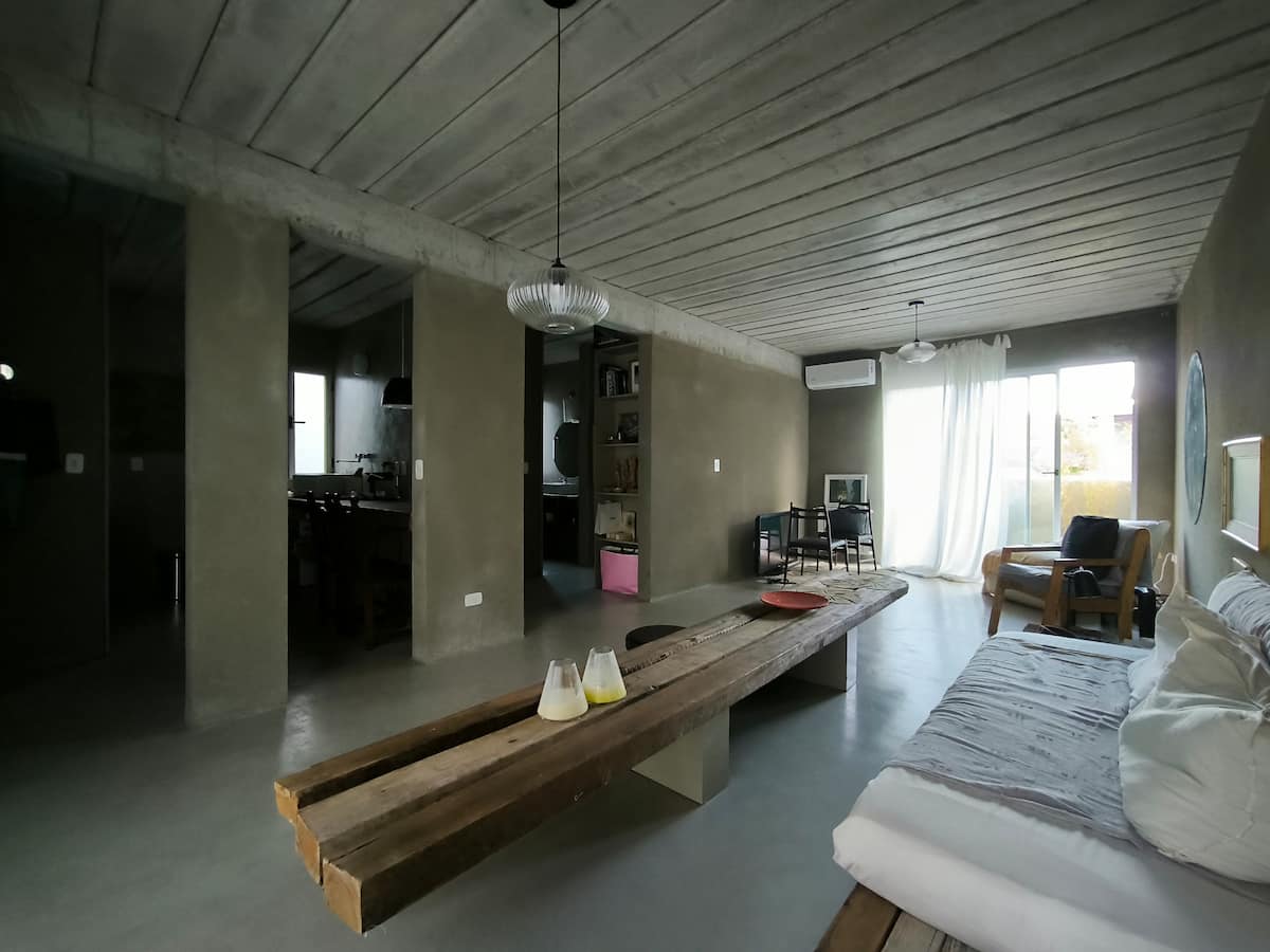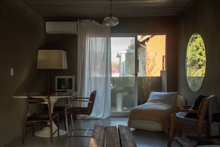 Departamento de 50 m² en Vicente López. Cuenta con living integrado a kitchenette, 1 dormitorio y 2 terrazas gemelas con vista al entorno. El espacio está ambientado con decoración en tonos neutros.