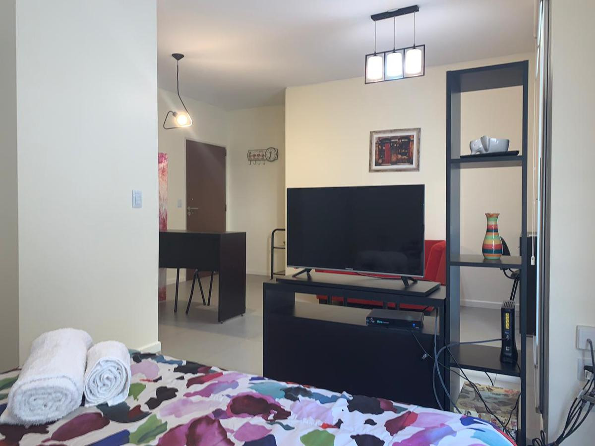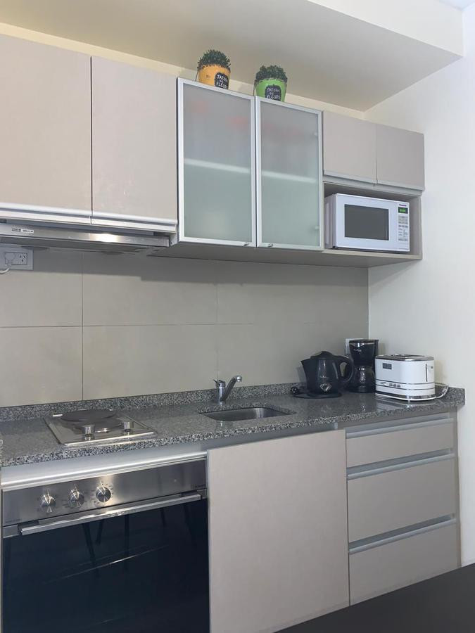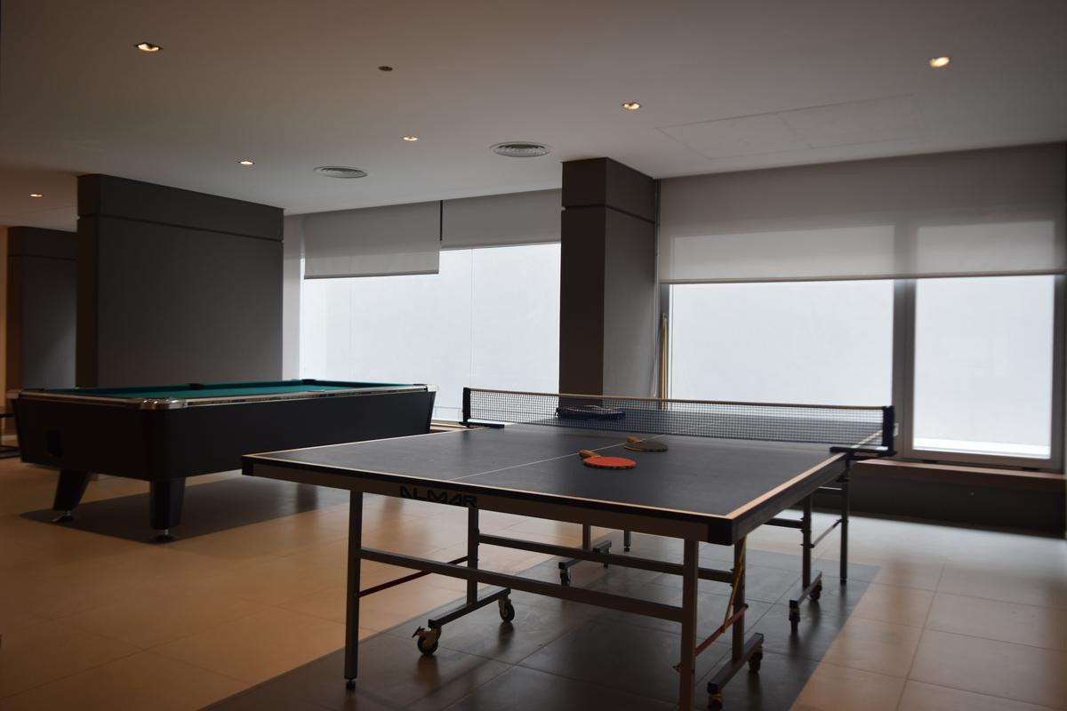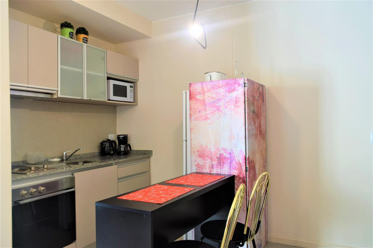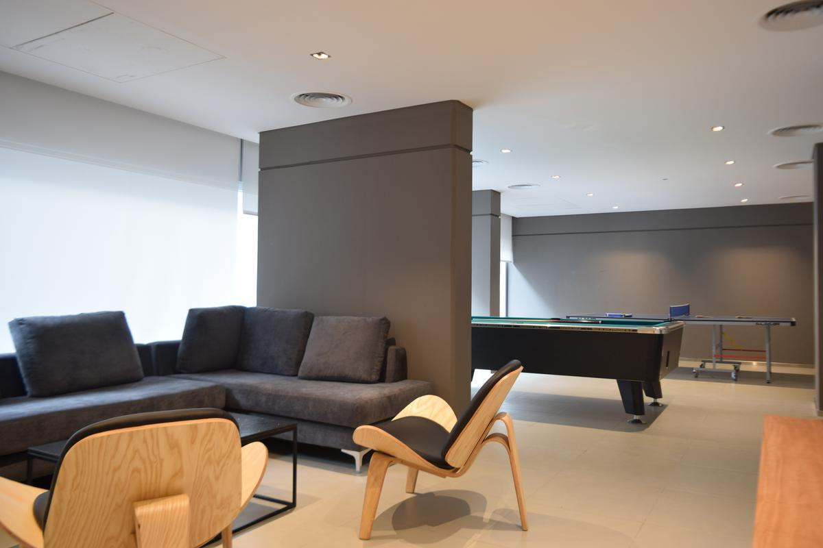 Temporary rental studio apartment in Villa Crespo. One-room unit with a seating area, desk, breakfast bar, and a fully equipped kitchen with electric oven, hotplate, fridge, microwave, toaster, electric kettle, and tableware. Sleeping area includes a double bed with drawers, built-in wardrobe, bedside tables and lamps, a modular setup and a 32-inch Smart TV, plus a full bathroom with a bathtub. The building has a communal room (SUM) for up to 50 people, games room with pool table, video games an