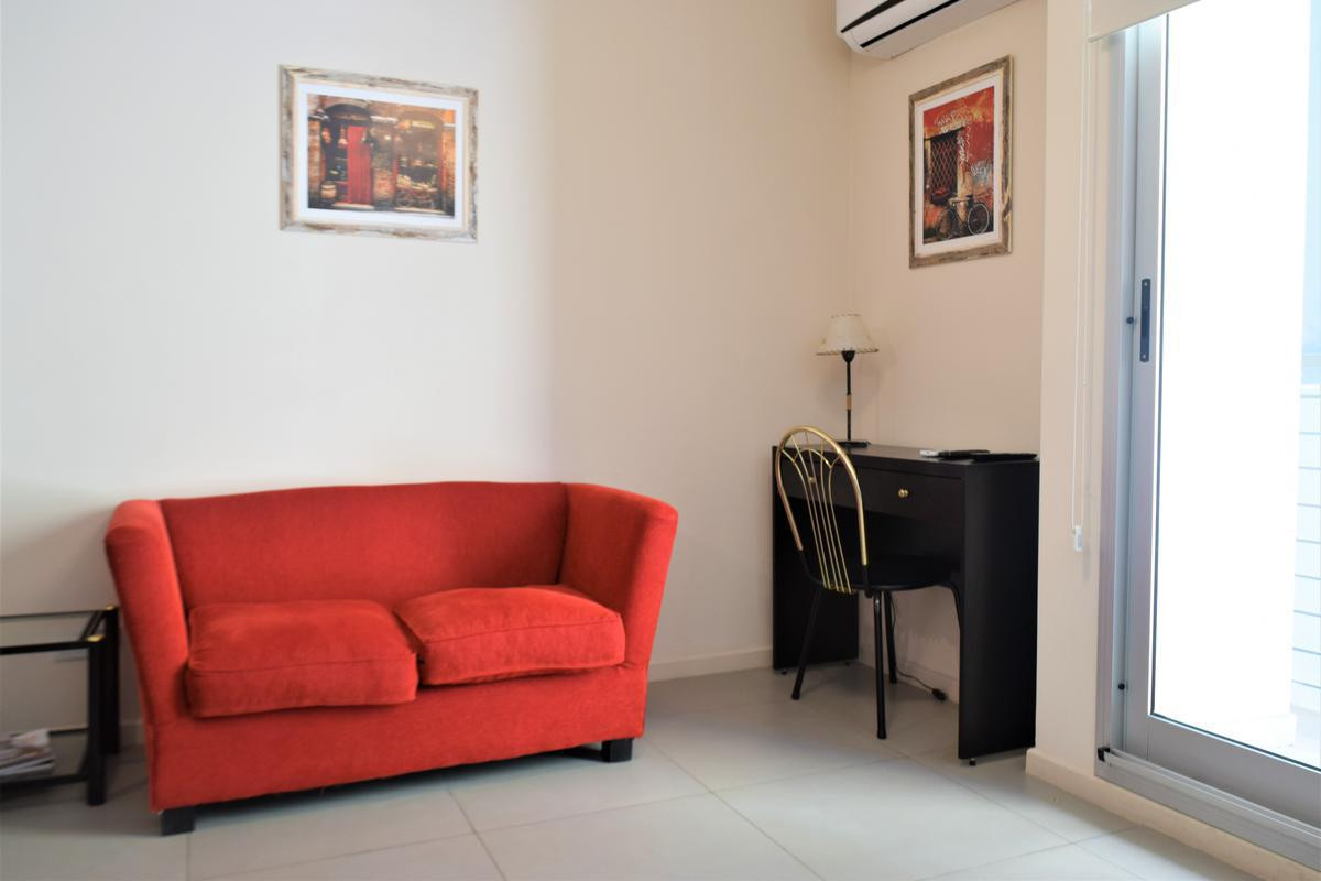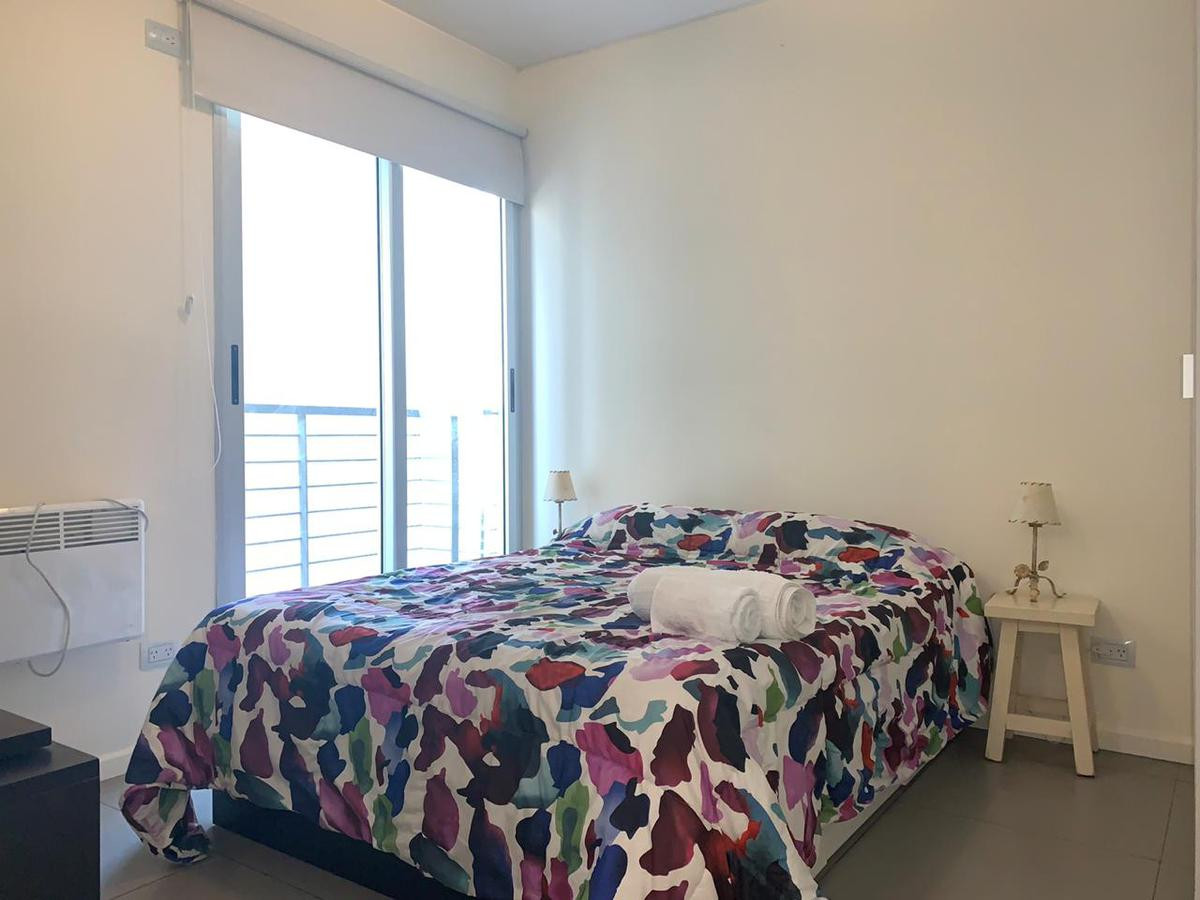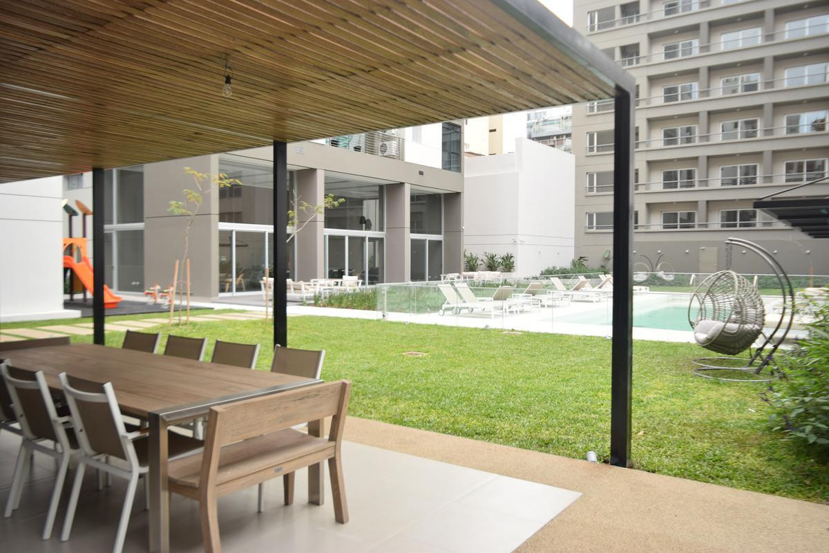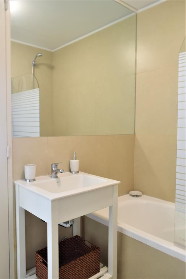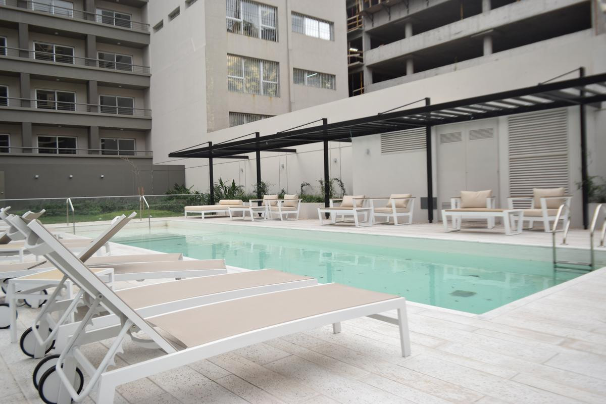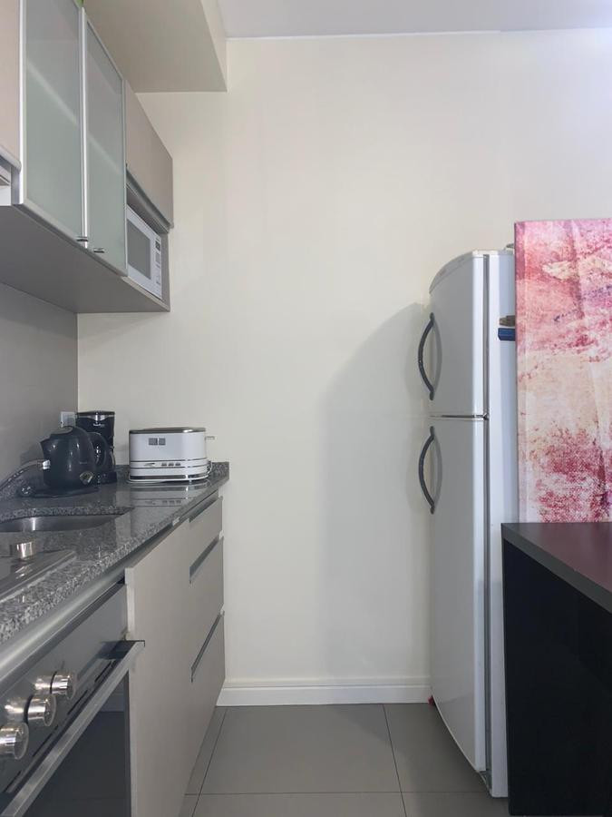 Temporary rental studio apartment in Villa Crespo. One-room unit with a seating area, desk, breakfast bar, and a fully equipped kitchen with electric oven, hotplate, fridge, microwave, toaster, electric kettle, and tableware. Sleeping area includes a double bed with drawers, built-in wardrobe, bedside tables and lamps, a modular setup and a 32-inch Smart TV, plus a full bathroom with a bathtub. The building has a communal room (SUM) for up to 50 people, games room with pool table, video games an