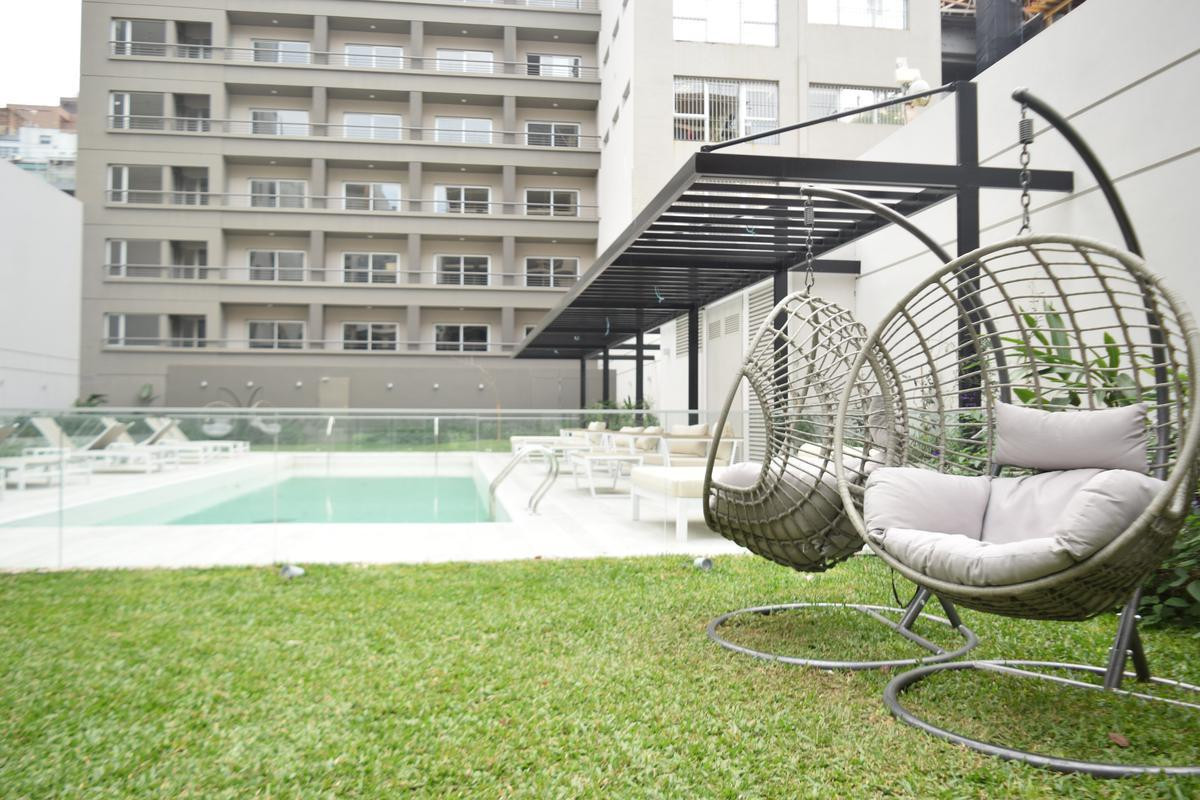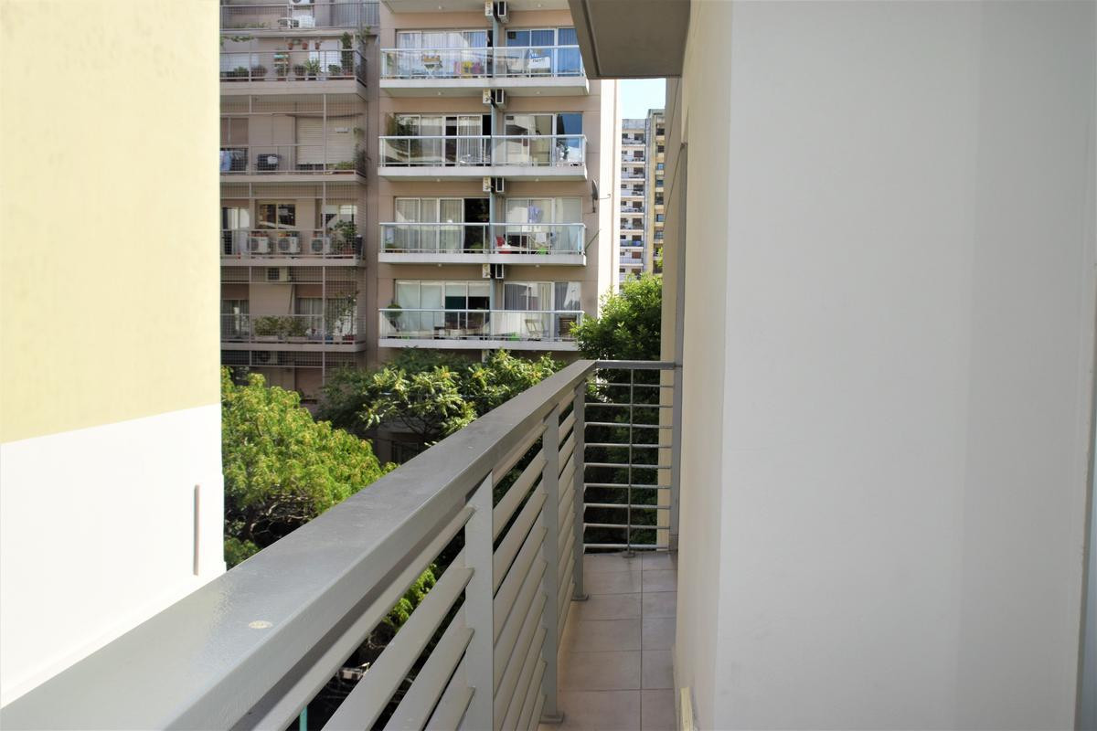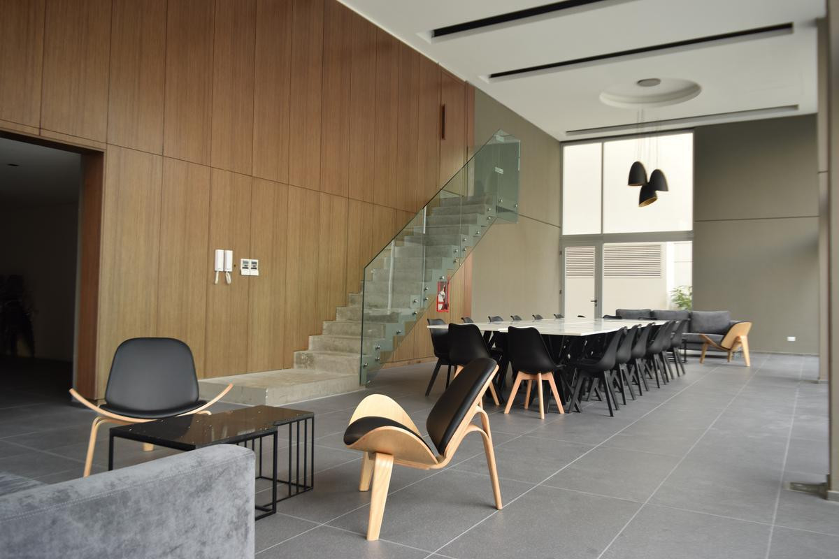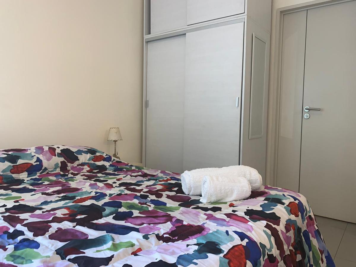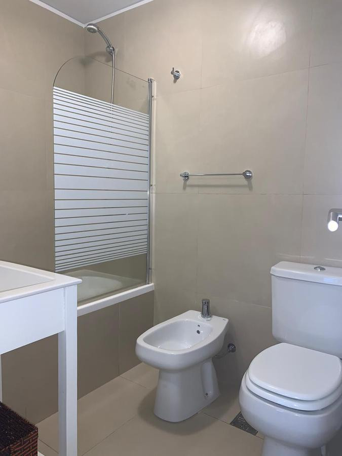 Temporary rental studio apartment in Villa Crespo. One-room unit with a seating area, desk, breakfast bar, and a fully equipped kitchen with electric oven, hotplate, fridge, microwave, toaster, electric kettle, and tableware. Sleeping area includes a double bed with drawers, built-in wardrobe, bedside tables and lamps, a modular setup and a 32-inch Smart TV, plus a full bathroom with a bathtub. The building has a communal room (SUM) for up to 50 people, games room with pool table, video games an