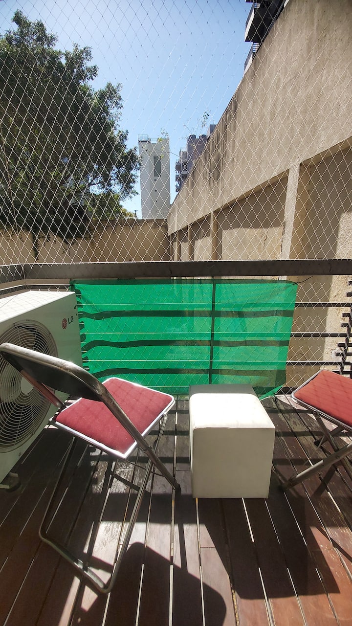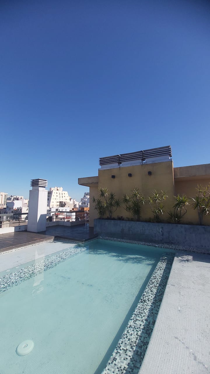 Departamento en Villa Crespo. Cuenta con balcón. Edificio con pileta, SUM, parrilla y terraza con vista panorámica de la Ciudad de Buenos Aires. El texto menciona cercanía al Metrobus y al Subte B.