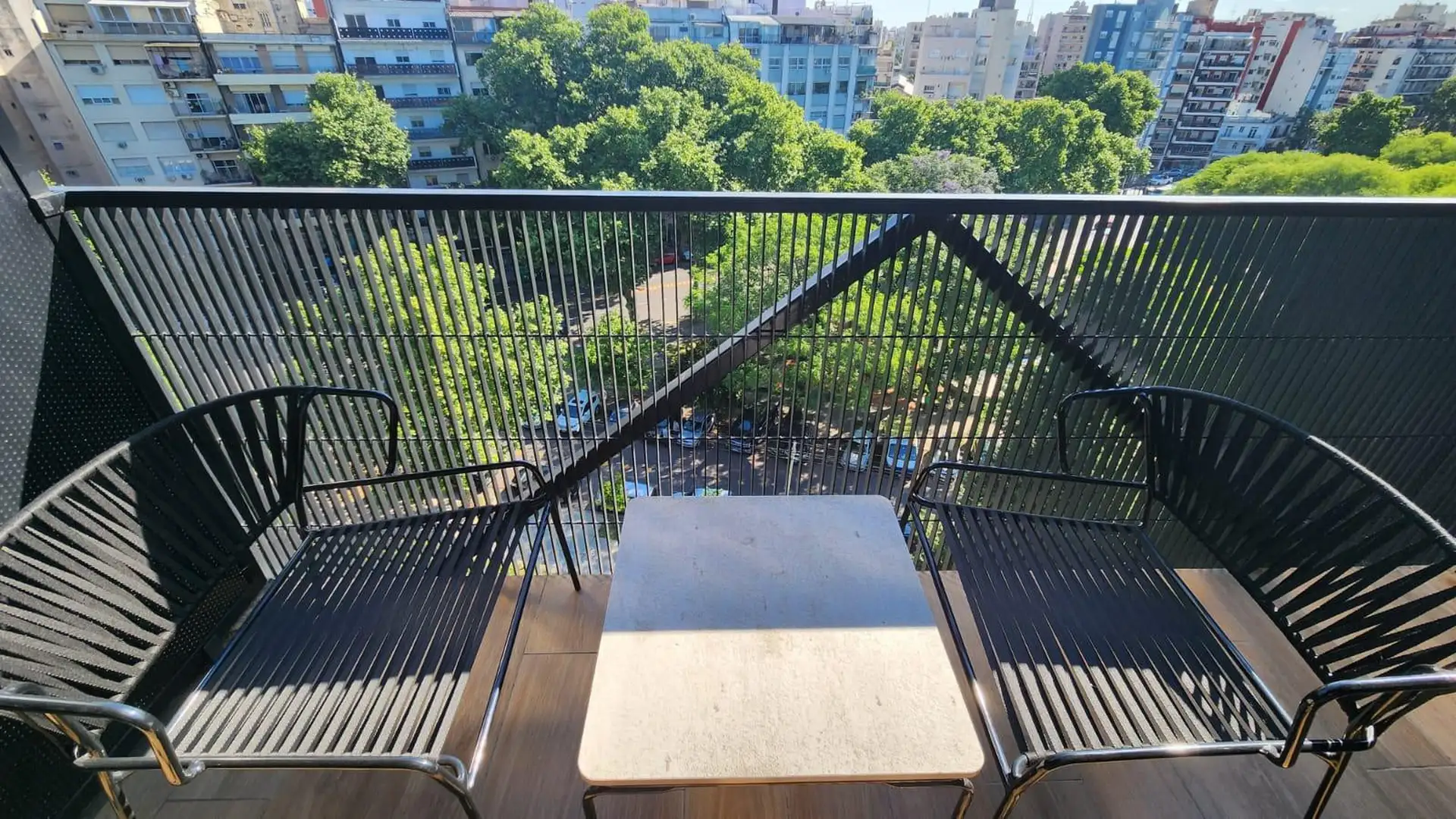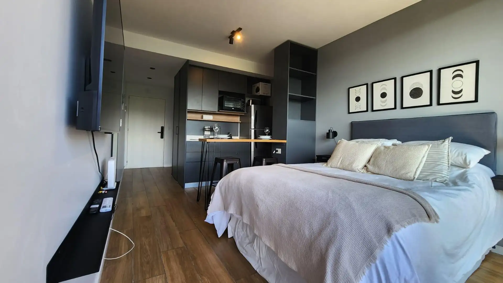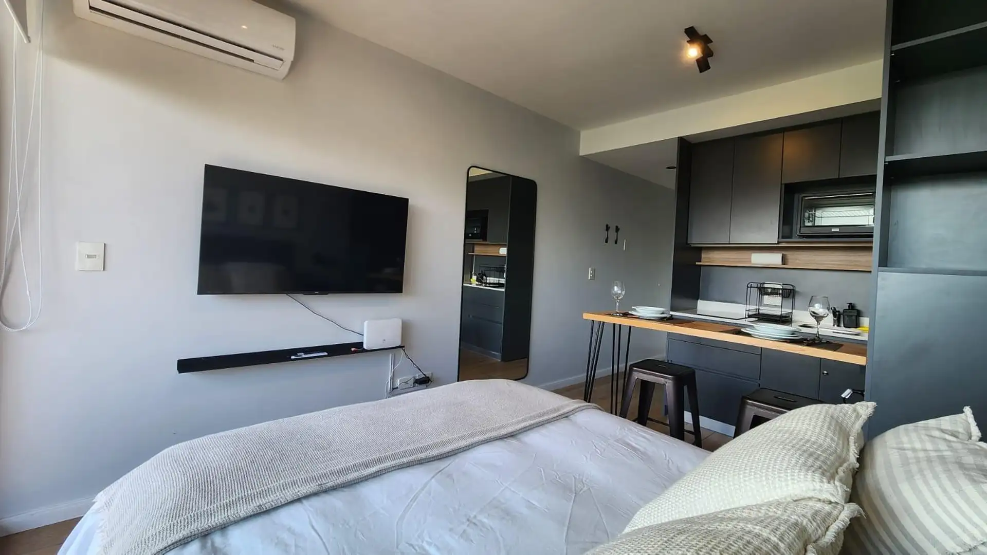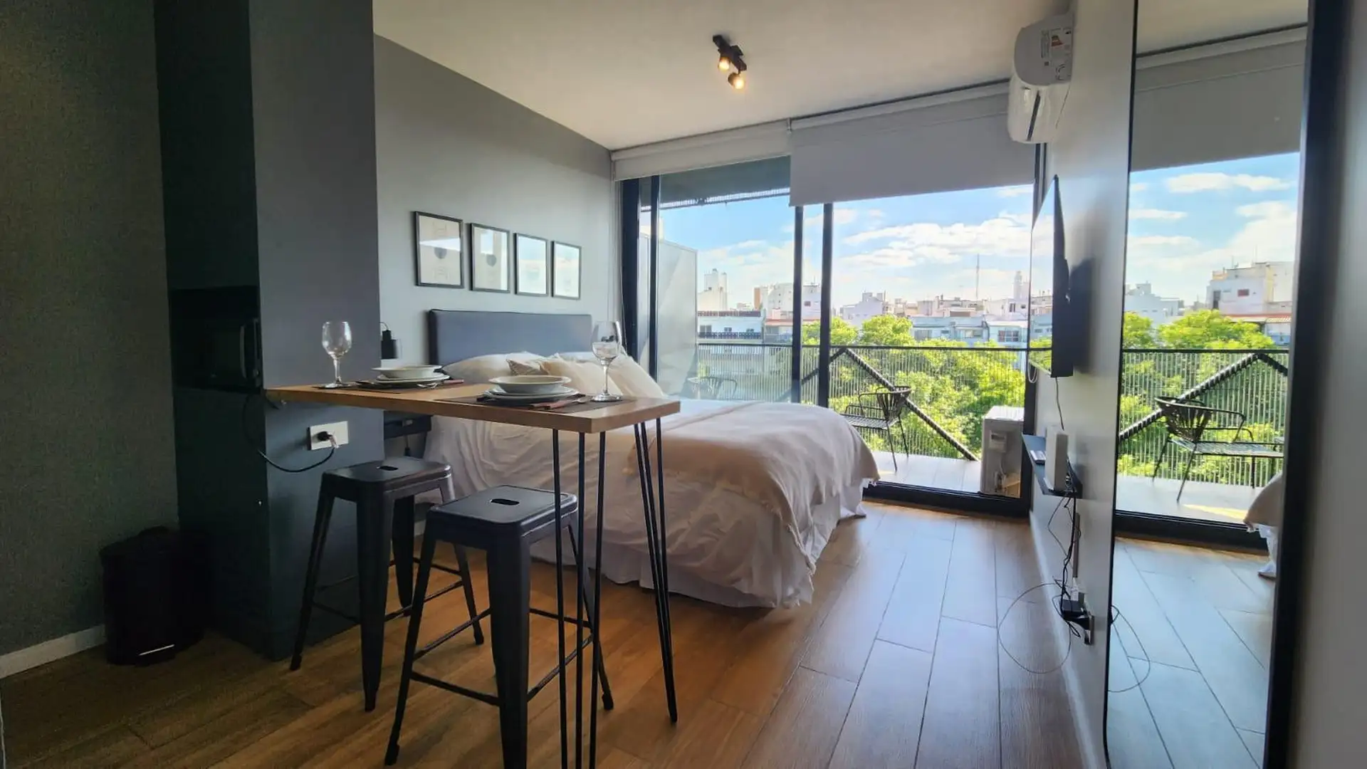 Departamento monoambiente de 24 m² totales, 23 m² cubiertos y 3 m² semi-cubiertos, con balcón corrido y vista abierta al parque. Cocina integrada con mesada de cuarzo, anafe eléctrico, horno eléctrico y heladera; baño completo con mampara de vidrio templado y ducha con nicho. Cuenta con aire acondicionado y piso símil madera; el edificio dispone de laundry, piscina con solárium en terraza, spa con sauna seco, sauna húmedo y jacuzzi, sala de masajes, sector de coworking y gimnasio equipado.