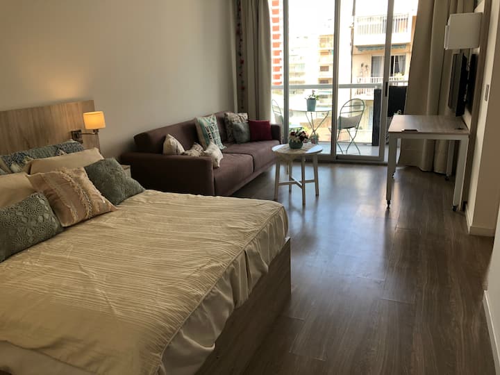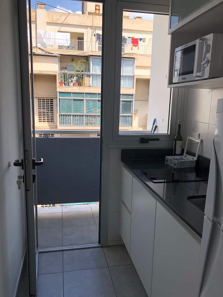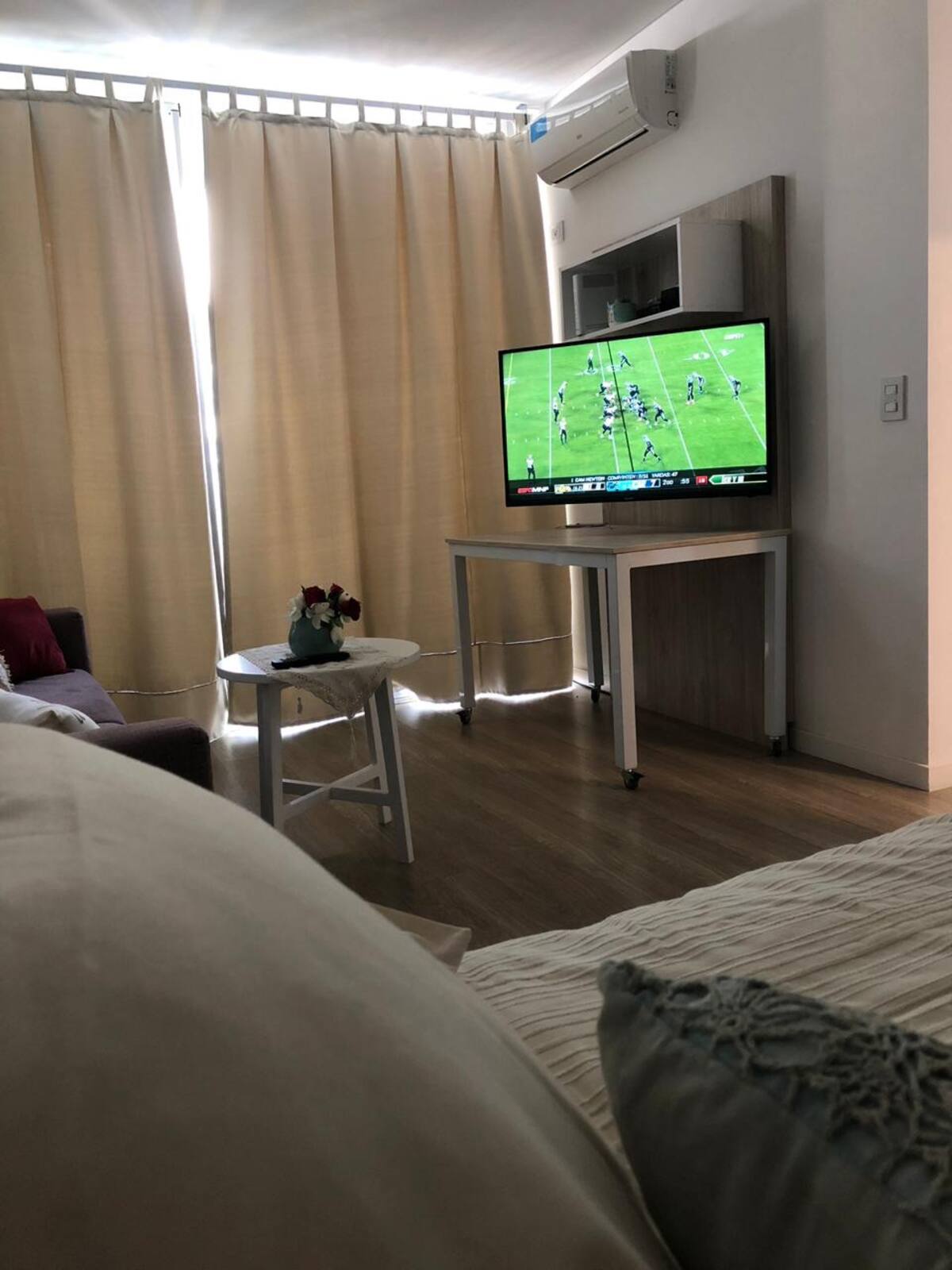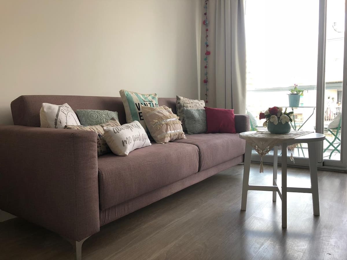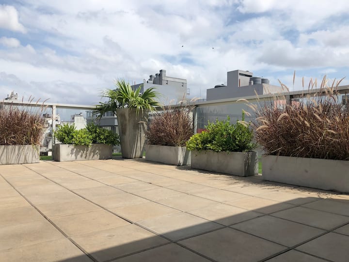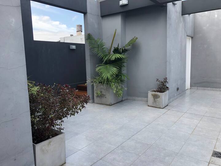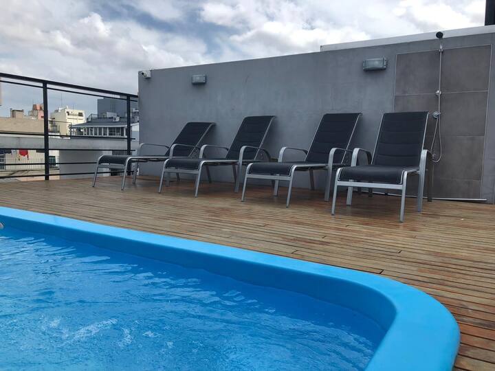 Departamento monoambiente con balcón, terraza y pileta en Villa Crespo. Totalmente equipado e incluye WiFi, servicio de TV y cocina con cocina eléctrica, tostadora. Cuenta con aire acondicionado frío/calor y cama doble con sillón cama. El edificio dispone de terraza con pileta y parrillas y un SUM; a 300 m de la estación Malabia (Subte Línea B).