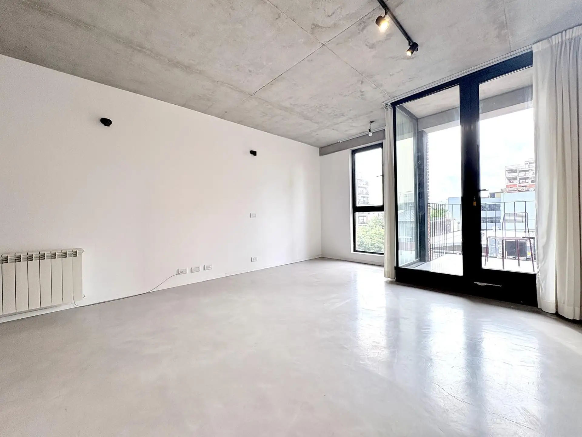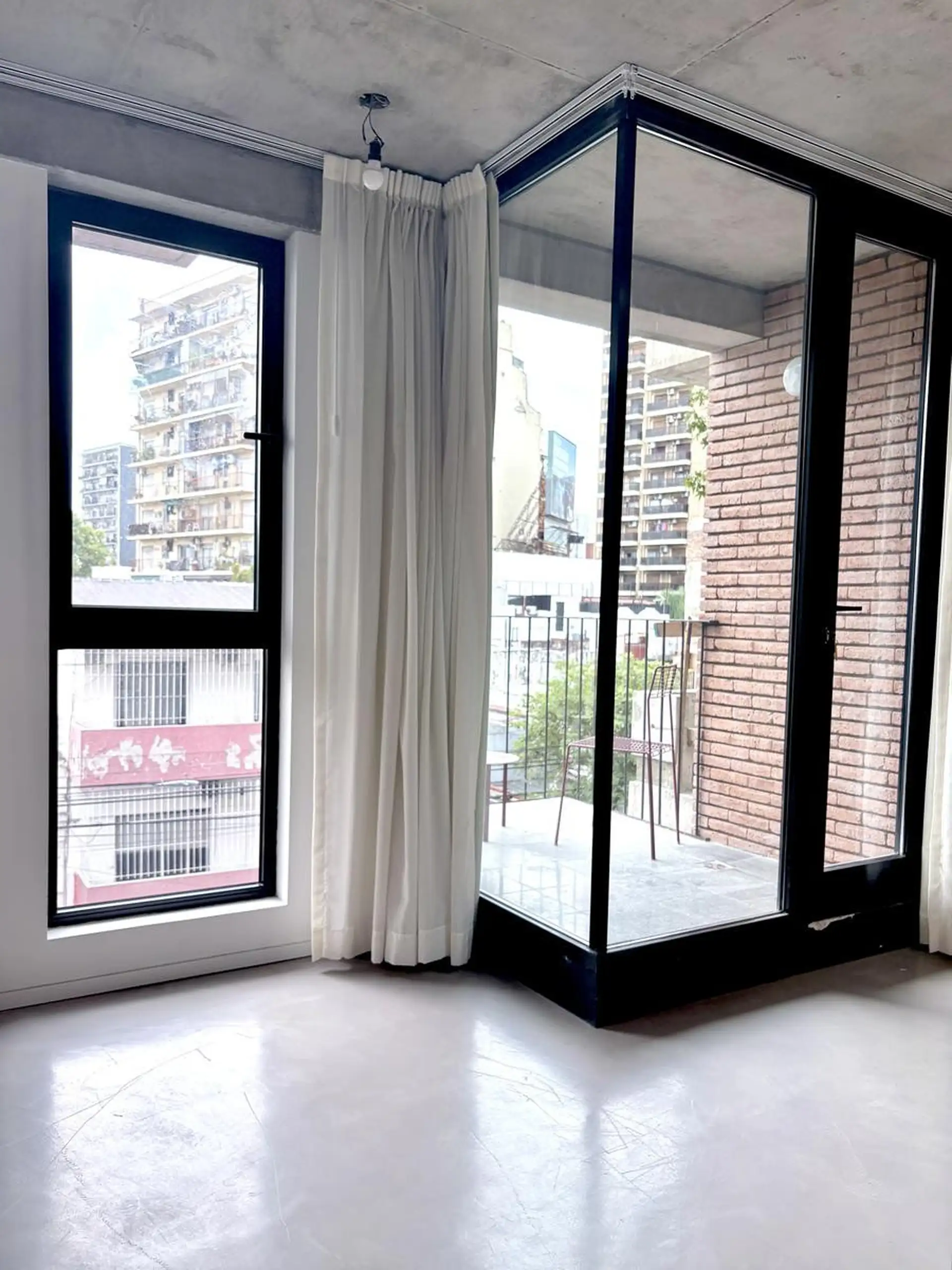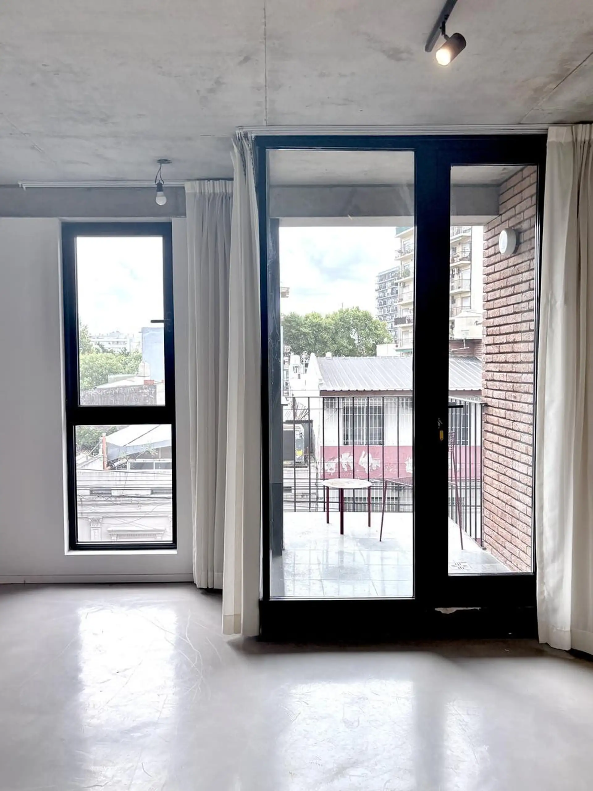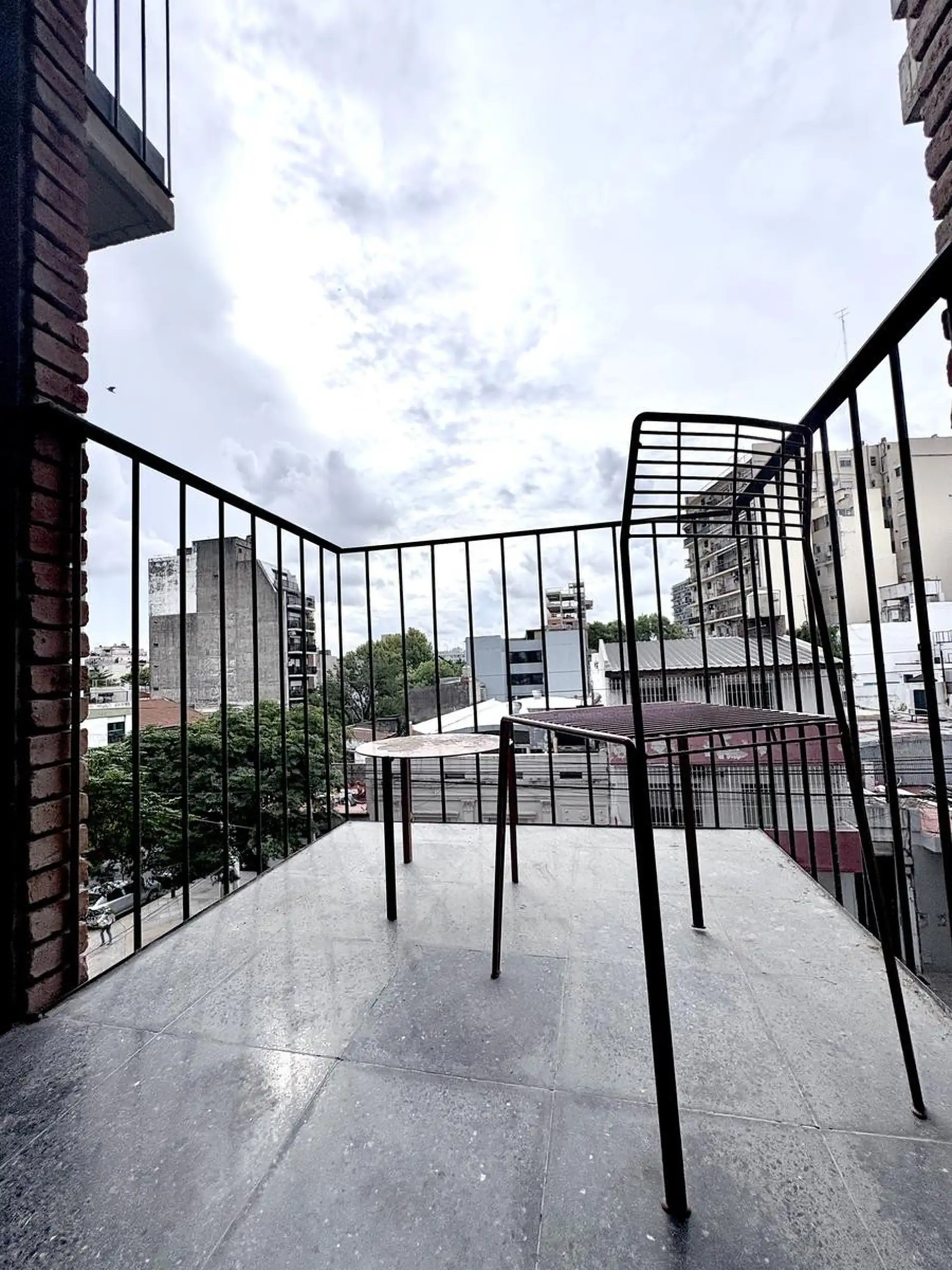Departamento monoambiente de 1 ambiente al frente, en 3era planta, en Villa Crespo. Unidad con balcón, carpinterías de aluminio DVH, pisos de microcemento y techos de hormigón visto; baño completo con conexión para lavarropas, aire acondicionado y agua caliente central. Calefacción central por radiadores, ventilaciones cruzadas, cortinas y black out con simil gasa, y algunas luminarias. El edificio fue finalizado en diciembre de 2024 y cuenta con jardín y terraza general; el acceso es digital me