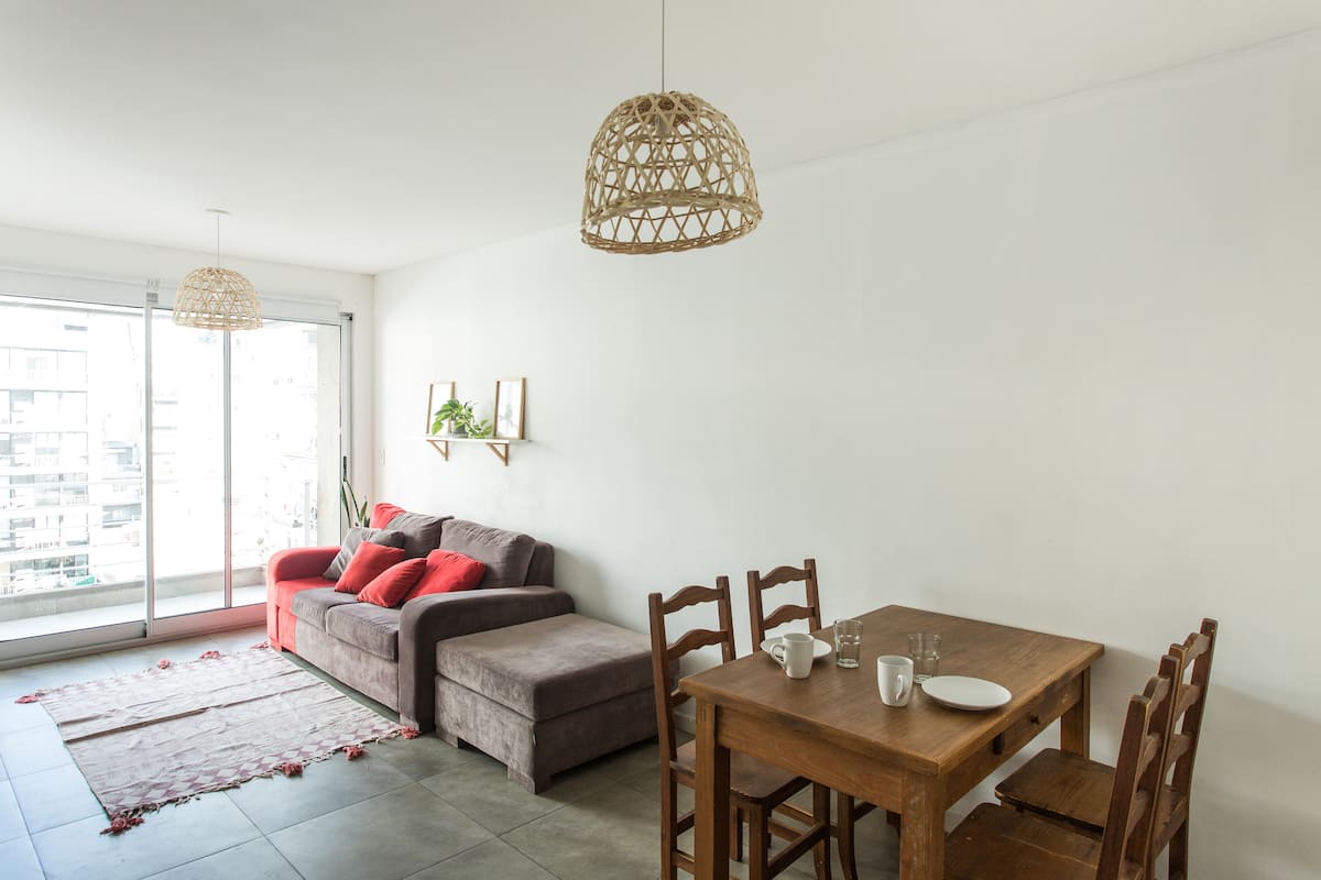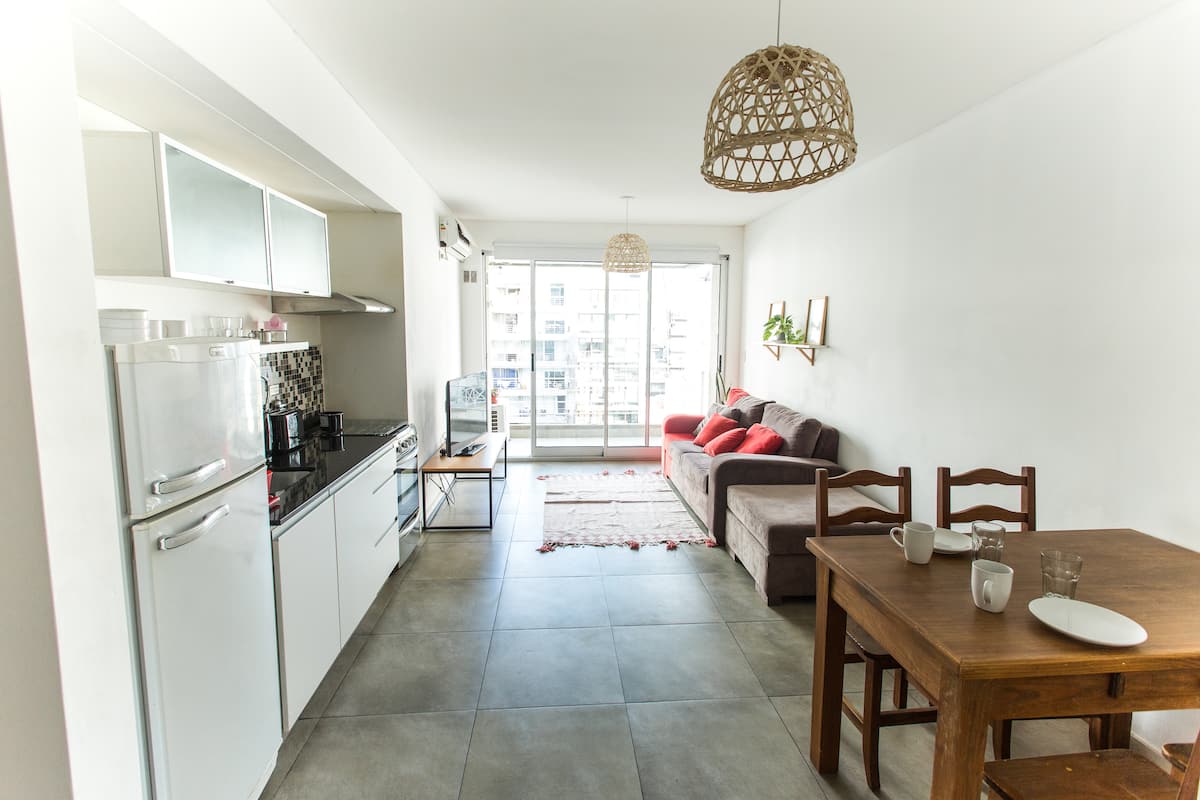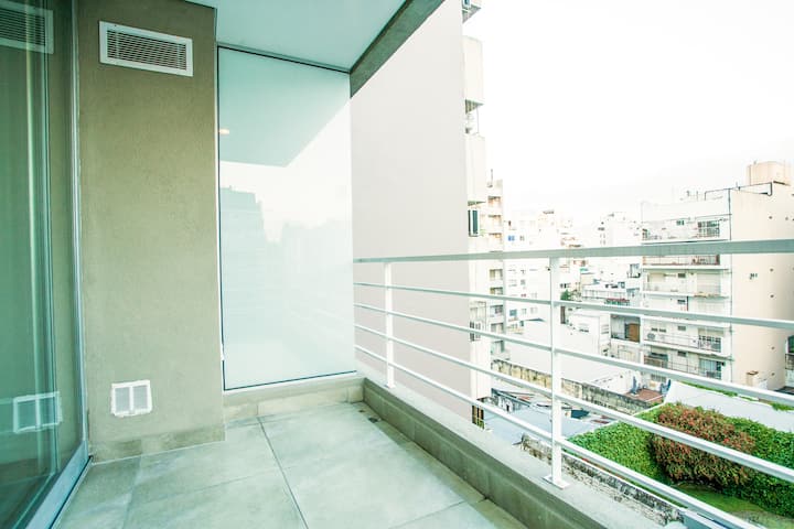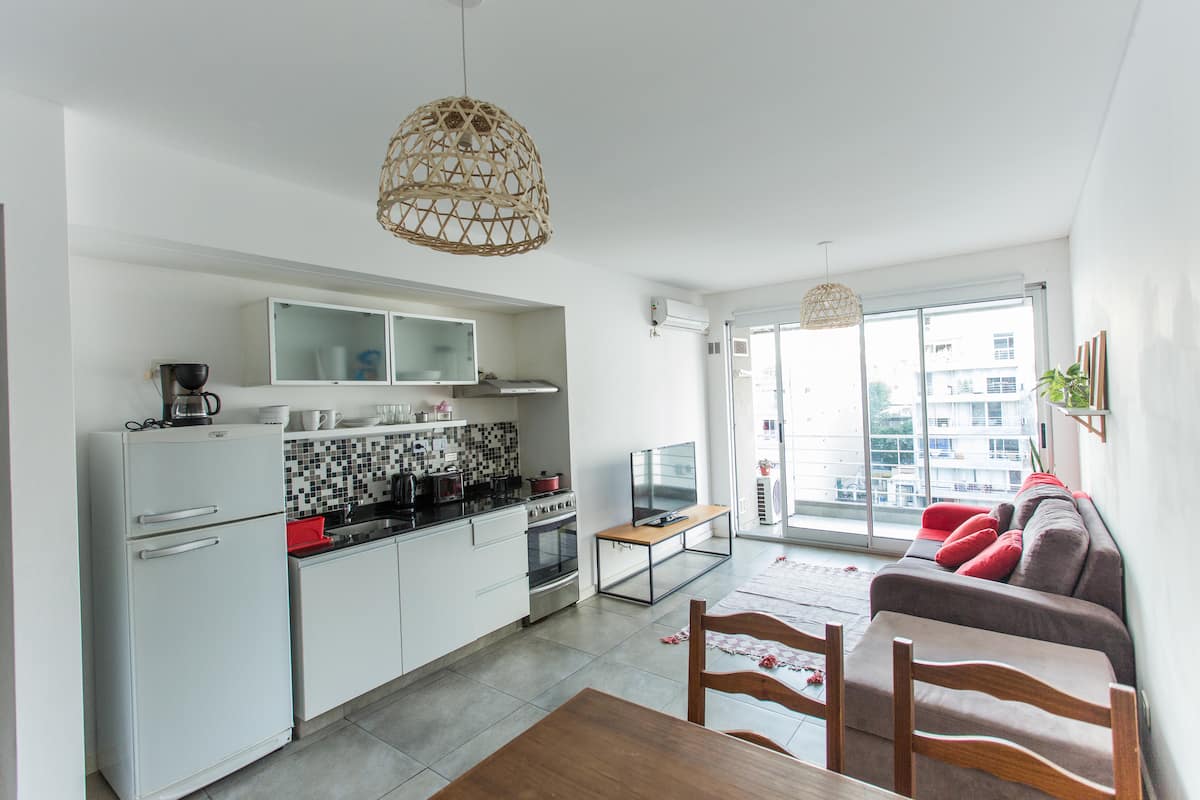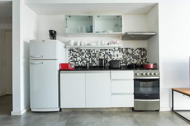 Departamento monoambiente de 43 m² en Villa Crespo, en un solo ambiente con placard, cocina integrada y baño completo con bañera. Incluye aire acondicionado frío/calor, TV compatible con Chromecast y Wi-Fi de alta velocidad. Cuenta con balcón y heladera con freezer, microondas, cocina, cafetera, tostadora y pava eléctrica, además de vajilla y ollas. El edificio tiene ascensor, laundry y terraza con parrilla.