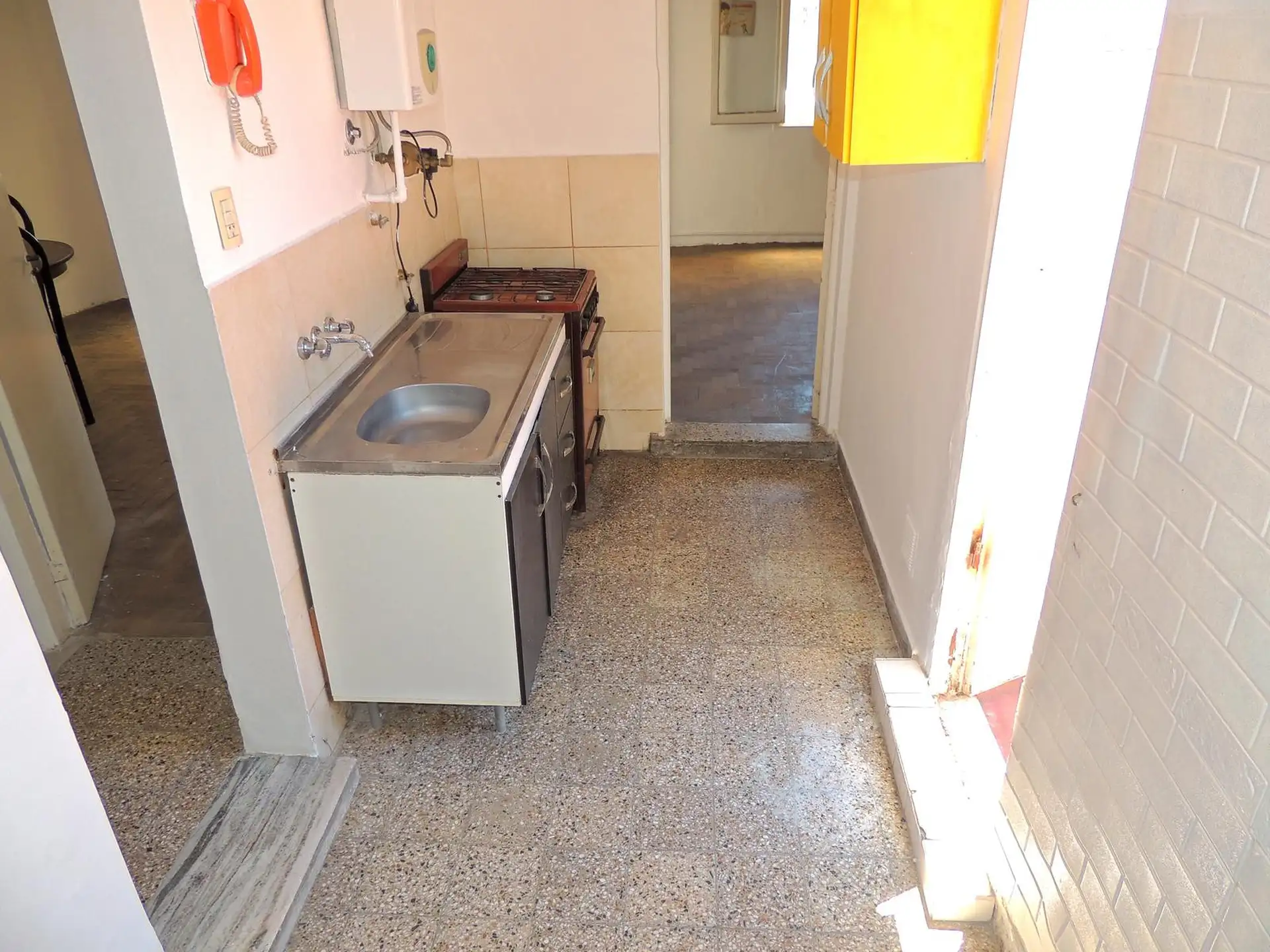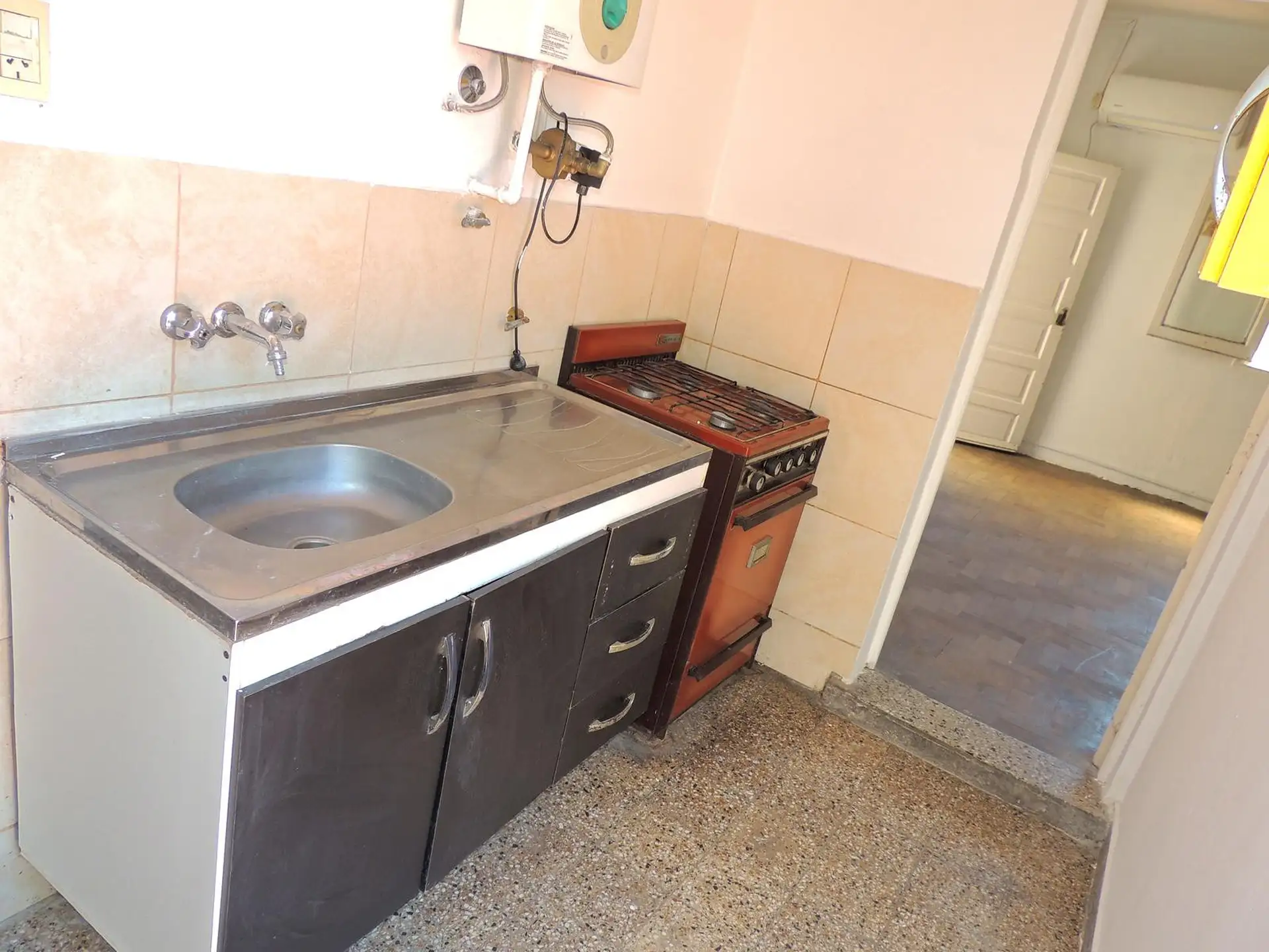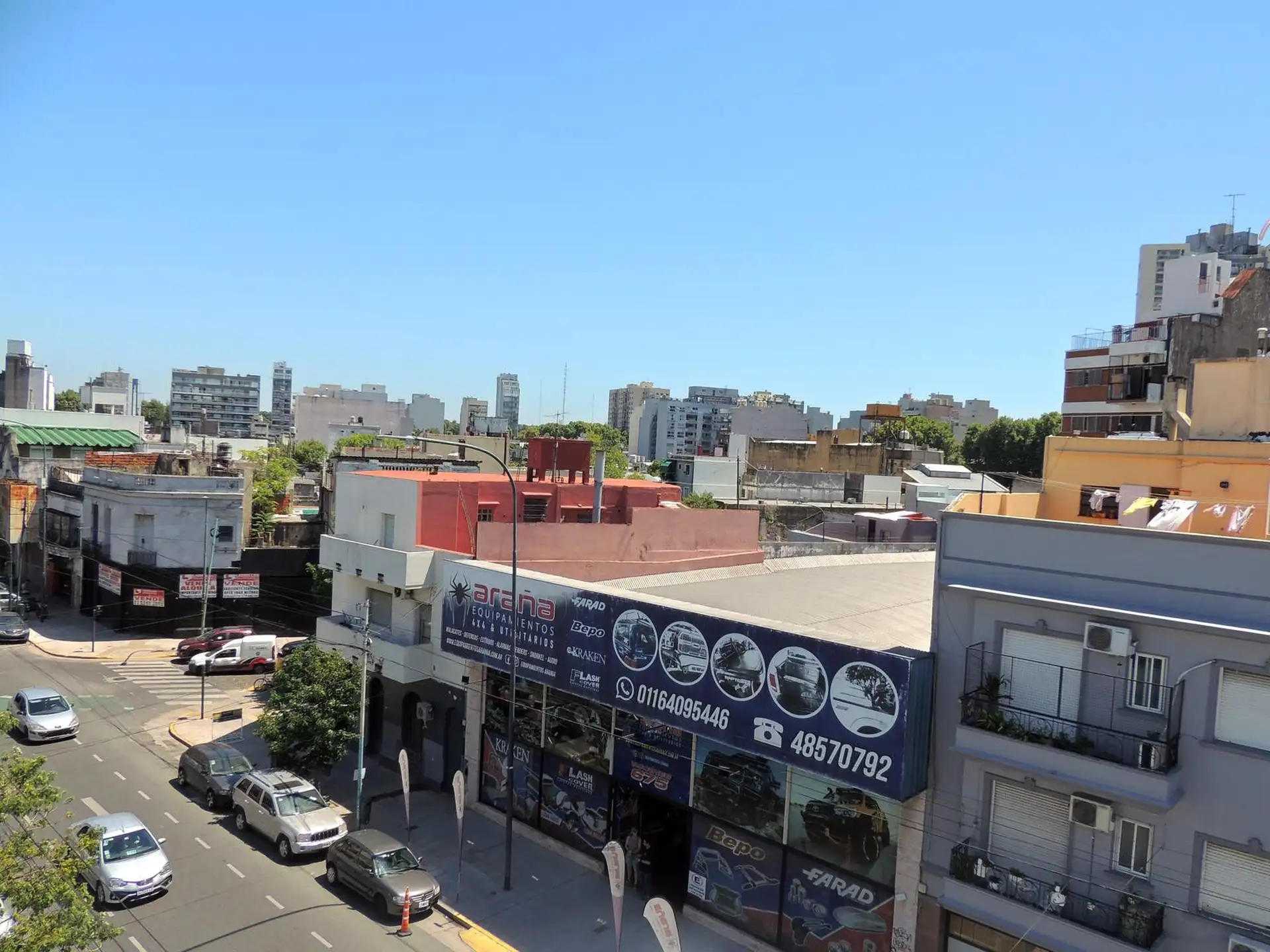 Departamento de 2 ambientes al frente en Villa Crespo, sobre Av. Warnes. Se encuentra en un tercer piso por escalera e incluye living-comedor de 4.10 x 3.80 con estufa a gas y ventana al balcón, y habitación de 4.60 x 3.90 con dos placares y aire acondicionado frío-calor, con ventana y acceso al balcón. Cocina independiente de 4.00 x 1.60 con artefacto a gas y calefón con bomba presurizadora, baño con ducha de pie (sin bidet). Tiene balcón al frente de 1.40 x 6.60 con sector techado de 2 x 2 y t