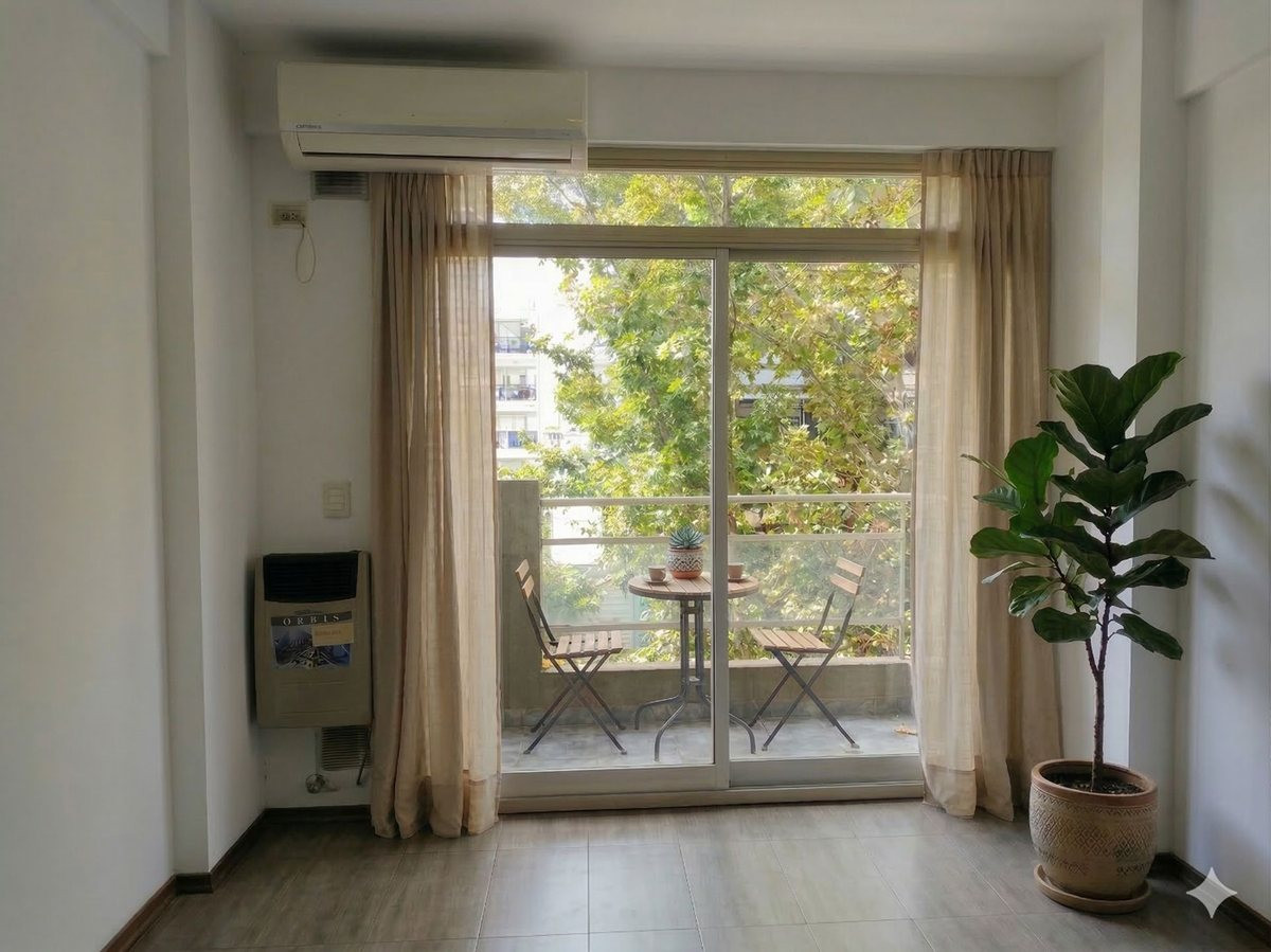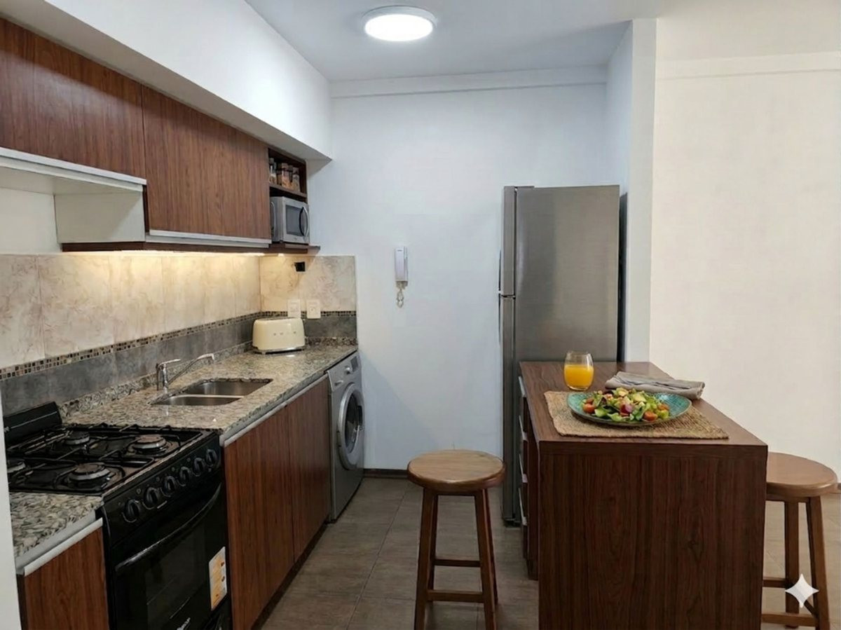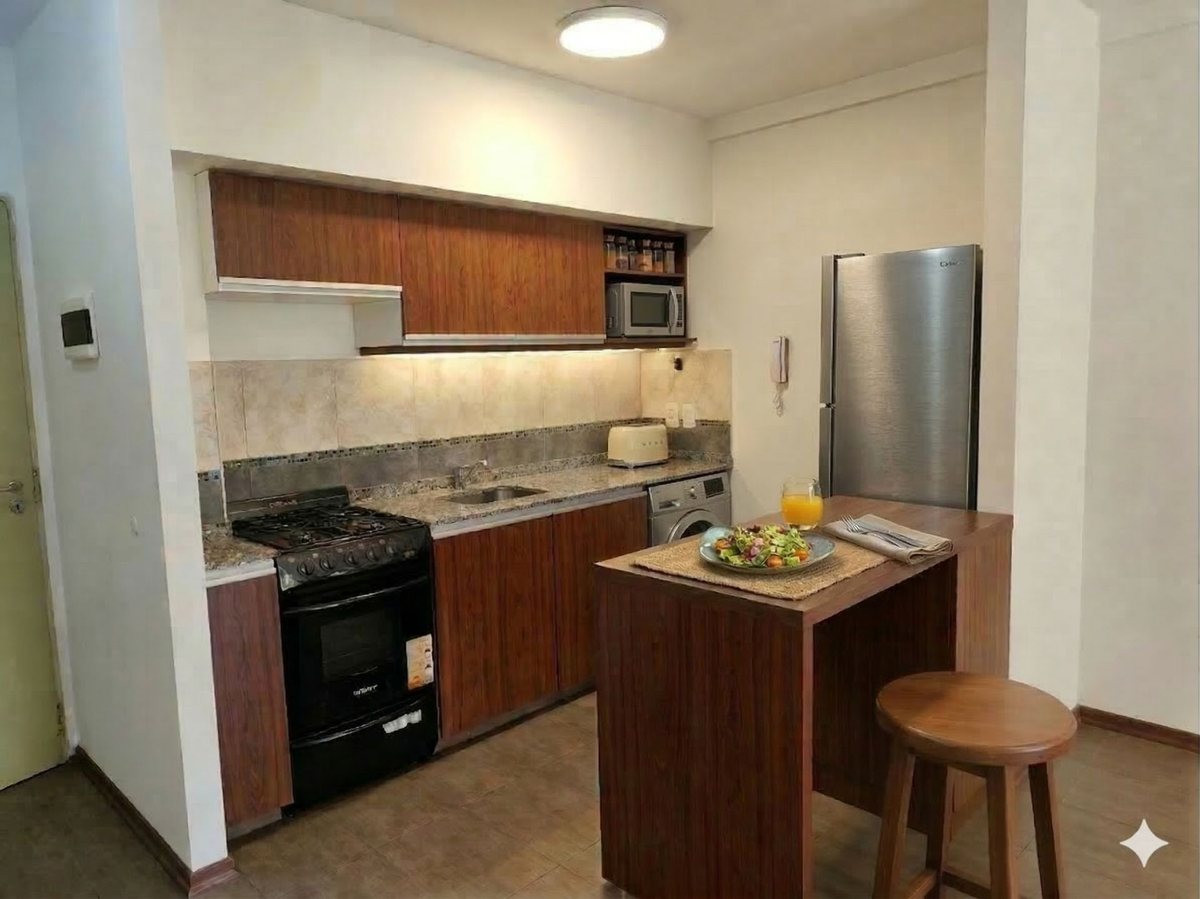 Departamento monoambiente de 31 m² totales, al frente, en 5to piso, orientación Este. Cuenta con balcón de 2 m², cocina con muebles bajo mesada y alacena, mesadas de granito, bacha de acero inoxidable y cocina marca Eskabe, placard con frente integral y baño con inodoro, bidet, bañadera y vanitory, grifería marca FV. Dispone de 1 equipo de aire acondicionado frío/calor, calefacción por estufa a gas de tiro balanceado Orbis y agua caliente central; espacio y conexión para lavarropas. En el 10mo p