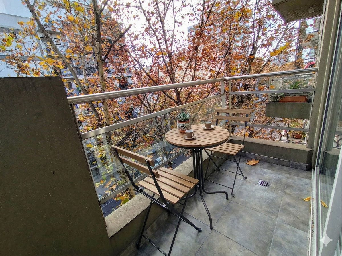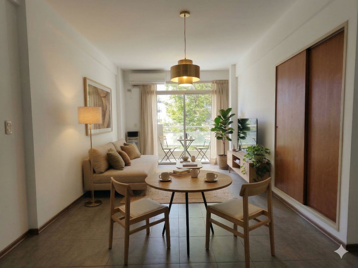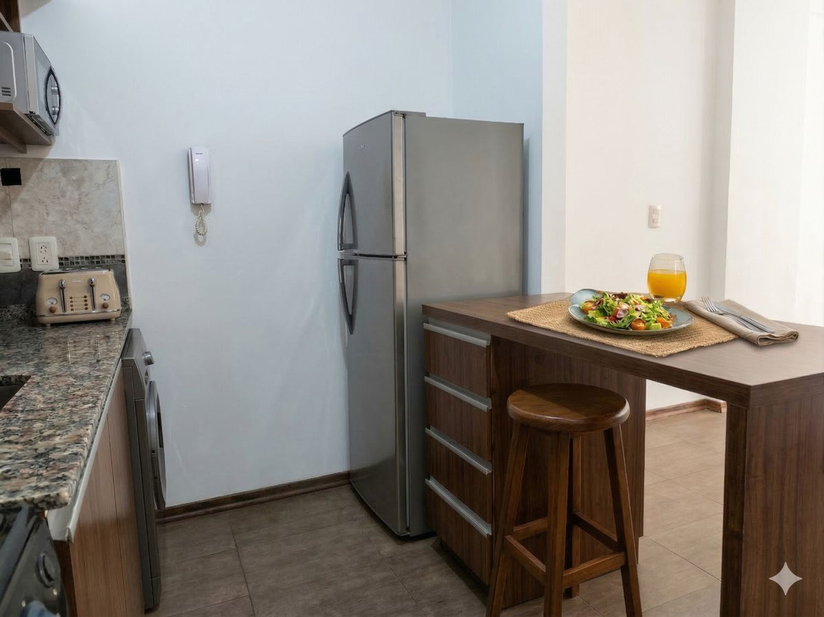 Departamento monoambiente de 31 m² totales, al frente, en 5to piso, orientación Este. Cuenta con balcón de 2 m², cocina con muebles bajo mesada y alacena, mesadas de granito, bacha de acero inoxidable y cocina marca Eskabe, placard con frente integral y baño con inodoro, bidet, bañadera y vanitory, grifería marca FV. Dispone de 1 equipo de aire acondicionado frío/calor, calefacción por estufa a gas de tiro balanceado Orbis y agua caliente central; espacio y conexión para lavarropas. En el 10mo p