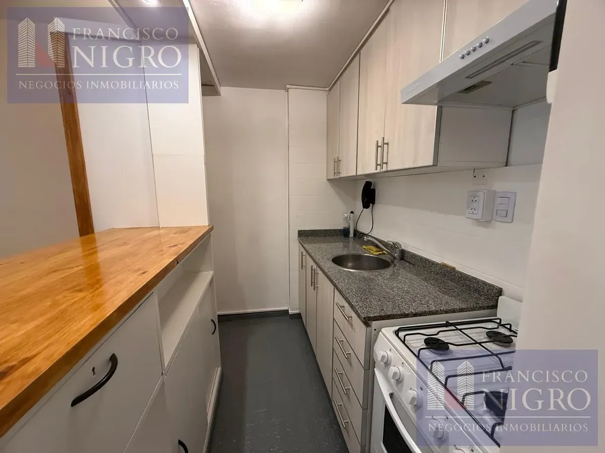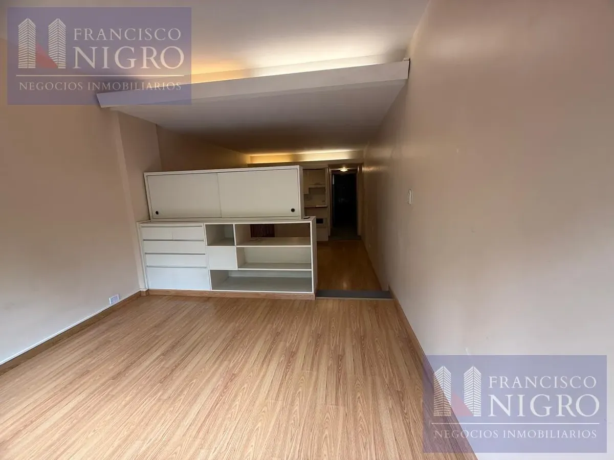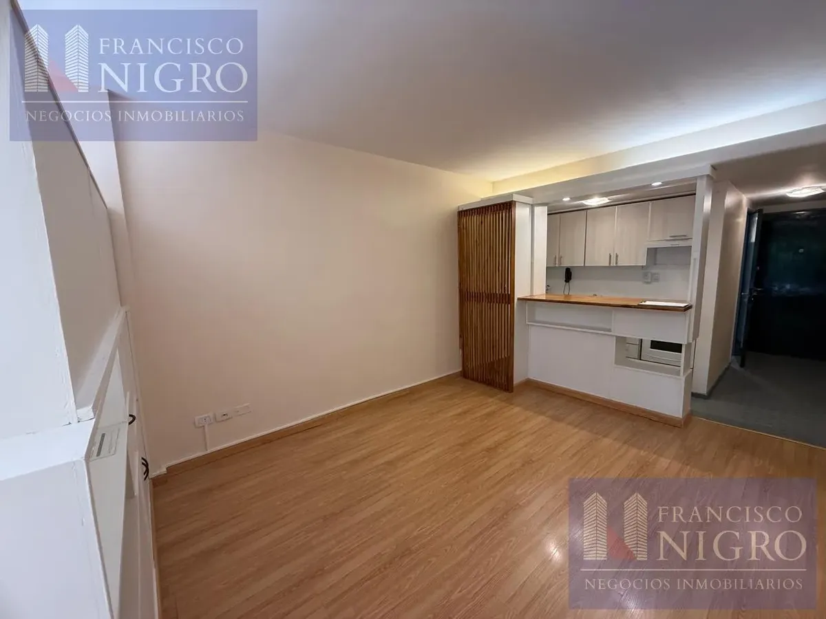 Departamento de 2 ambientes con dormitorio de 2,77m x 3,28m con piso flotante y salida a balcón de 1,34m x 1,89m. Cuenta con hall de entrada de 1,00m x 3,61m y sector living de 3,30m x 3,70m, baño completo de 2,00m x 1,76m y cocina de 2,42m x 1,27m con agua caliente por termotanque eléctrico y barra desayunadora. Expensas: $115.000. Requiere contrato a 2 años con actualización trimestral por IPC, mes de adelanto más depósito en billete dólar estadounidense, ingresos comprobables y garantía con s
