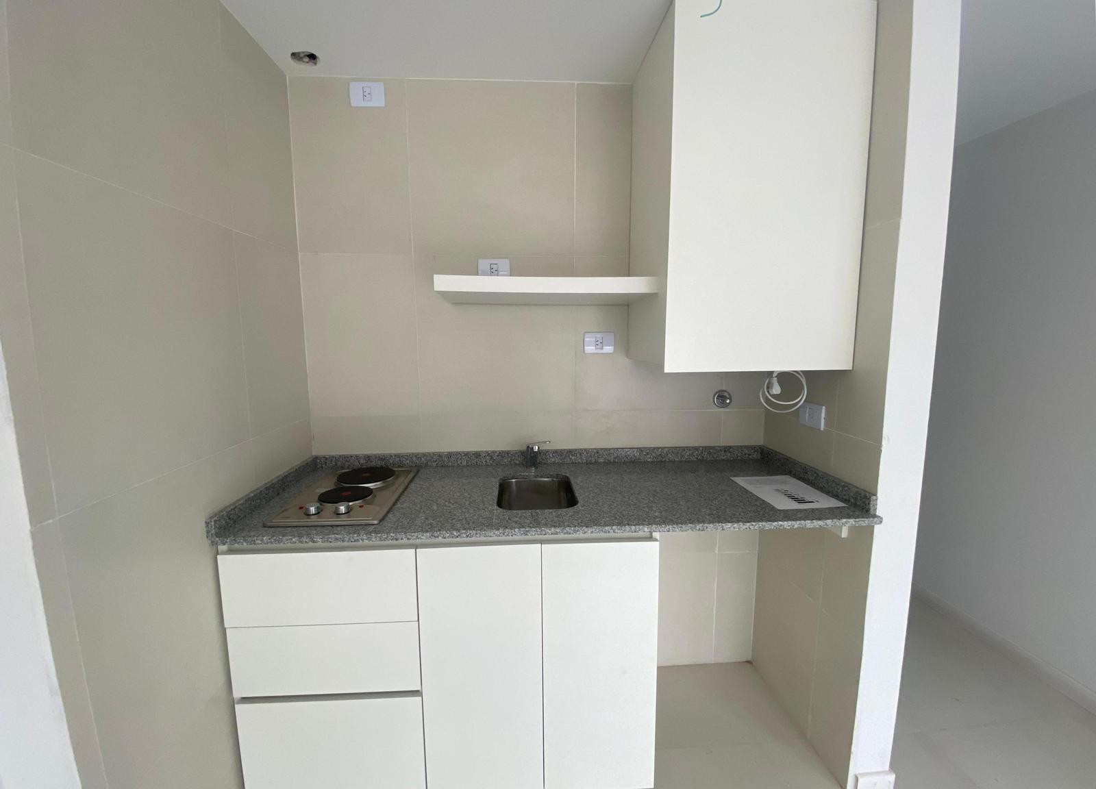 Departamento de 1 ambiente de 39 m² en un edificio Colonial Tower, con patio. Cocina integrada con muebles bajo mesada. Baño con ducha y baulera.