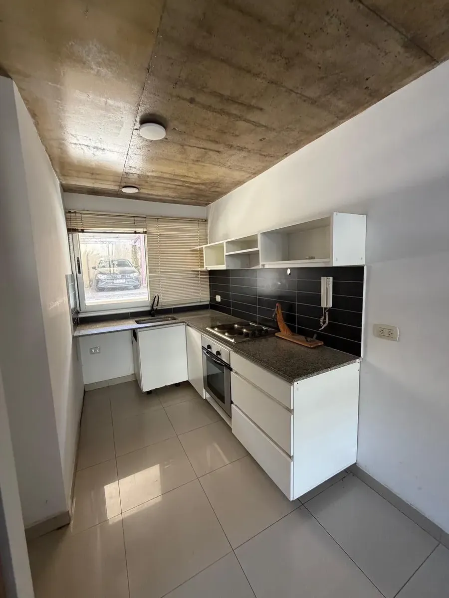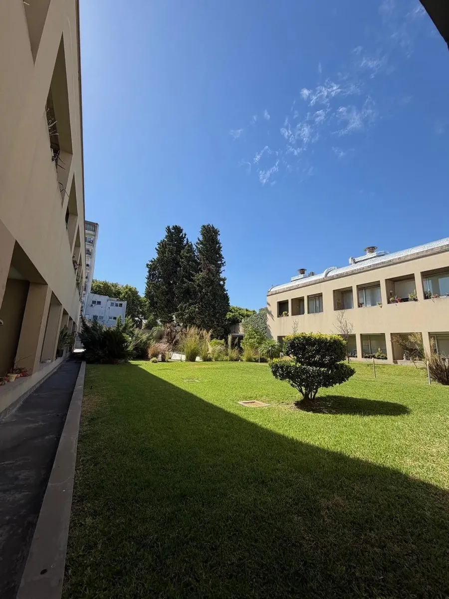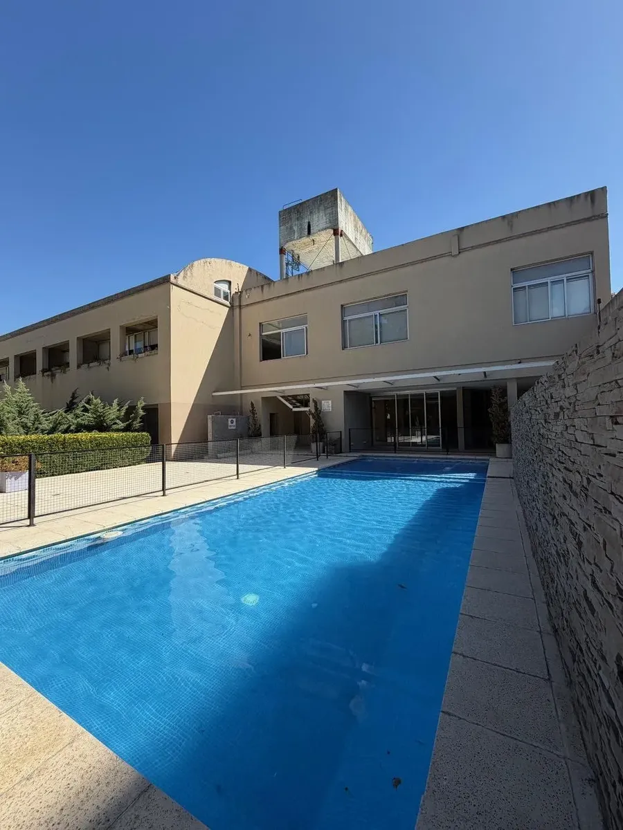 Departamento de 2 ambientes en dúplex, desarrollado en dos plantas y ubicado en planta baja. Incluye living comedor con salida a balcón corrido alargado, cocina independiente con espacio para comedor diario, conexión para lavarropas bajo mesada y toilette de recepción. En la planta superior cuenta con dormitorio, placard de piso a techo y baño en suite completo con ducha y mueble empotrado. Se alquila pintado con pintura blanca e incluye cochera fija. El edificio tiene parque central, piscina, p