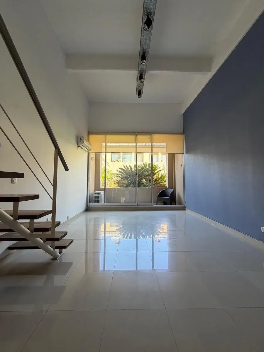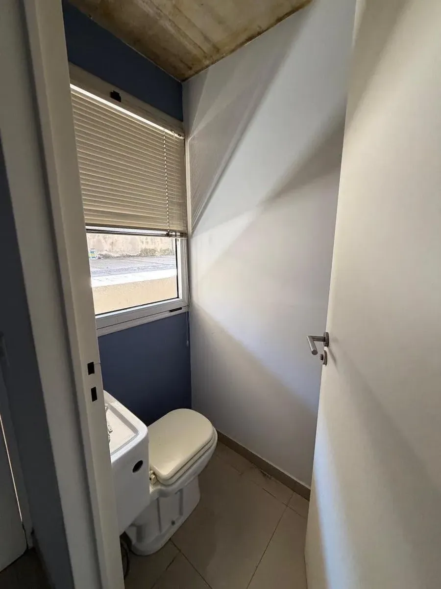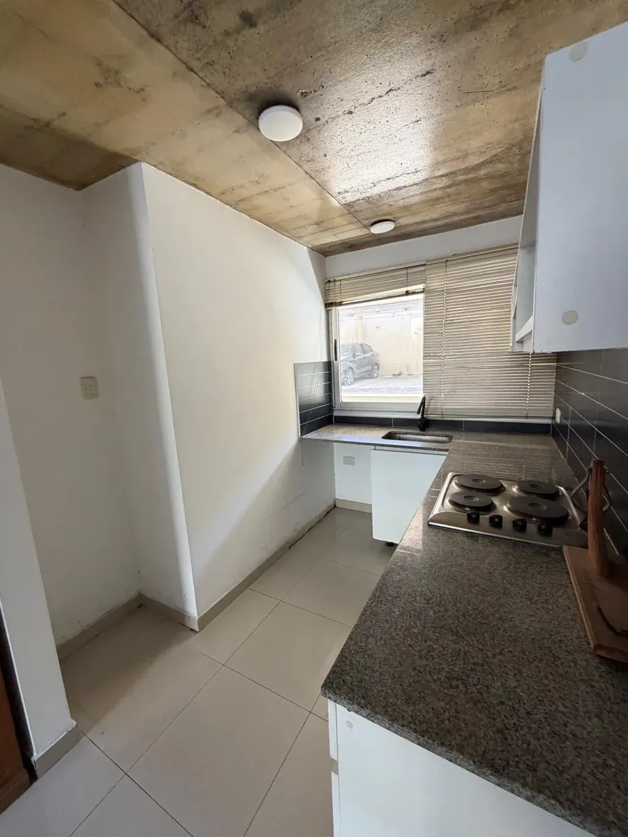 Departamento de 2 ambientes en dúplex, desarrollado en dos plantas y ubicado en planta baja. Incluye living comedor con salida a balcón corrido alargado, cocina independiente con espacio para comedor diario, conexión para lavarropas bajo mesada y toilette de recepción. En la planta superior cuenta con dormitorio, placard de piso a techo y baño en suite completo con ducha y mueble empotrado. Se alquila pintado con pintura blanca e incluye cochera fija. El edificio tiene parque central, piscina, p