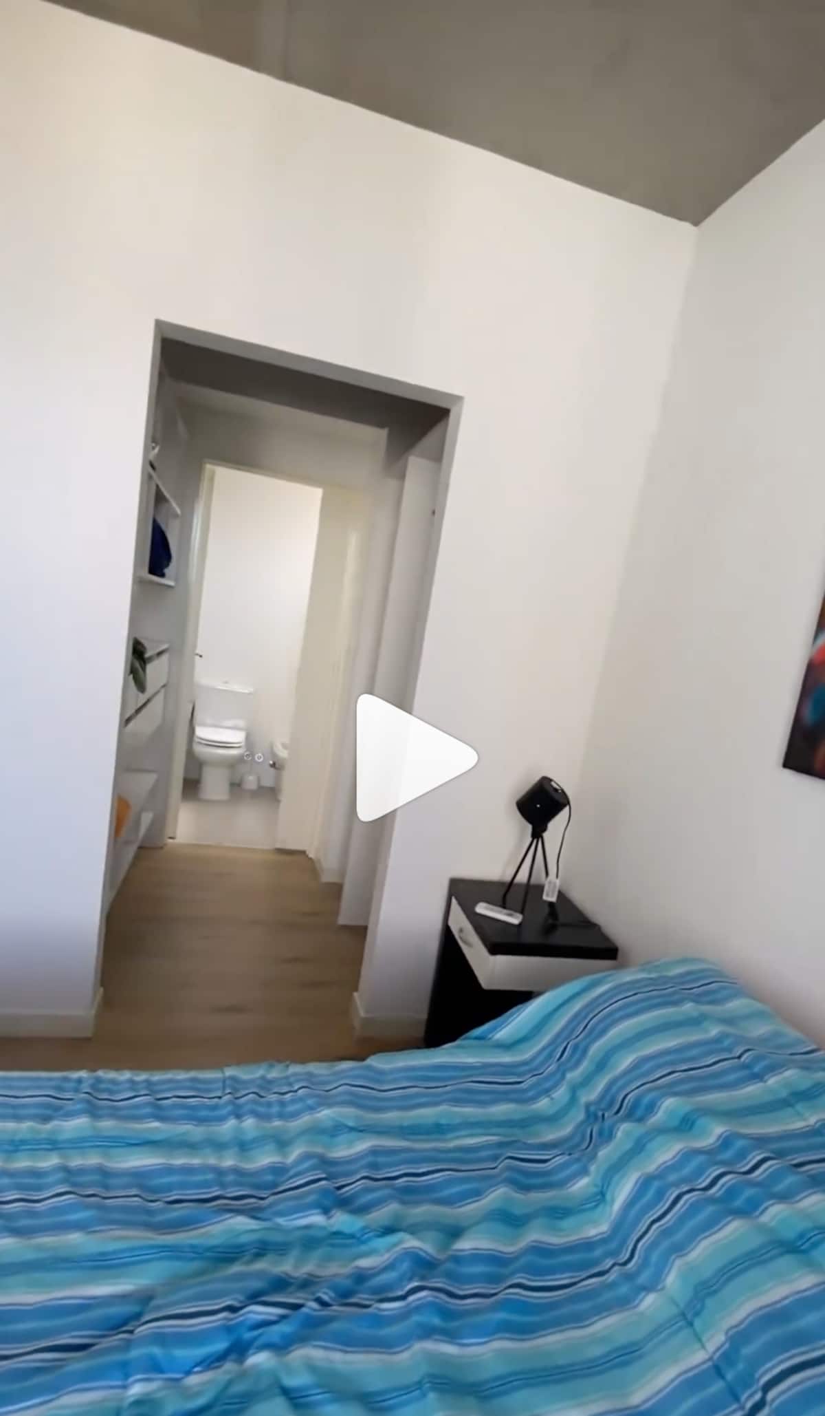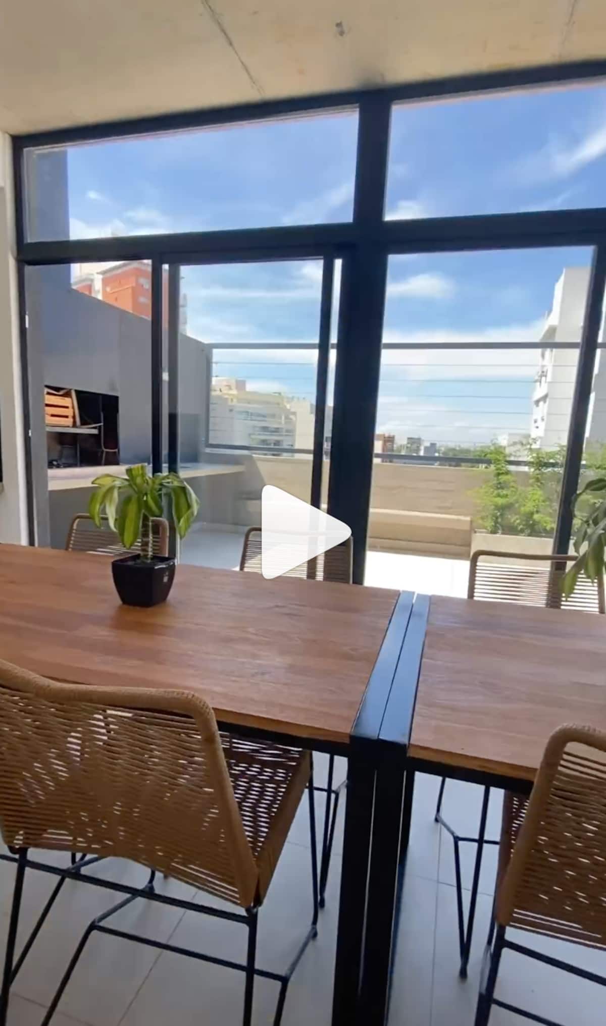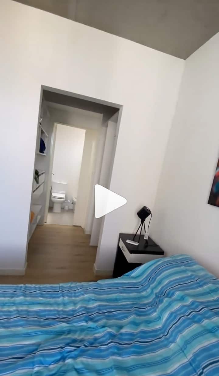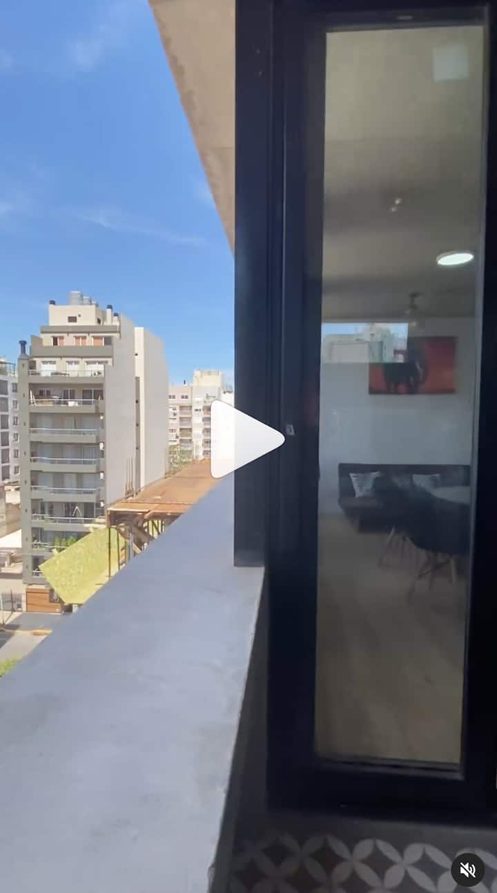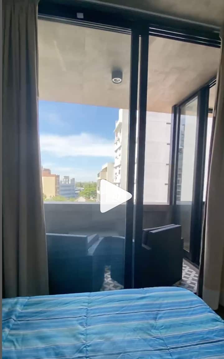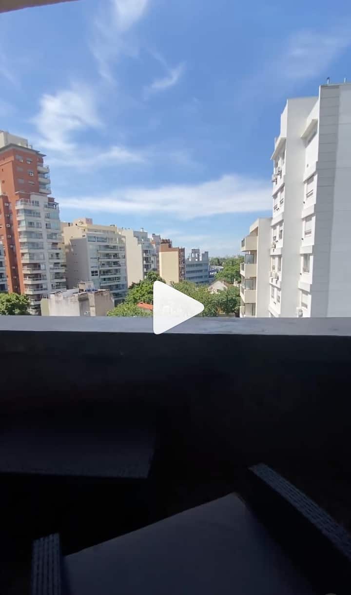 Departamento de 2 ambientes con vistas, amoblado. Piso alto en Buenos Aires, con dormitorio con baño en suite, vestidor y balcón cubierto; living con sofá cama y comedor integrado con cocina. Cuenta con aire acondicionado en ambos ambientes, un toilette y salida al balcón; tiene TV, lavarropas, microondas, cafetera y pava eléctrica. El edificio dispone de SUM con parrilla y solárium, además de WiFi y cable; no se permite fumar en el interior.