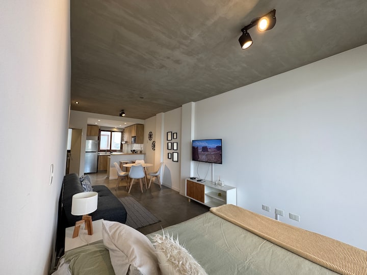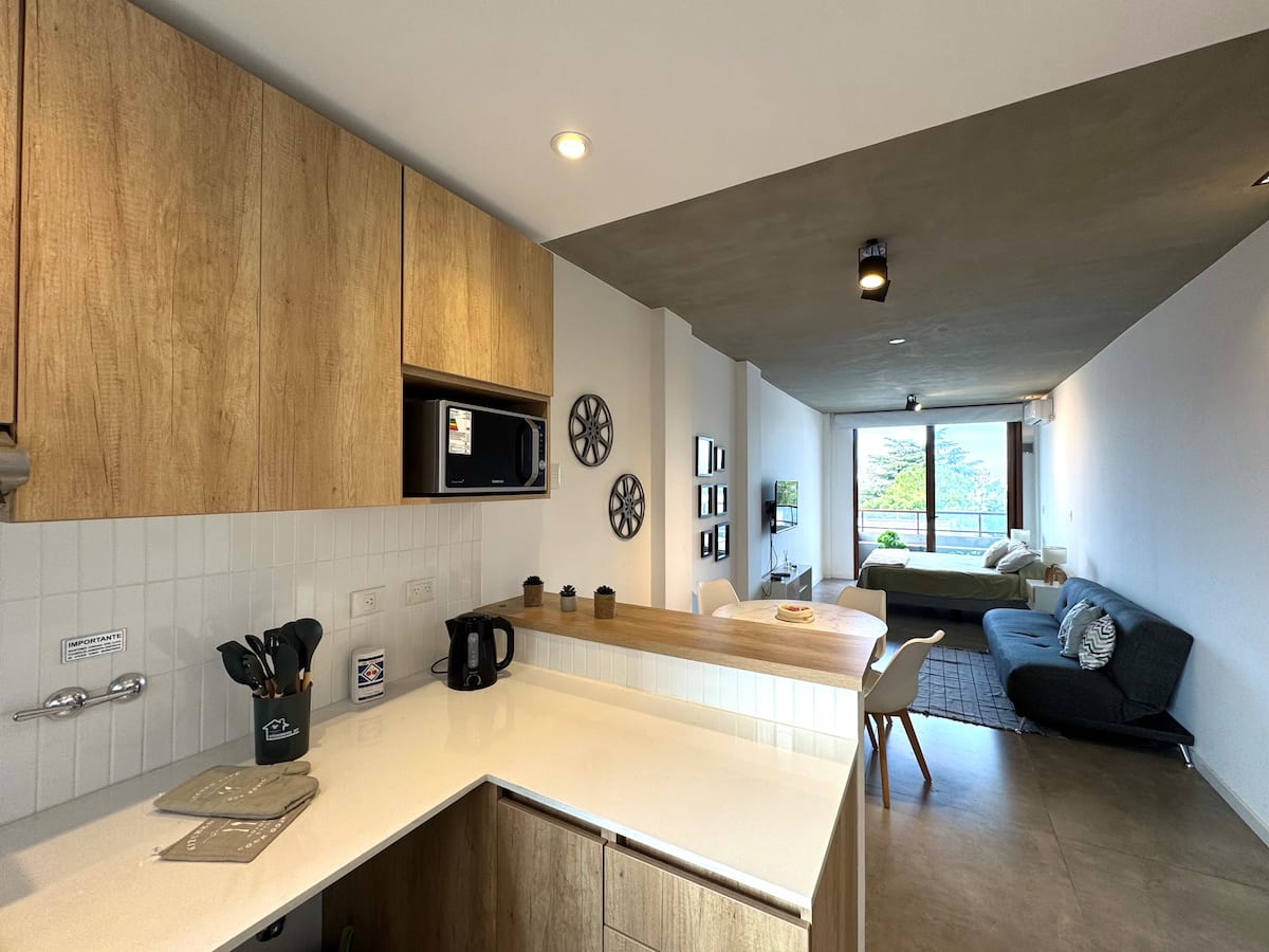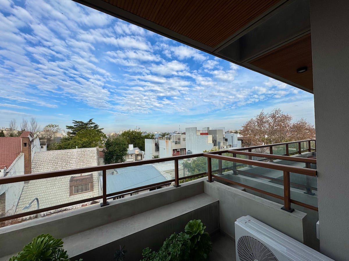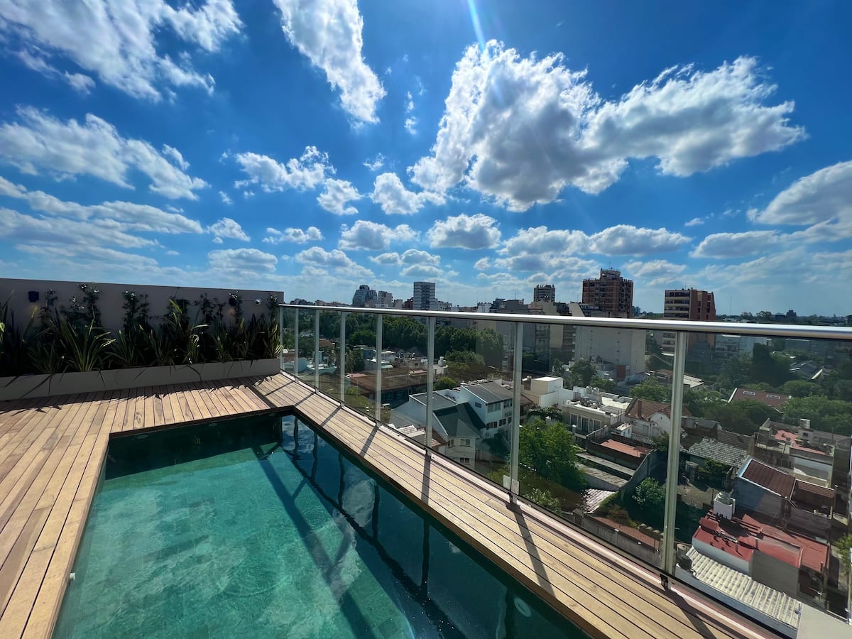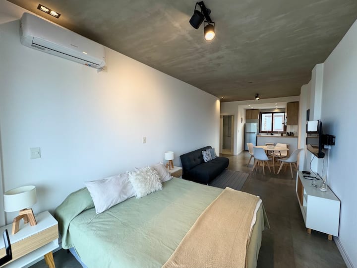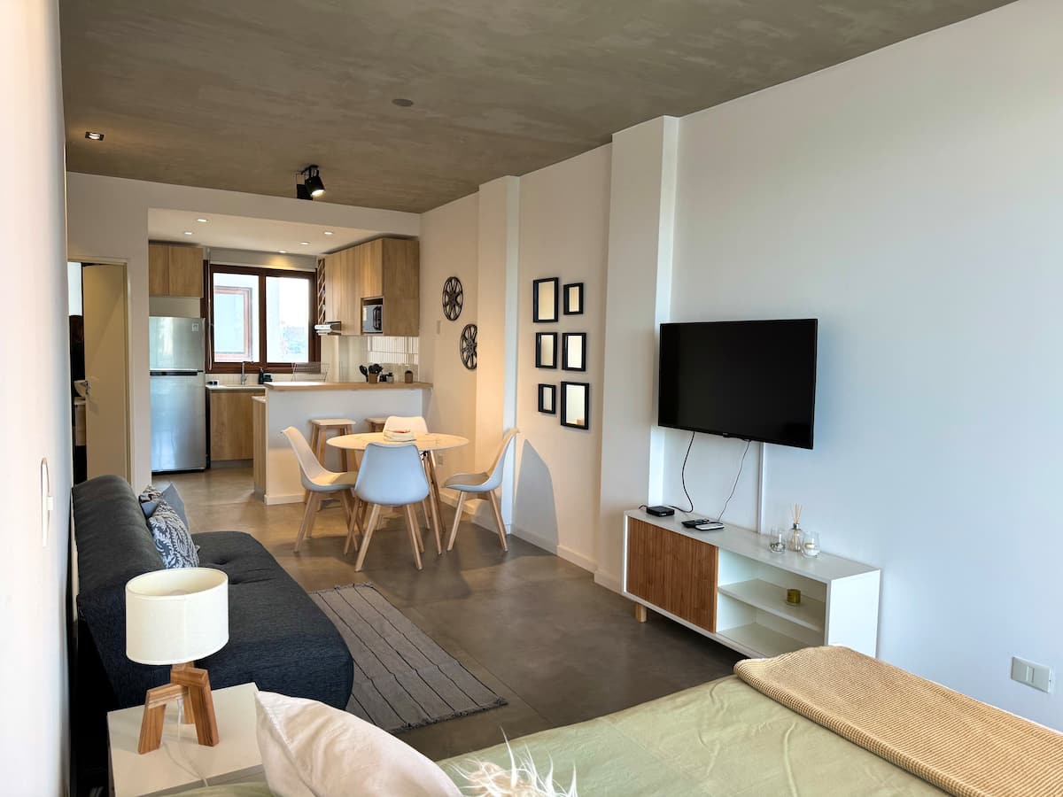 Departamento monoambiente de edificio nuevo en Villa Devoto, con balcón y vista abierta. Cocina equipada con barra desayunadora, horno, heladera y pava eléctrica. Cuenta con cama queen (160x200 cm), sofá cama, TV Smart de 42”, WiFi, aire acondicionado frío/calor y placard. El edificio dispone de laundry, pileta y SUM; el SUM solo se ofrece para estancias de 2 semanas o más, con costo por turno de USD 50 y con reserva previa.