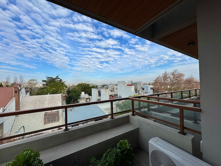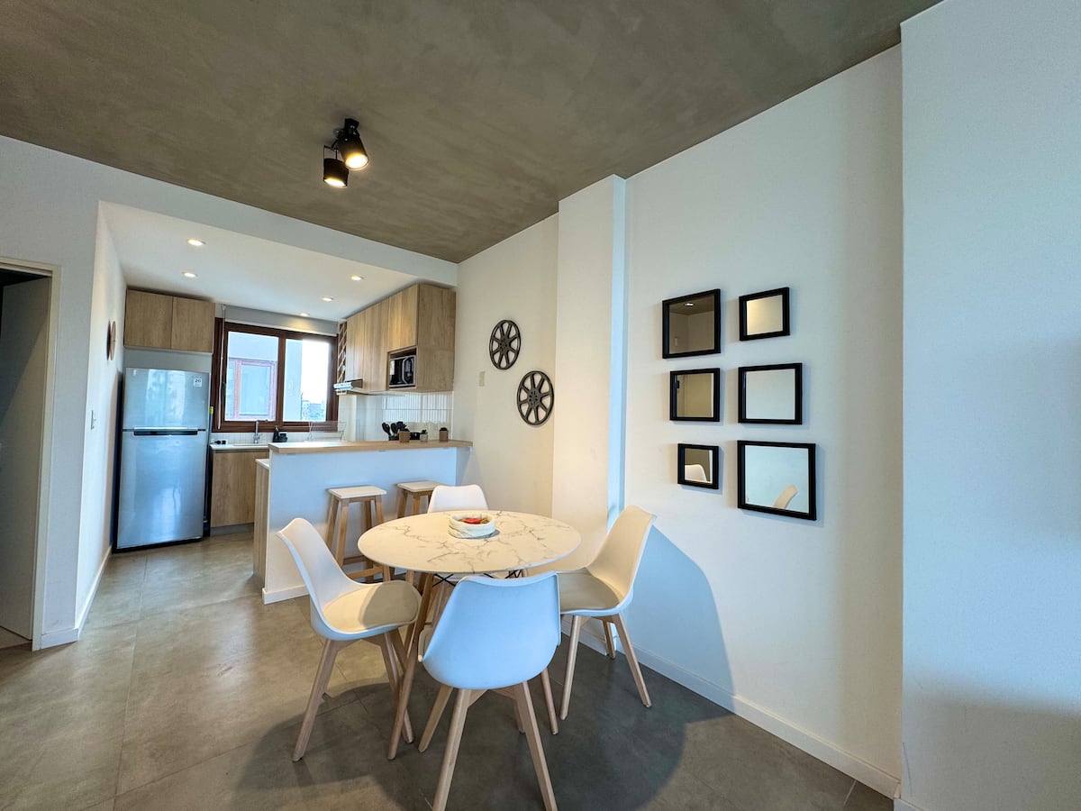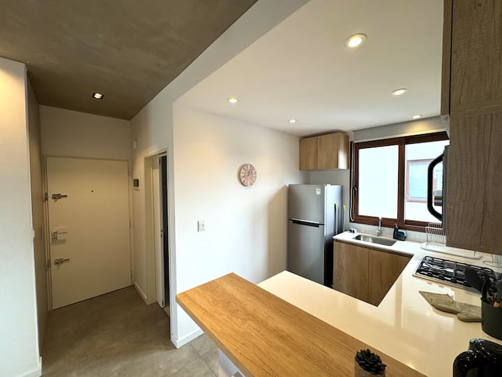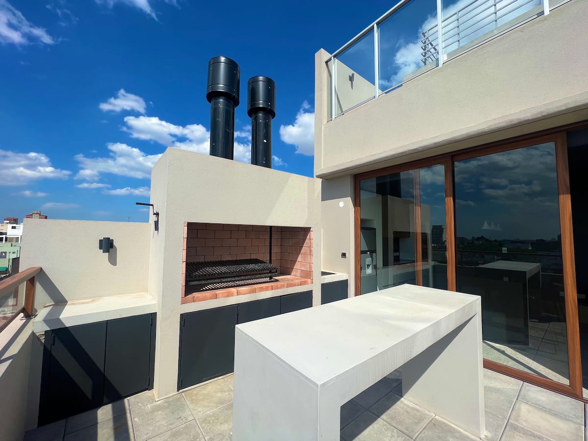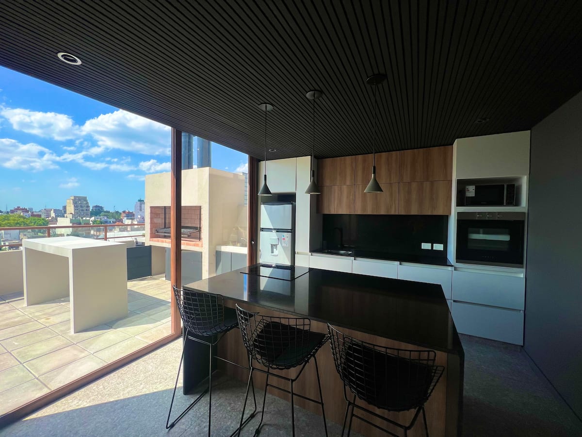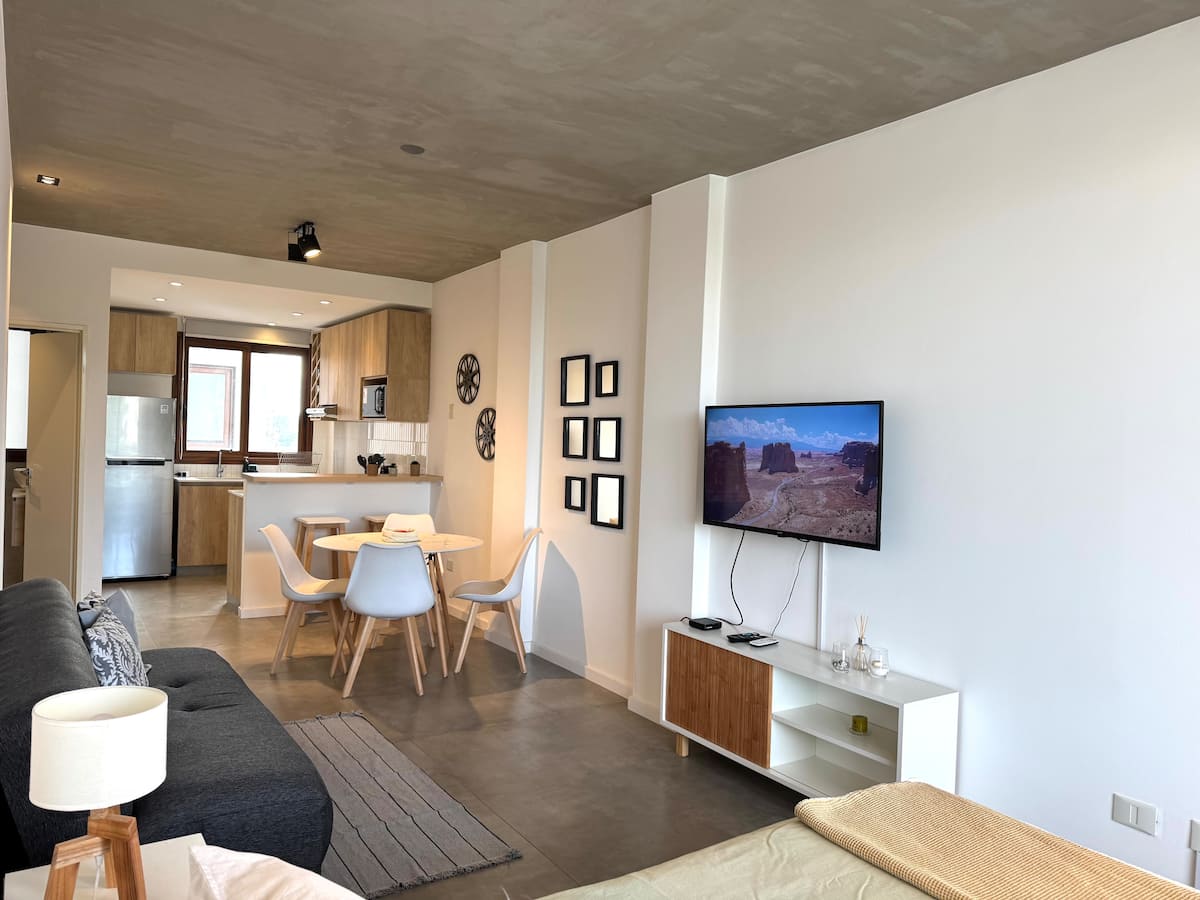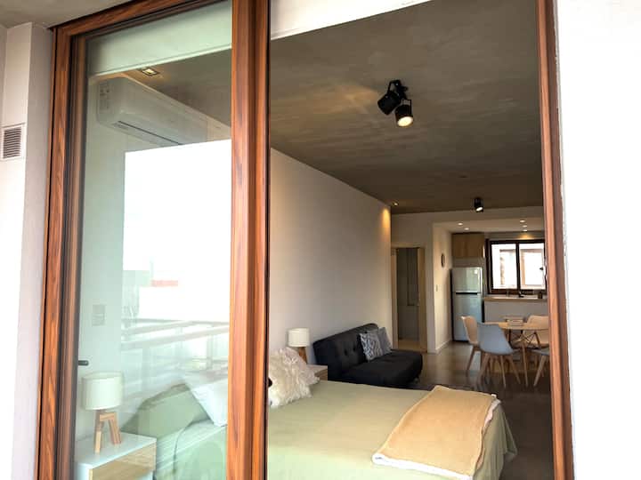 Departamento monoambiente de edificio nuevo en Villa Devoto, con balcón y vista abierta. Cocina equipada con barra desayunadora, horno, heladera y pava eléctrica. Cuenta con cama queen (160x200 cm), sofá cama, TV Smart de 42”, WiFi, aire acondicionado frío/calor y placard. El edificio dispone de laundry, pileta y SUM; el SUM solo se ofrece para estancias de 2 semanas o más, con costo por turno de USD 50 y con reserva previa.