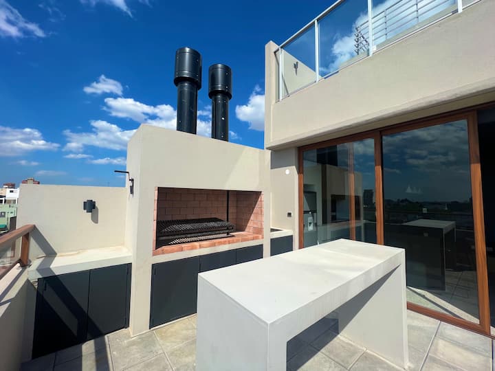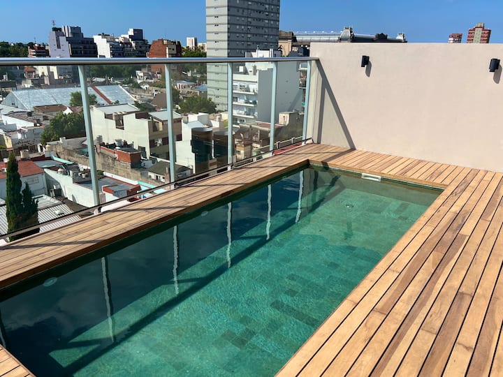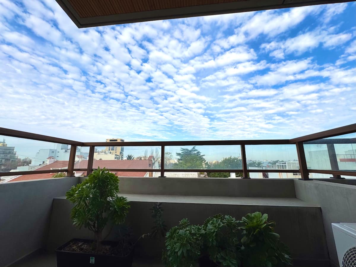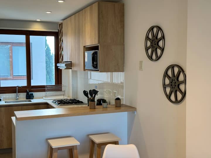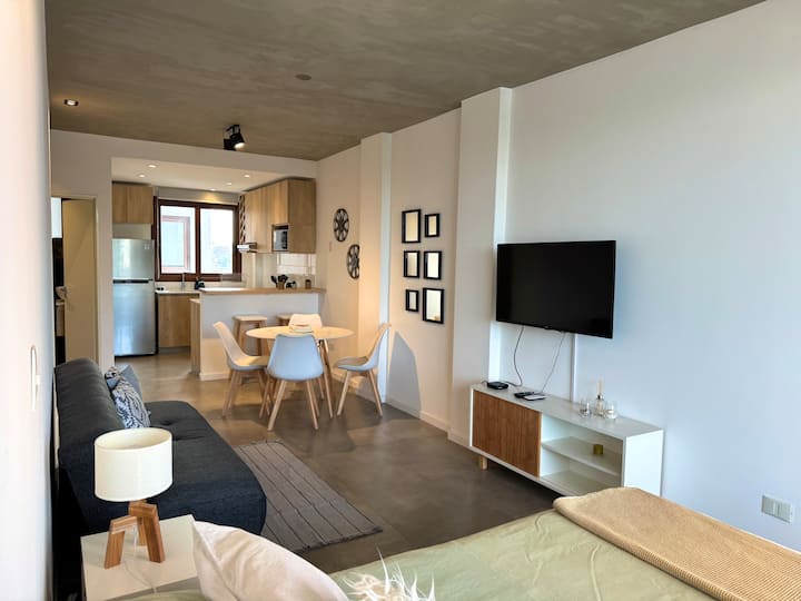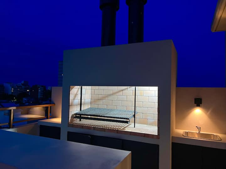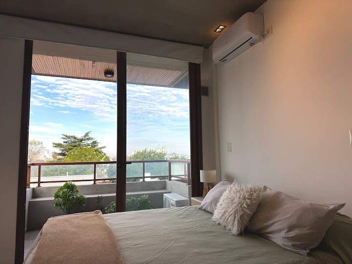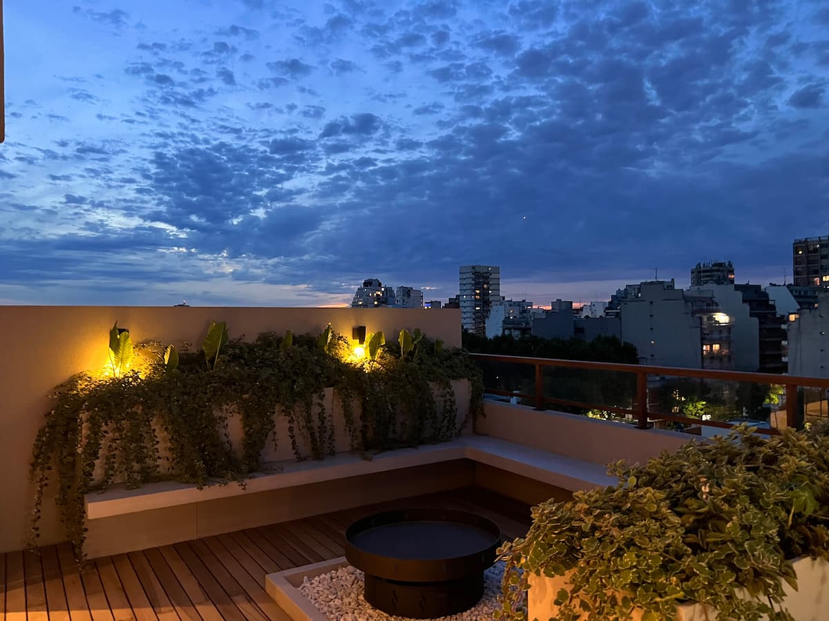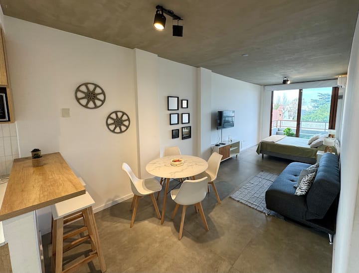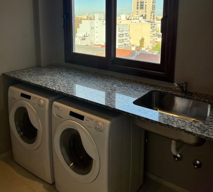 Departamento monoambiente de edificio nuevo en Villa Devoto, con balcón y vista abierta. Cocina equipada con barra desayunadora, horno, heladera y pava eléctrica. Cuenta con cama queen (160x200 cm), sofá cama, TV Smart de 42”, WiFi, aire acondicionado frío/calor y placard. El edificio dispone de laundry, pileta y SUM; el SUM solo se ofrece para estancias de 2 semanas o más, con costo por turno de USD 50 y con reserva previa.