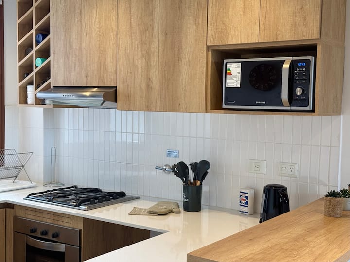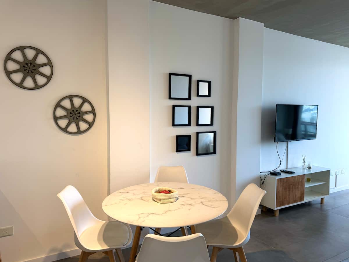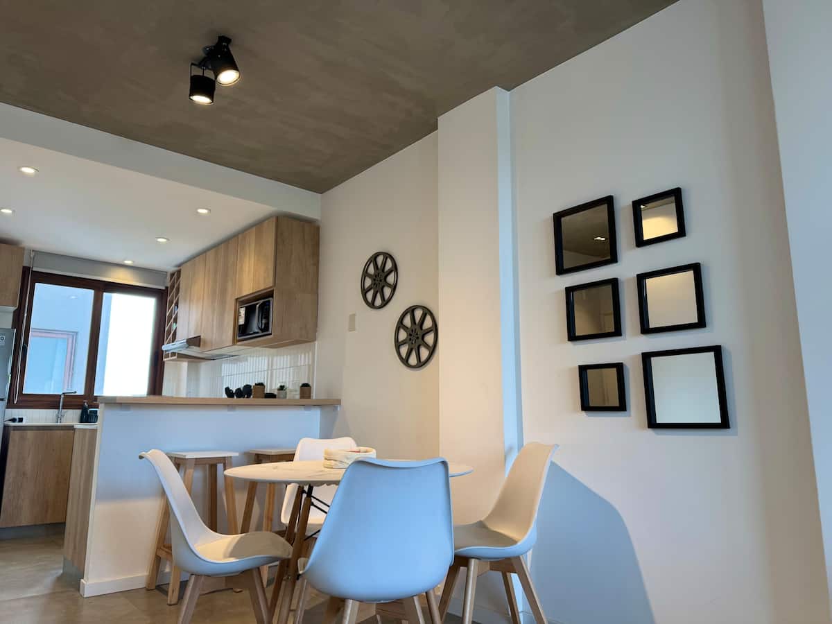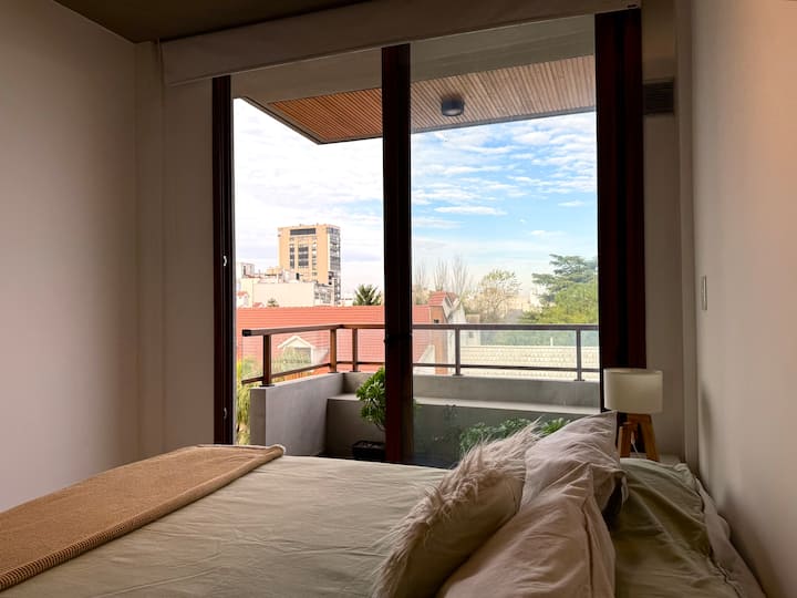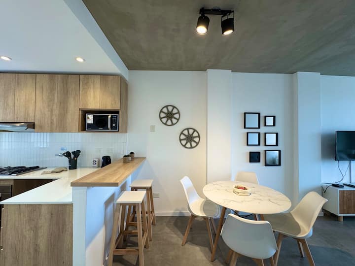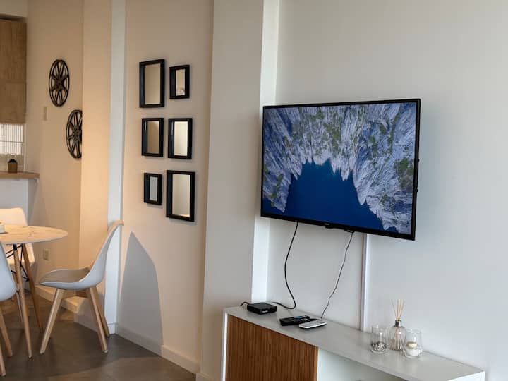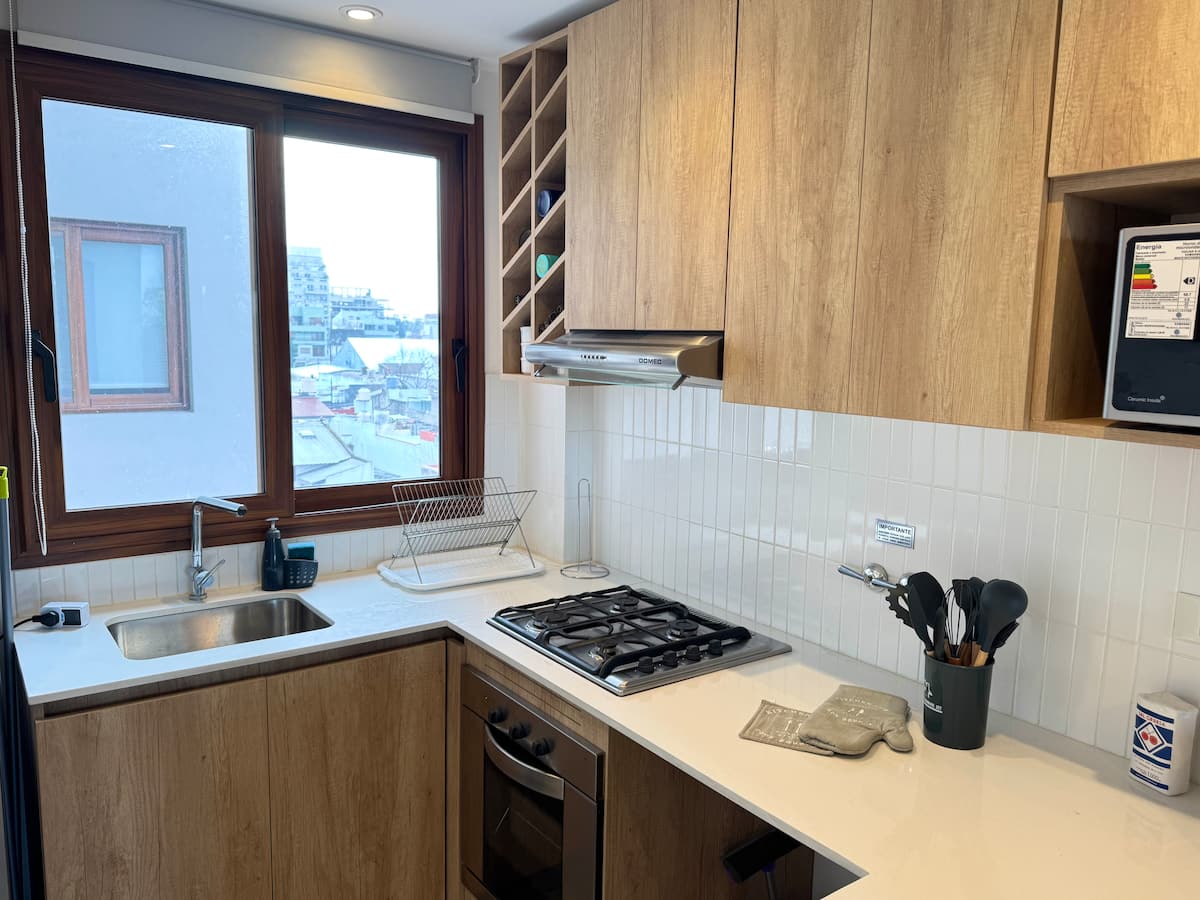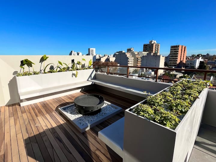 Departamento monoambiente de edificio nuevo en Villa Devoto, con balcón y vista abierta. Cocina equipada con barra desayunadora, horno, heladera y pava eléctrica. Cuenta con cama queen (160x200 cm), sofá cama, TV Smart de 42”, WiFi, aire acondicionado frío/calor y placard. El edificio dispone de laundry, pileta y SUM; el SUM solo se ofrece para estancias de 2 semanas o más, con costo por turno de USD 50 y con reserva previa.