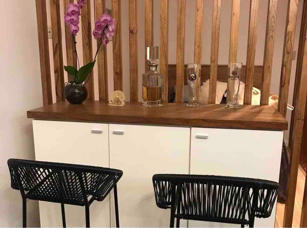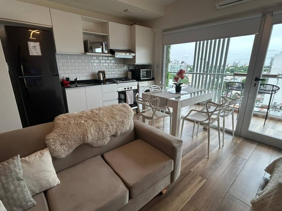 Loft de 1 dormitorio en un 7º piso en Villa Luro, al frente, con balcón y jardín vertical. Incluye dos Smart TVs, placard de pared con cajonera y perchero, cocina completa con lavarropas y WiFi de alta velocidad. También tiene un espacio tipo barra.
