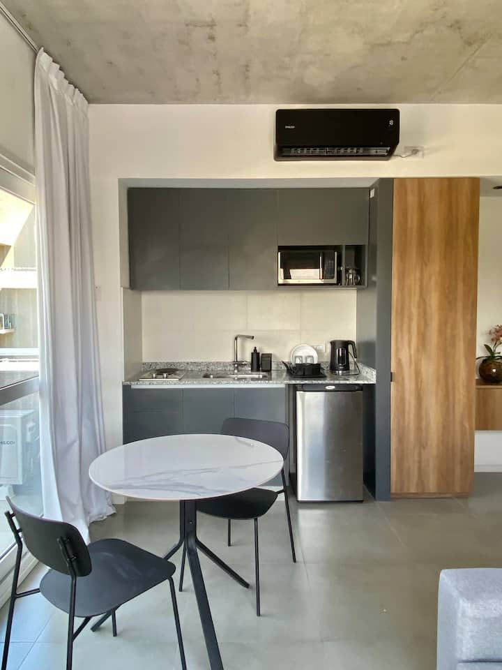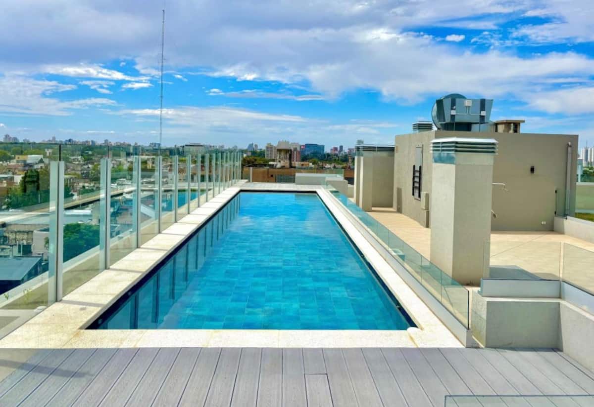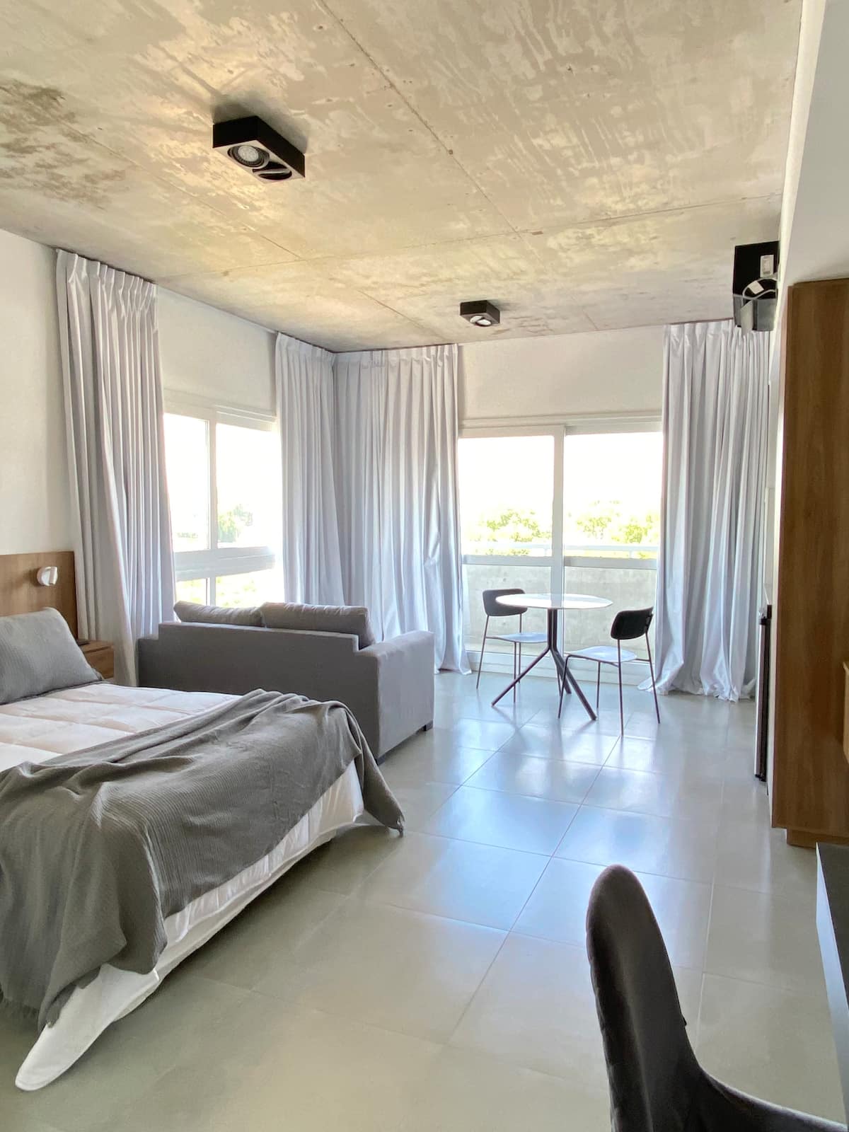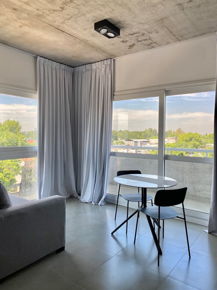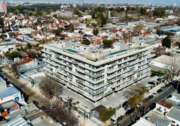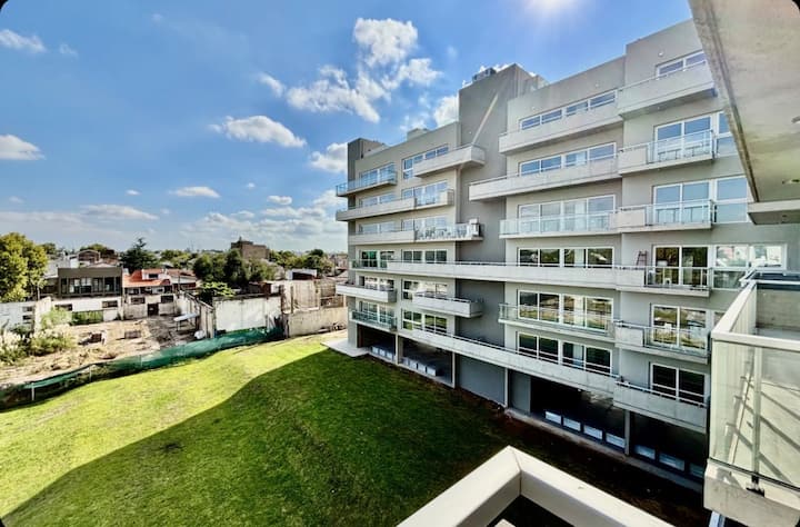 Departamento monoambiente de 1 ambiente con cochera en Villa Martelli, con balcón. Incluye cocina con heladera y microondas, vajilla y utensilios, cama y almohadas, escritorio, placard, aire acondicionado frío/calor y baño con ducha de mano. El alquiler incluye WiFi y TV y cuenta con seguridad 24 horas, 2 piletas, gimnasio, laundry, SUM y parrilla.