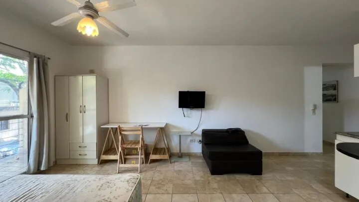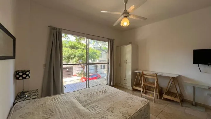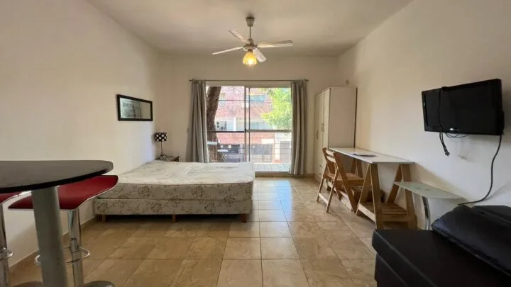 Departamento monoambiente de alquiler temporario con balcón en Villa Ortúzar. Se entrega totalmente equipado: cama matrimonial, mesa de desayuno con 2 sillas, escritorio, placard, sillón y ventilador de techo. Cocina con anafe eléctrico, microondas y heladera bajo mesada, y baño completo. Los servicios están incluidos excepto la luz, que queda a cargo del inquilino.