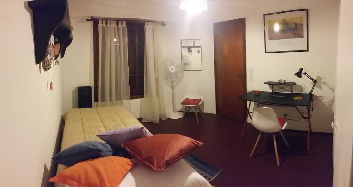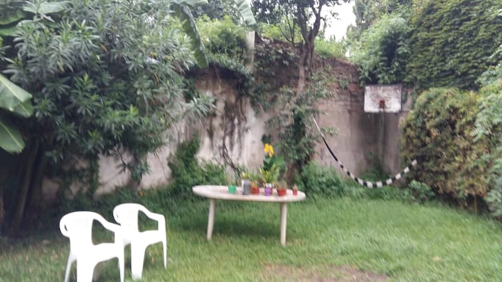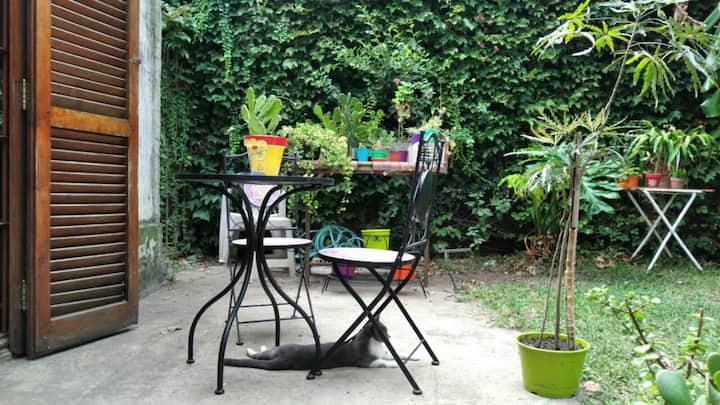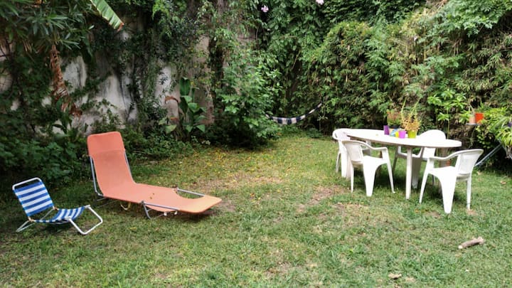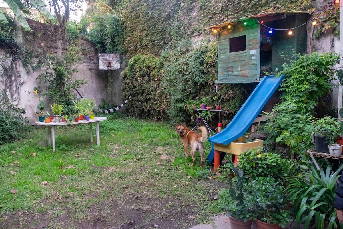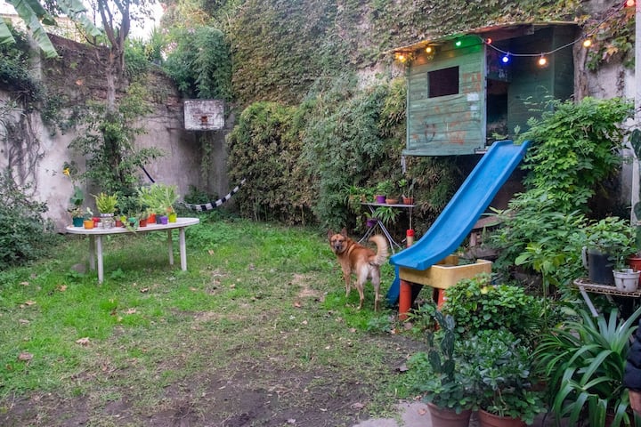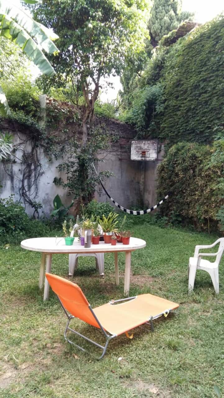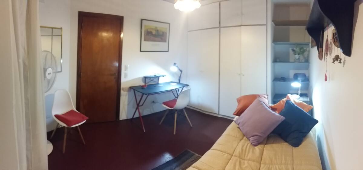 Departamento en Villa Ortúzar, ubicado en el 4° piso. El aviso describe una vivienda con 1 dormitorio y acceso compartido a áreas comunes como living, cocina comedor, jardín y lavadero. También menciona uso compartido de 2 baños y presencia de mascotas en el alojamiento.