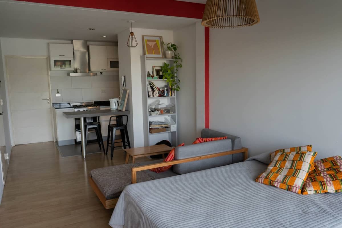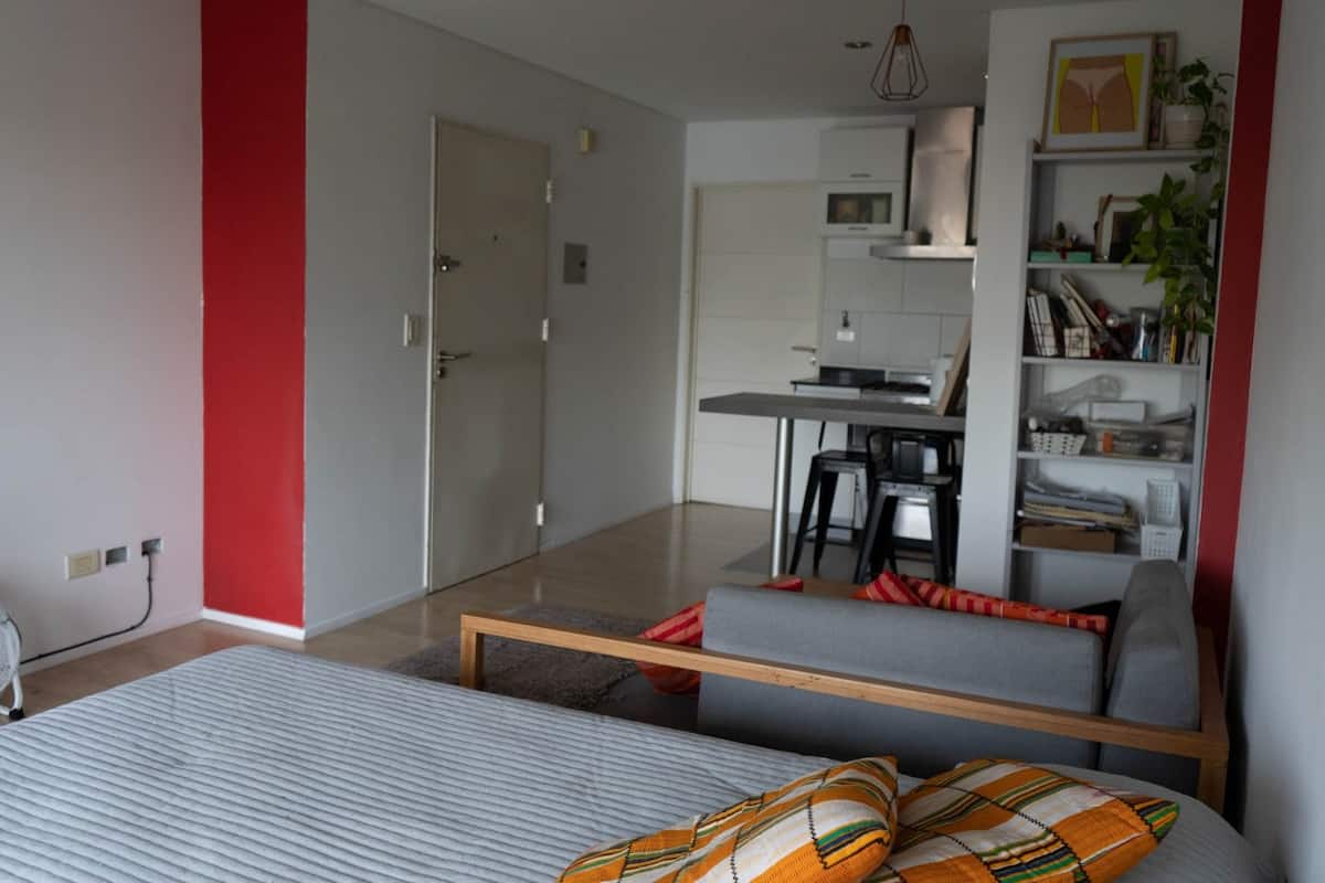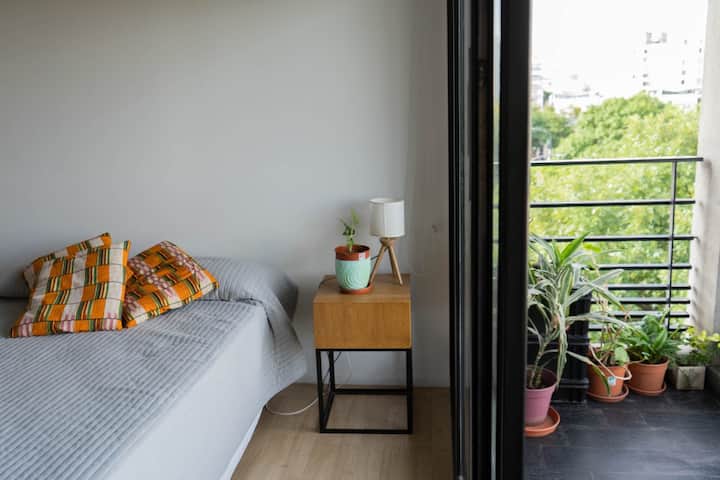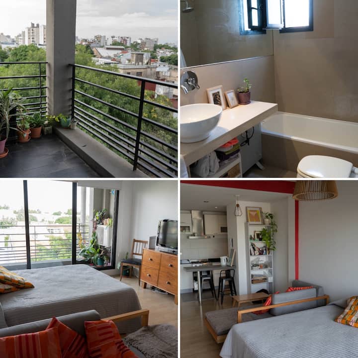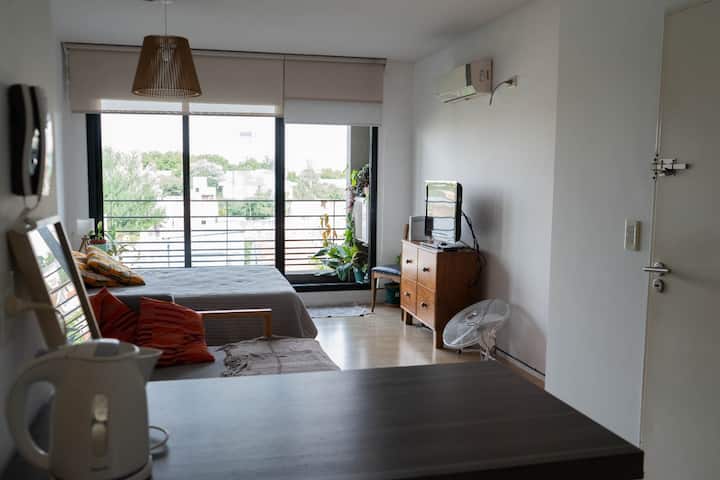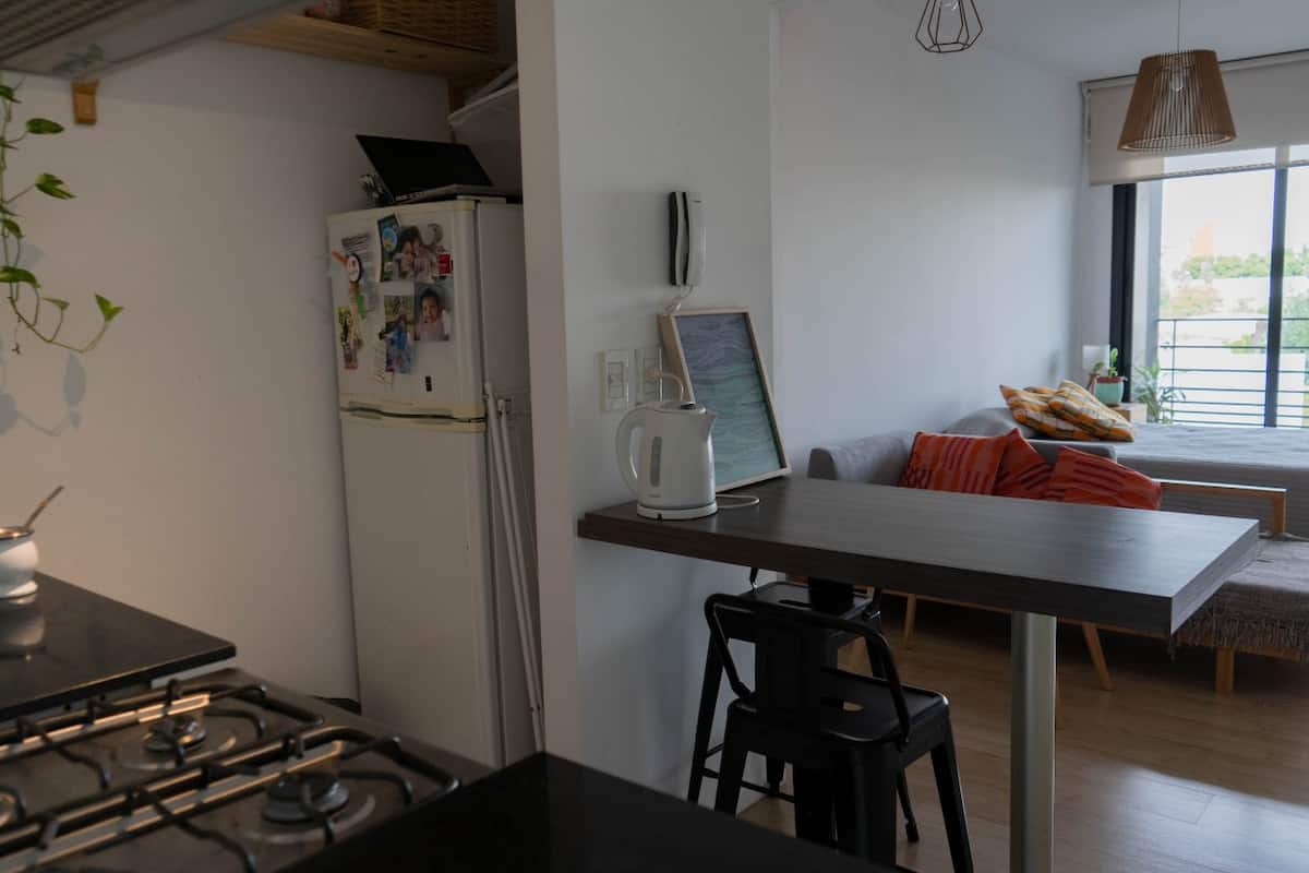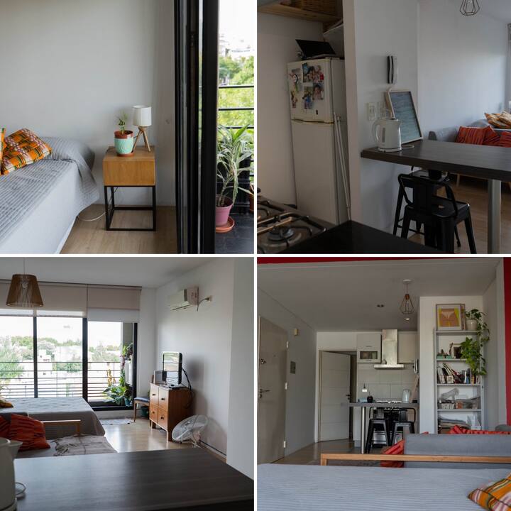 Studio de um único ambiente com cozinha completa e varanda ampla, no 4º andar, acessível por elevador, em Villa Ortúzar. O imóvel tem ar-condicionado e ventilador. Há acesso a serviços e áreas de alimentação na região e fica a 5 quadras da estação Los Incas da Linha B do metrô.