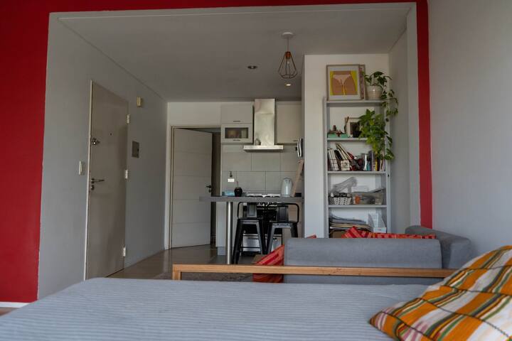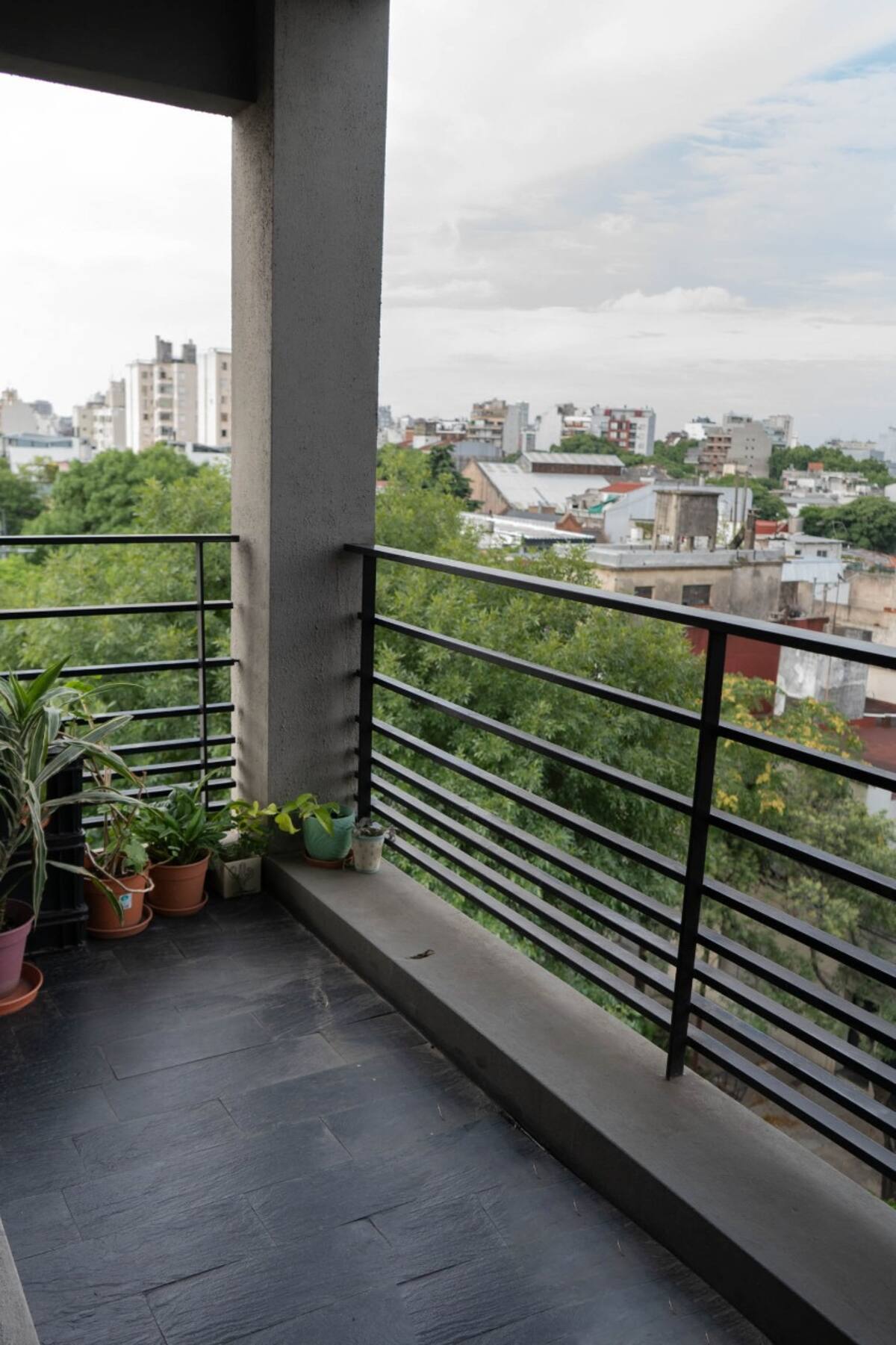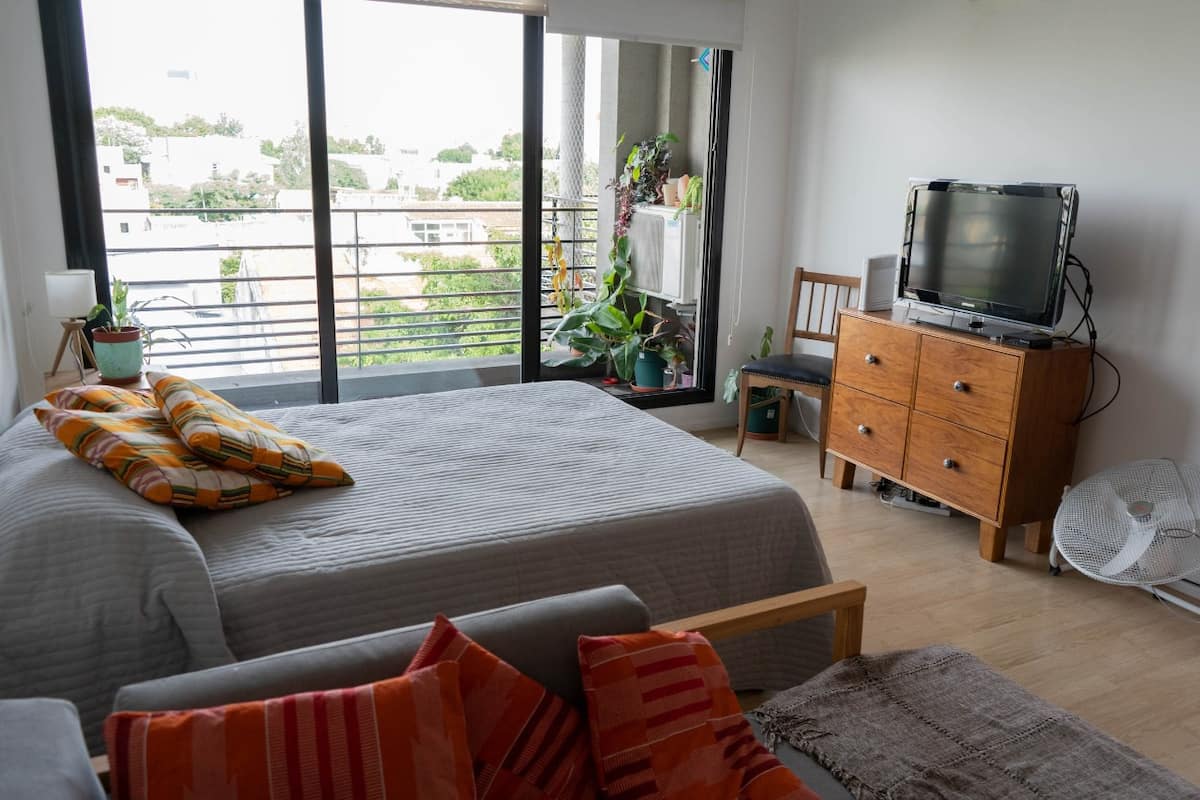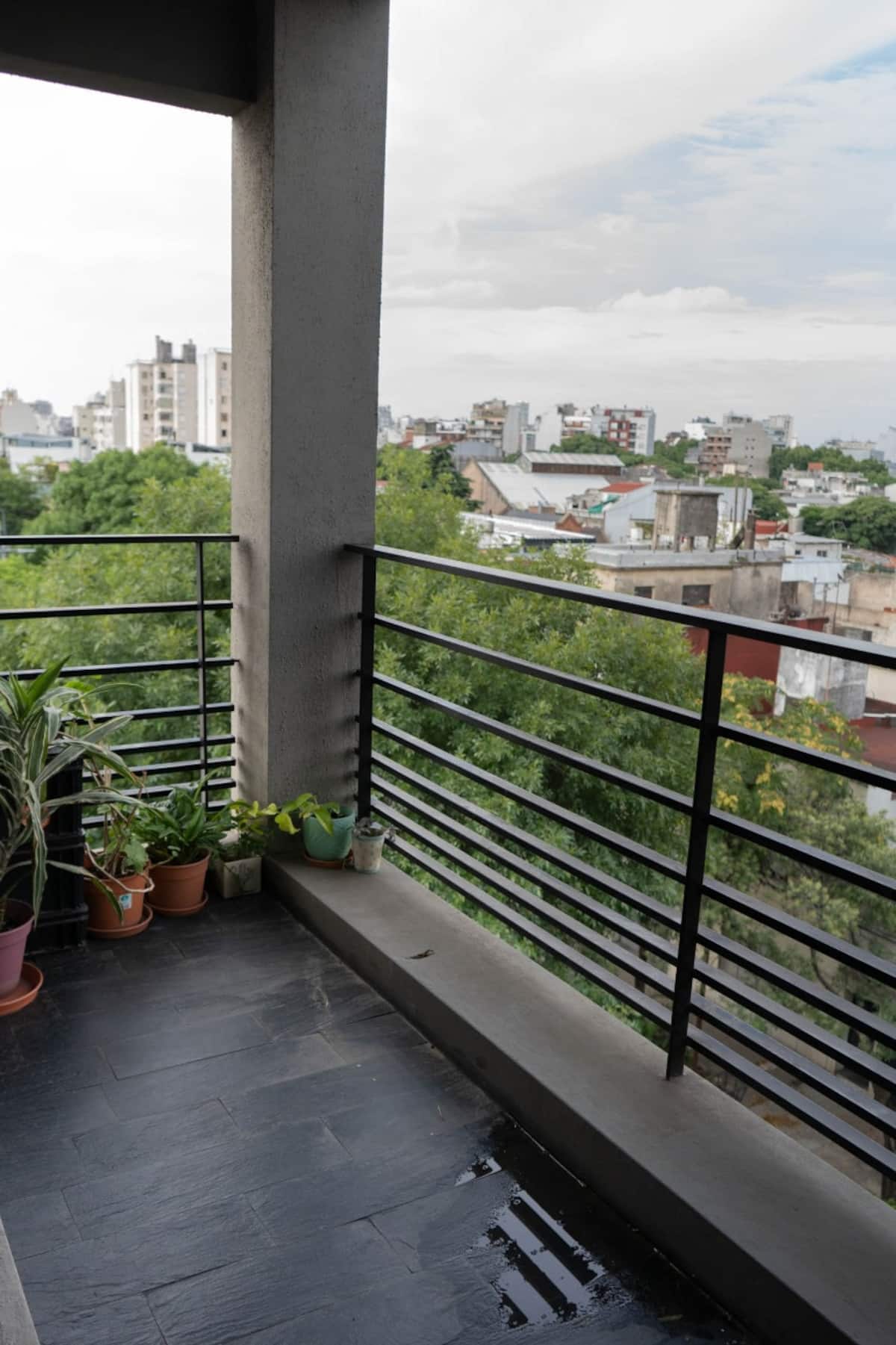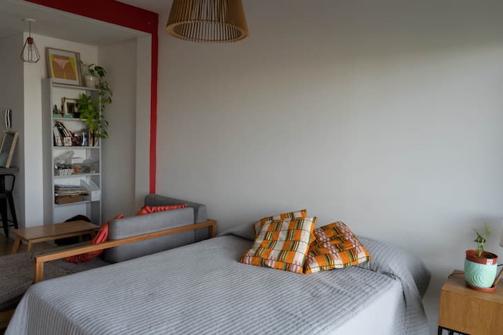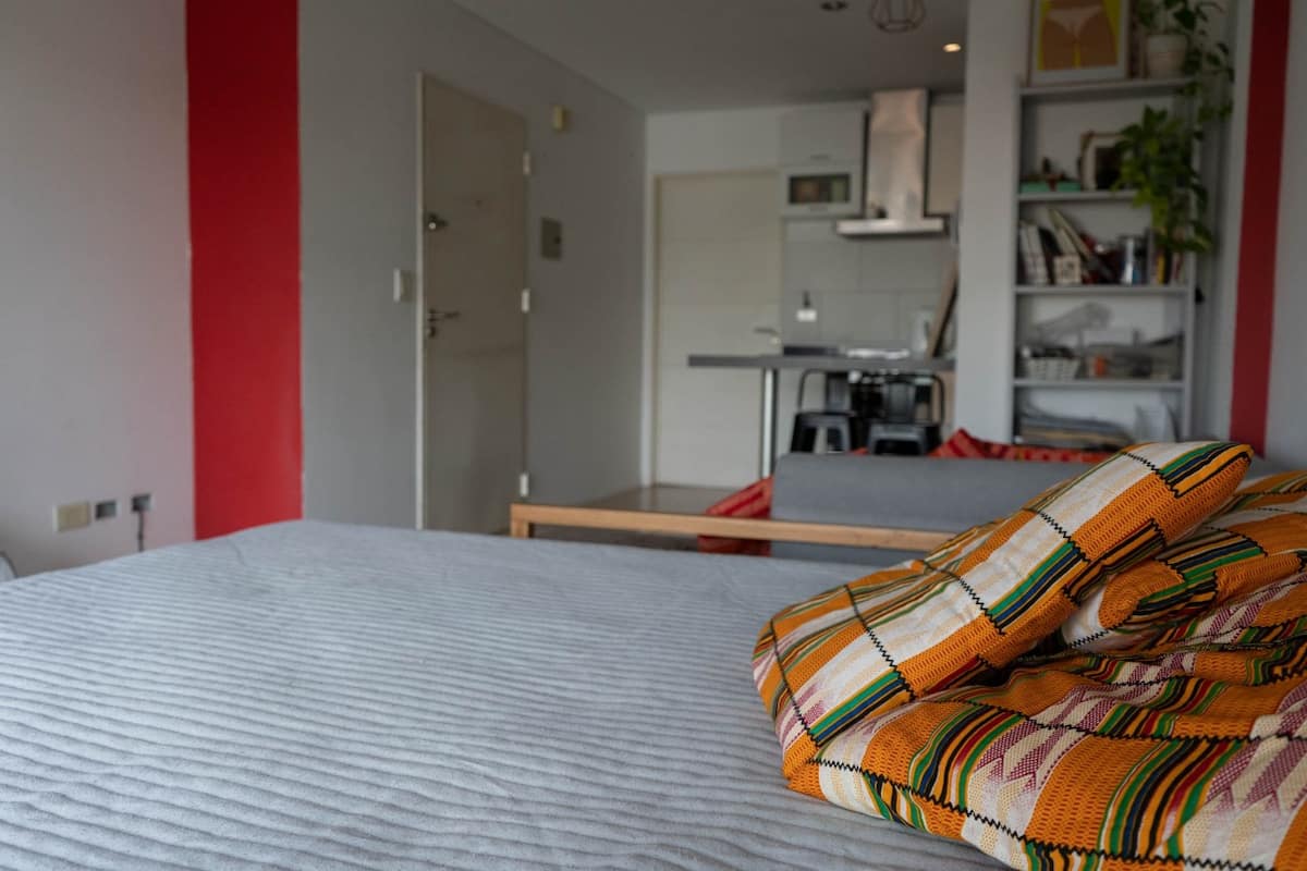 Studio de um único ambiente com cozinha completa e varanda ampla, no 4º andar, acessível por elevador, em Villa Ortúzar. O imóvel tem ar-condicionado e ventilador. Há acesso a serviços e áreas de alimentação na região e fica a 5 quadras da estação Los Incas da Linha B do metrô.
