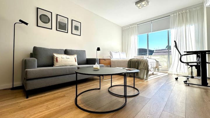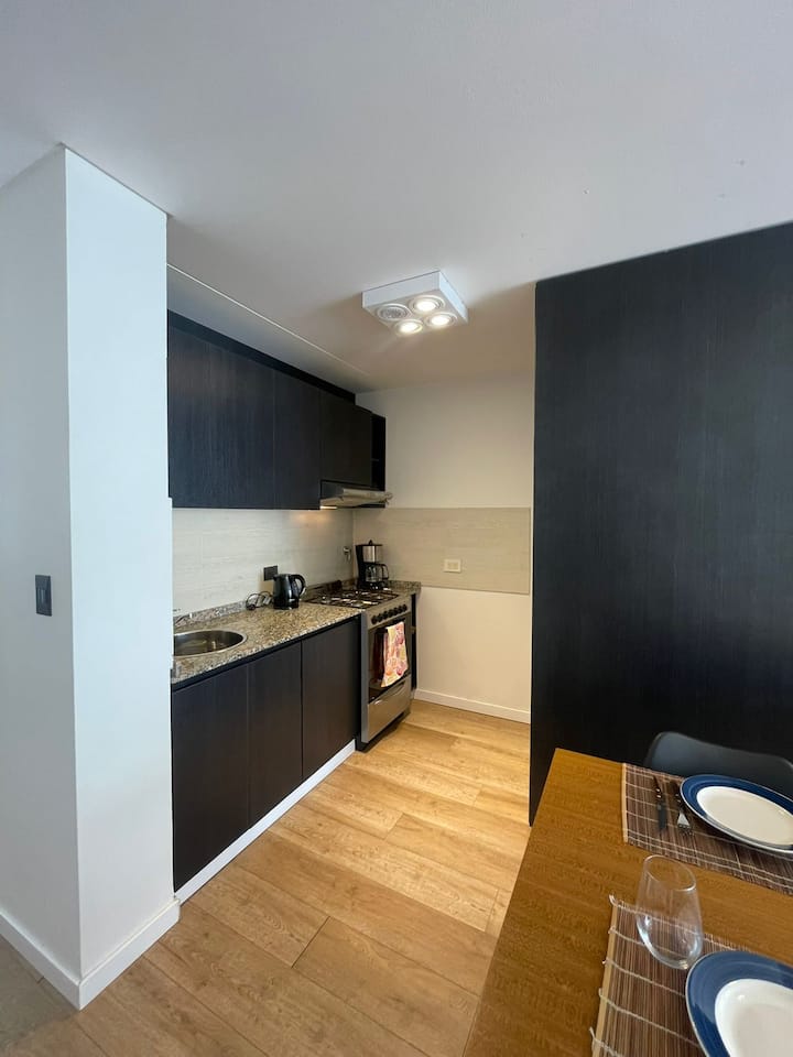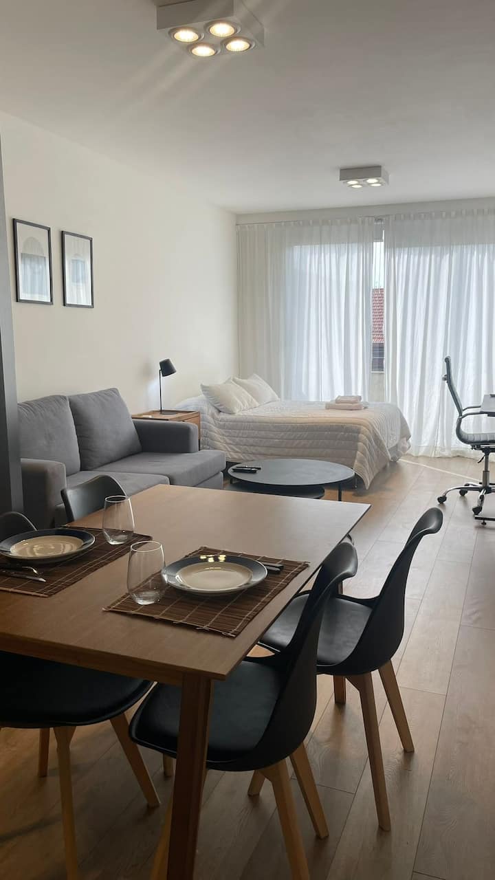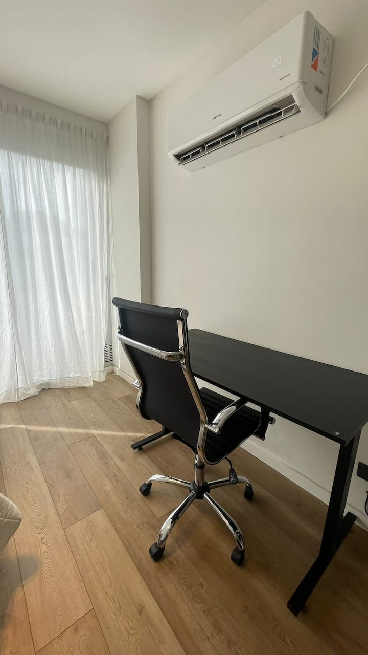 Departamento monoambiente de 1 dormitorio en Villa Pueyrredón con balcón. Cuenta con sector de trabajo y está equipado para estadías. Ubicado en una zona residencial.