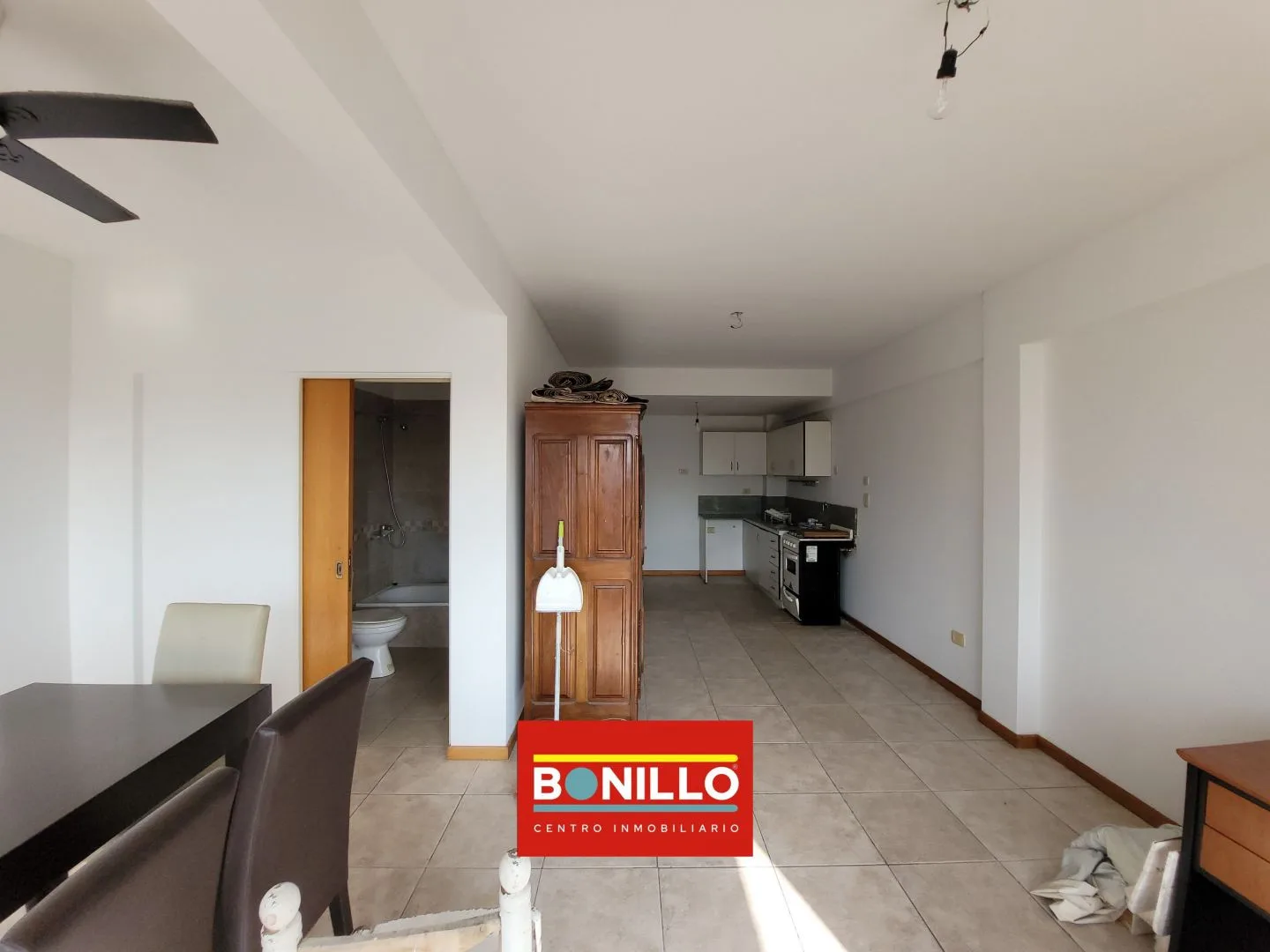 Monoambiente al contrafrente con espacio guardacoche en alquiler. Tiene pisos cerámicos, baño y toilette. La cocina es con gas natural, con espacio de guardado, y cuenta con agua caliente central. Se alquila con mesa, sillas, ropero y escritorio (según fotos). Requiere garantía de Capital o seguro; 1 mes de adelanto y 1 mes de depósito. Contrato de 2 años con aumento trimestral ajustado por IPC. Acepta mascota pequeña.