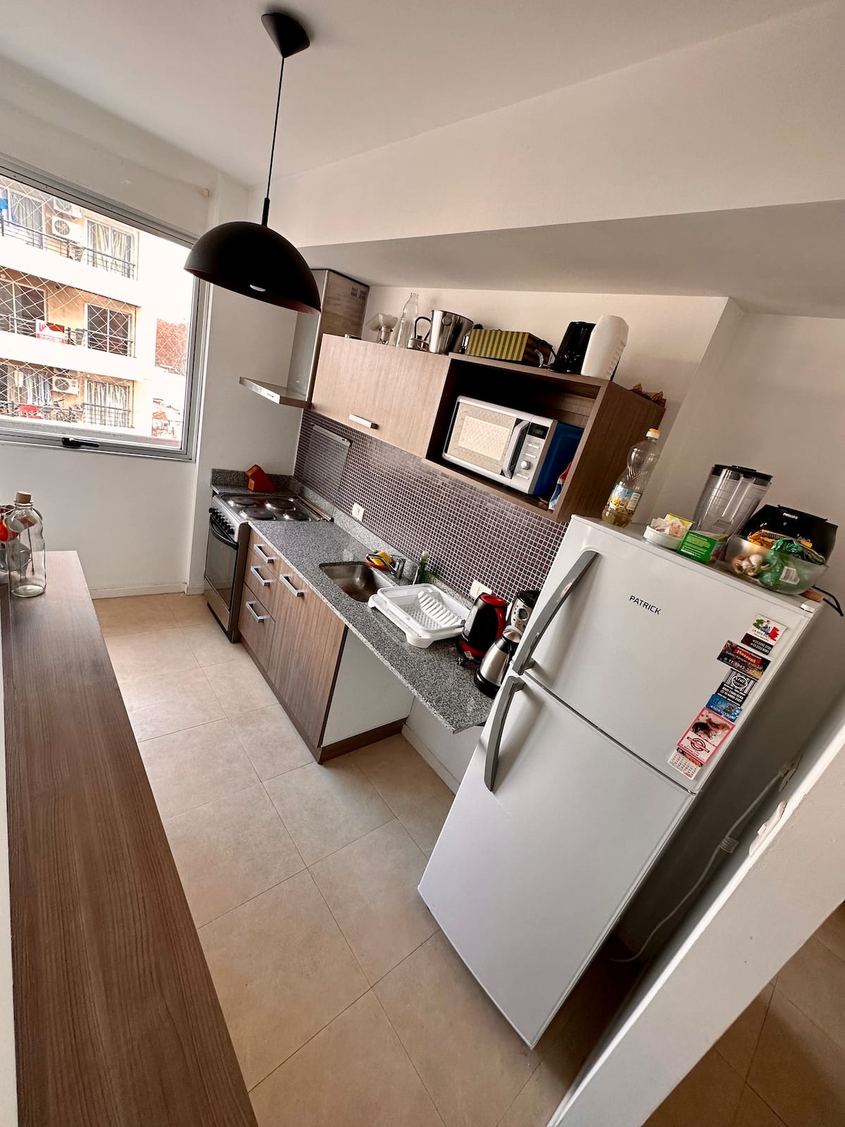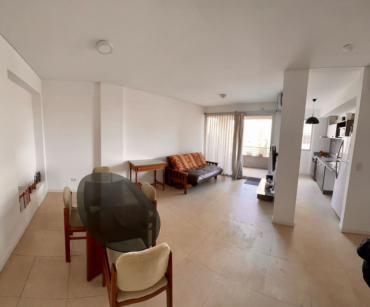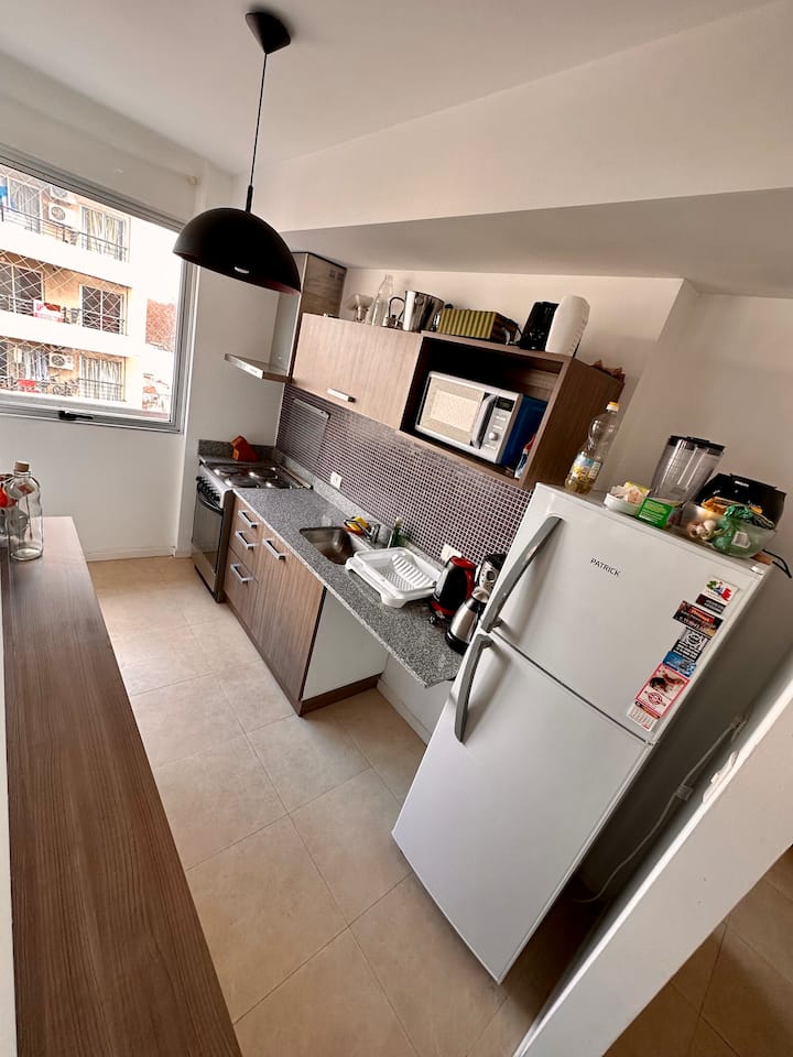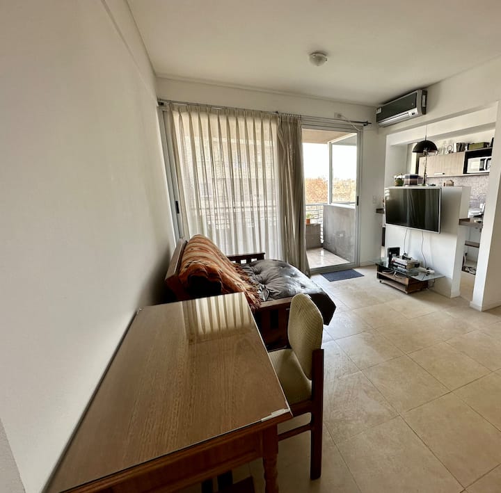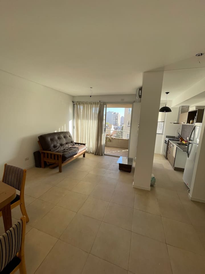 Departamento de 2 ambientes con 1 dormitorio, en Villa Pueyrredón, en CABA, a pocos bloques de Av. General Paz. Cuenta con cama doble y un futón doble en el comedor, con capacidad para 3 personas, 2 aires acondicionados y escritorio. La cochera es cubierta y está dentro del edificio. El edificio dispone de parrilla de uso común y el departamento da hacia la puesta del sol, con ingreso de luz natural durante el día.