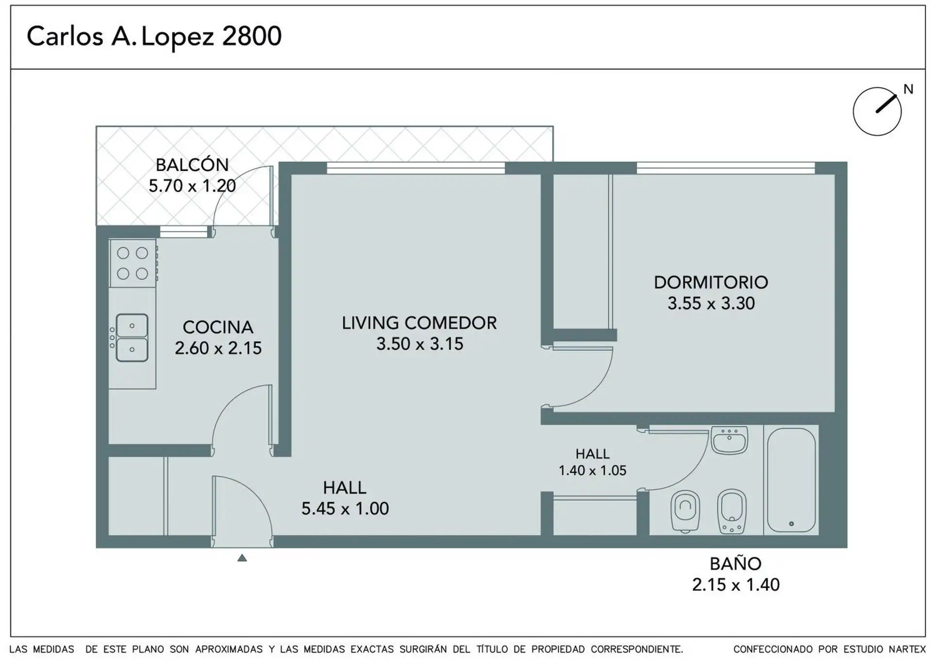 Departamento de 2 ambientes con hall de 5.45 x 1.00 m, living comedor de 3.50 x 3.15 m y salida a balcón de 5.70 x 1.20 m. Cocina independiente de 2.60 x 2.15 m con acceso al balcón; el dormitorio mide 3.55 x 3.30 m y cuenta con placard empotrado. Incluye baño completo de 2.15 x 1.40 m. El edificio cuenta con seguridad 24 hs, S.U.M., piscina y parrilla.