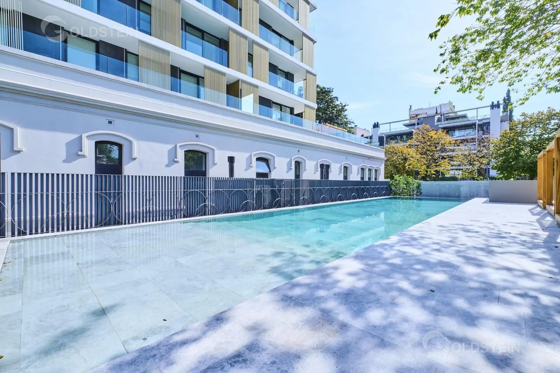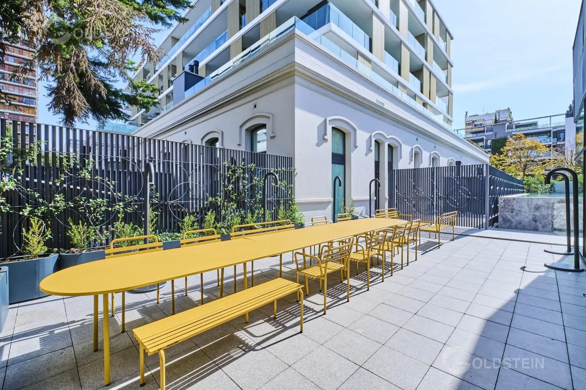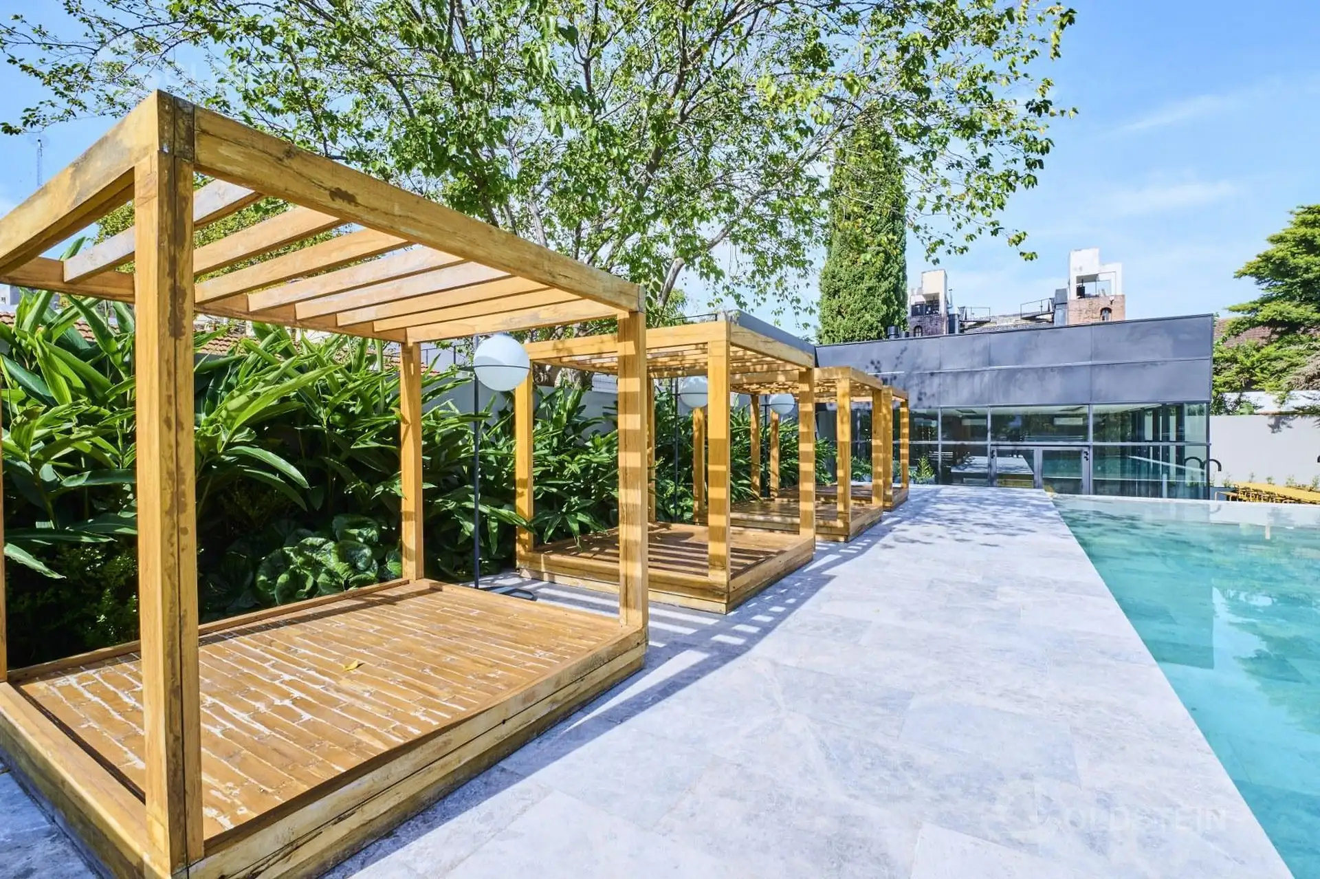 Departamento de 2 ambientes en alquiler con jardín privado y parrilla propia. Cuenta con 1 baño completo y 1 toilette; aire frío/calor y calefacción por piso radiante alimentada por caldera central a gas con colector propio, bypass y caudalímetro. La cocina tiene mesada de Corian, muebles bajo mesada y alacena, y portero visor. El edificio dispone de pileta descubierta con solárium, sector de parrillas, SUM, espacio para gimnasio, pileta cubierta climatizada, sauna y ducha escocesa, además de ba
