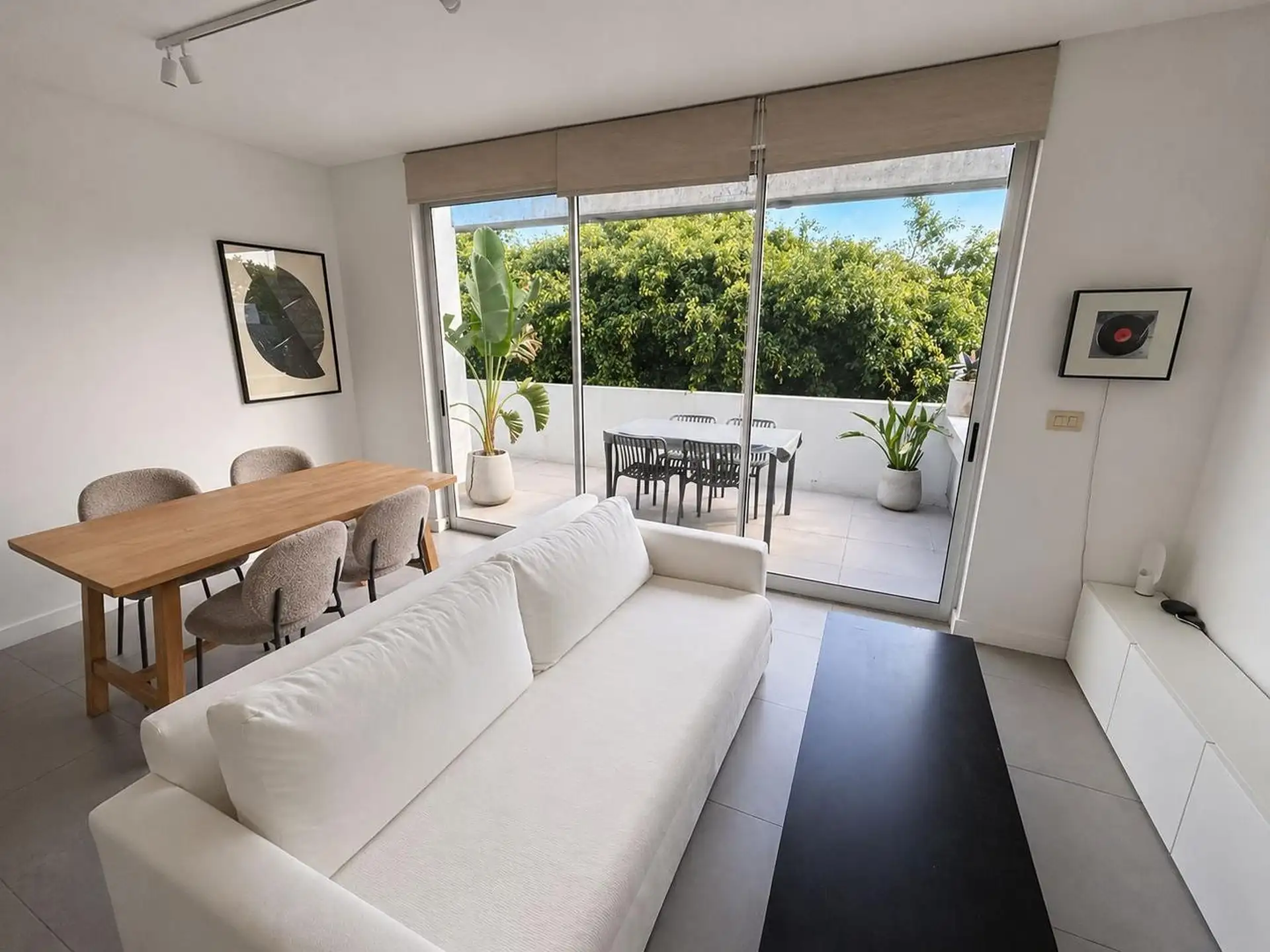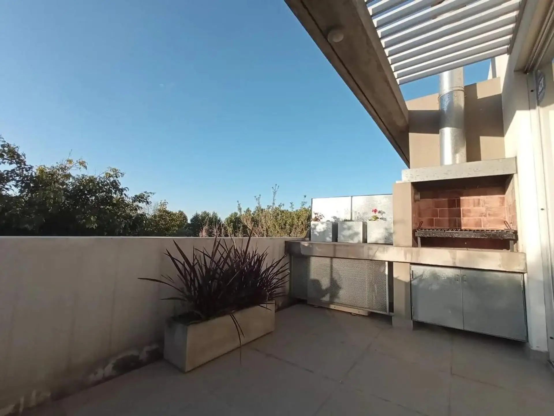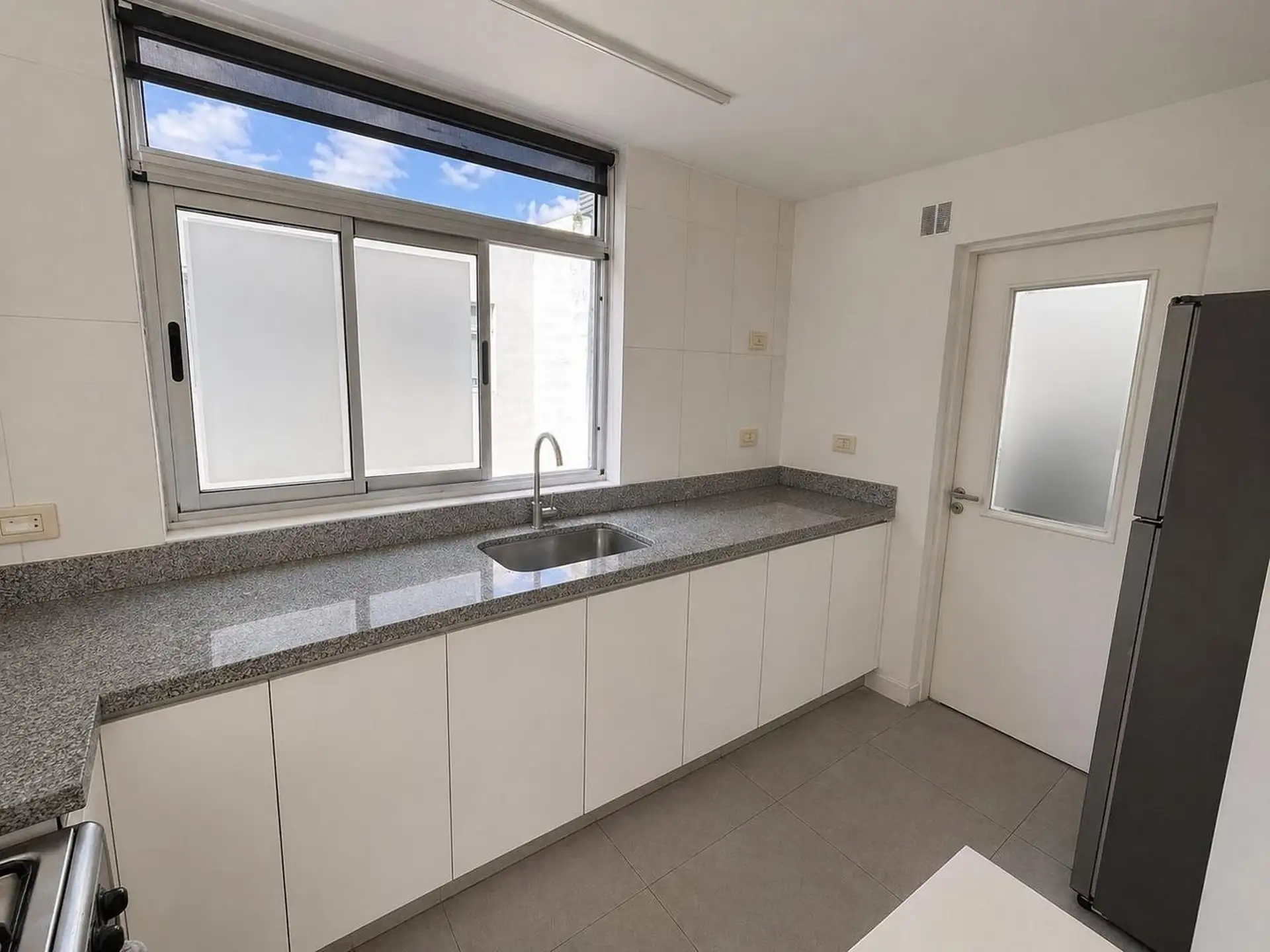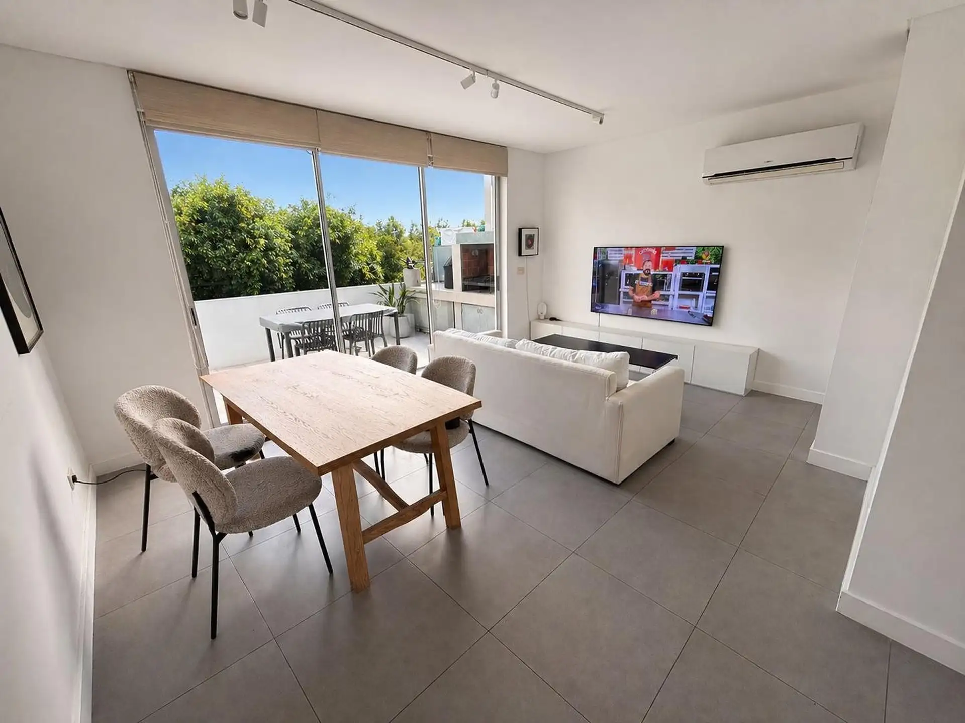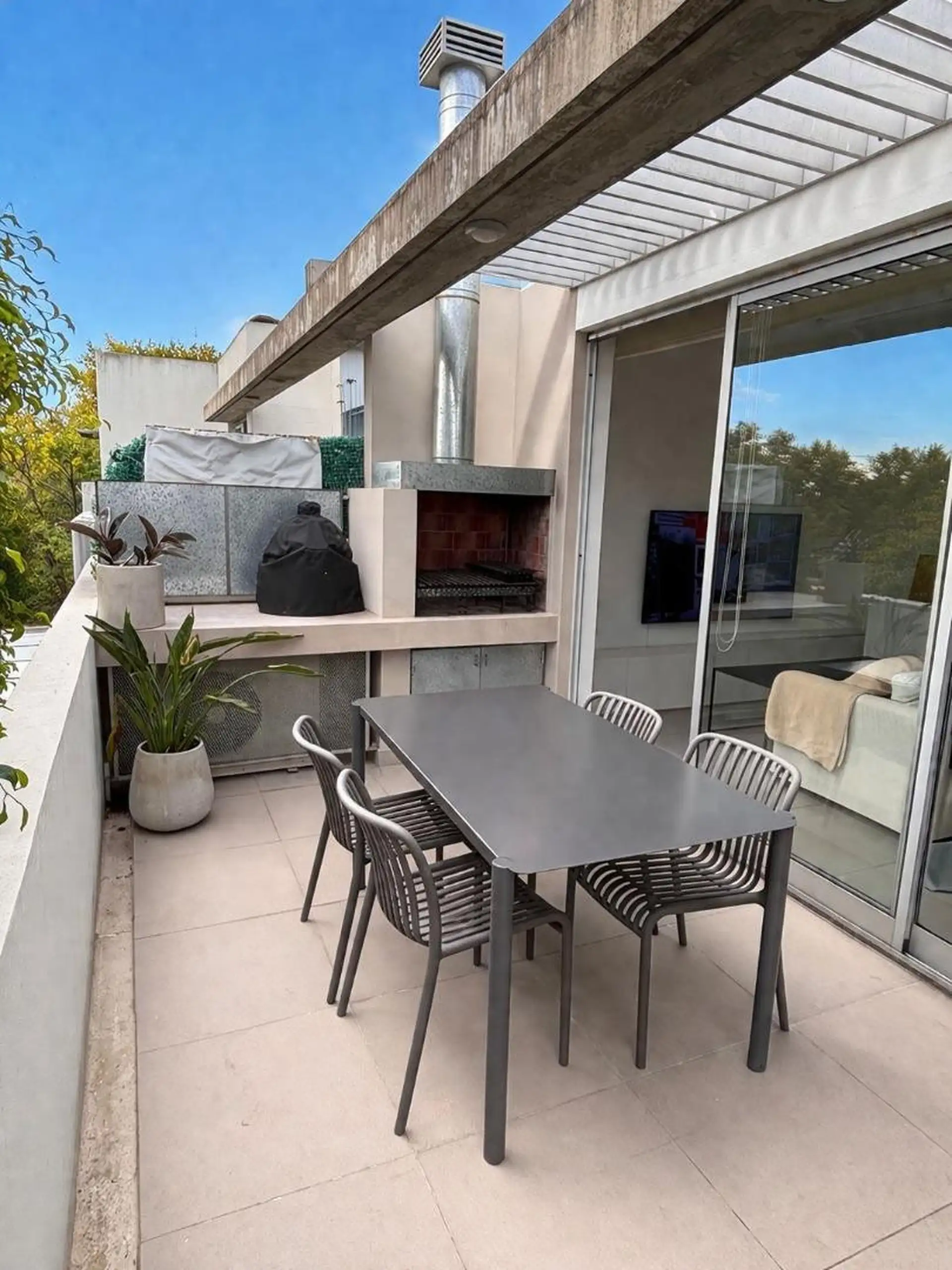 Departamento de 2 ambientes de 3° piso al frente en Villa Pueyrredón, con vista abierta. Cuenta con living comedor con disposición apaisada y pisos de porcelanato, salida a balcón terraza corrido con parrilla y espacio para mesa y sillas, baño completo y cocina semi integrada con barra desayunadora, bajo mesada y alacenas. La unidad incluye 1 dormitorio con placard con interiores, lavadero cubierto independiente y caldera dual Baxi para agua caliente y calefacción individual por losa radiante, a