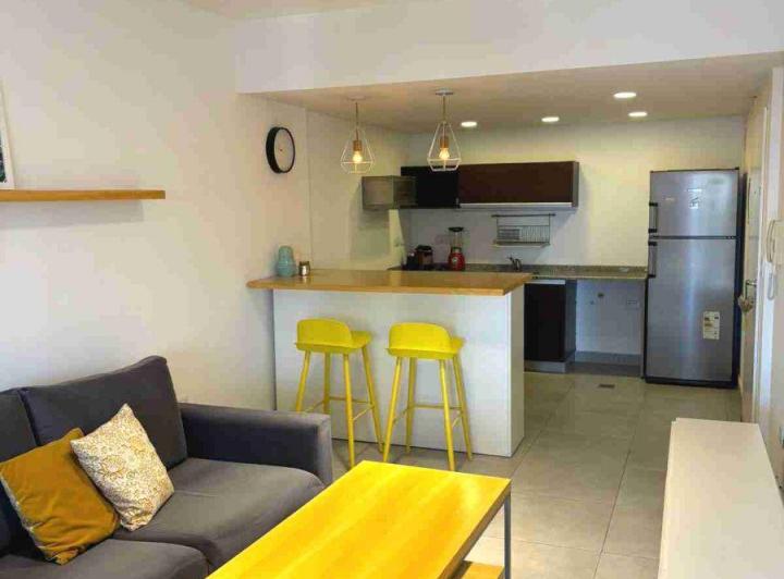 Departamento de 2 ambientes con balcón al contrafrente. Cuenta con living comedor de 3 x 4,55, cocina con barra desayunadora y lavadero incorporado de 3 x 3, dormitorio con placard de 3 x 2,80 y baño completo de 1,45 x 2,42. Tiene pisos de porcelanato y se ofrece parcialmente amoblado, con artefactos de cocina a la vista, totalmente pintado. El contrato de locación es por 24 meses; el 1er. trimestre tiene un valor de $ 640.000 y el depósito también es de $ 640.000, con indexación trimestral por