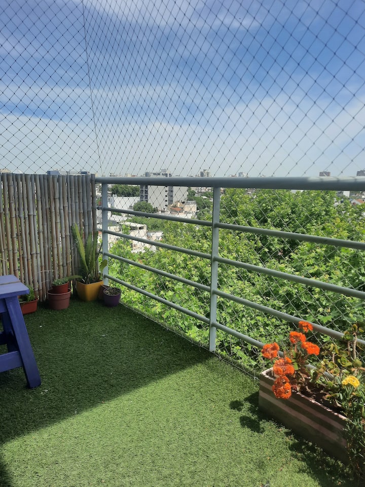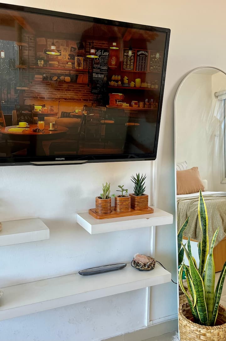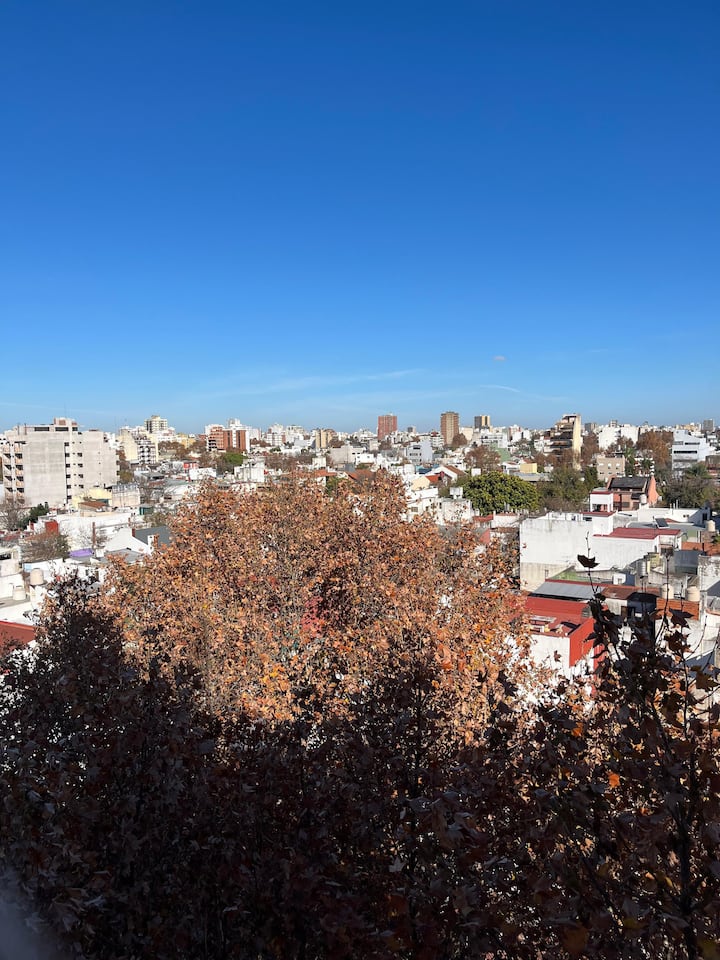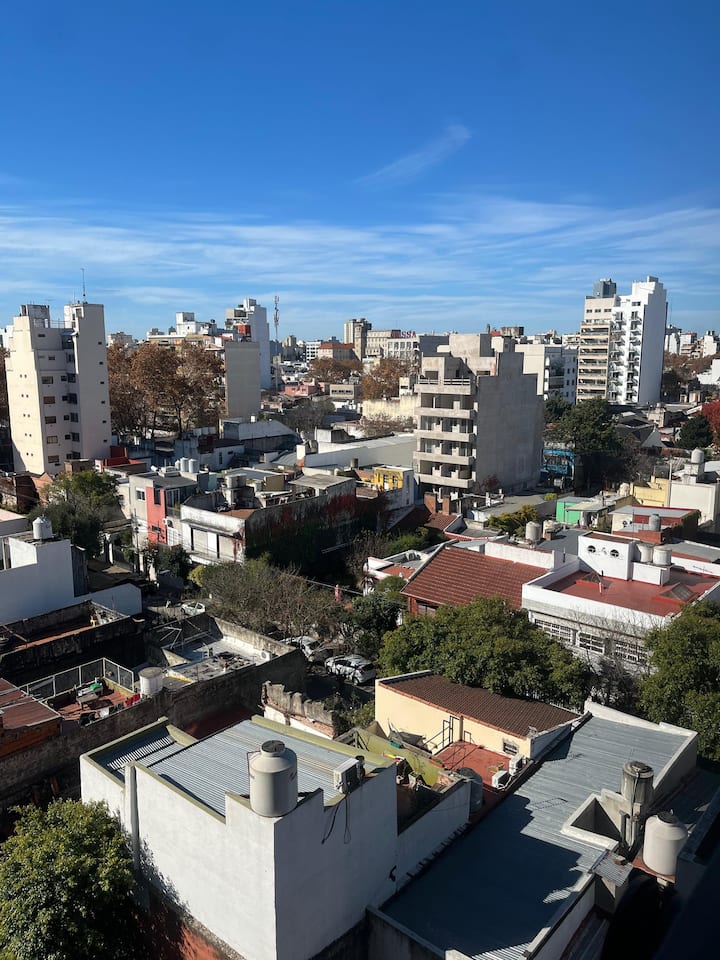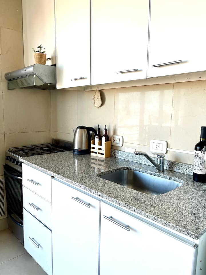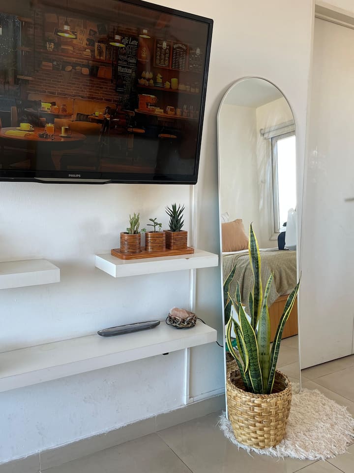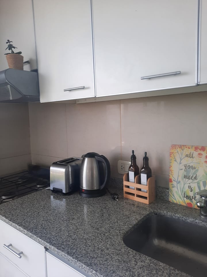 Monoambiente en Villa Santa Rita, en una zona residencial. Incluye cocina equipada y servicio con cama Queen, heladera no indicada, WiFi de 300 megabytes, Smart TV y aire frío/calor. También cuenta con pava eléctrica, tostadora y vajilla completa.