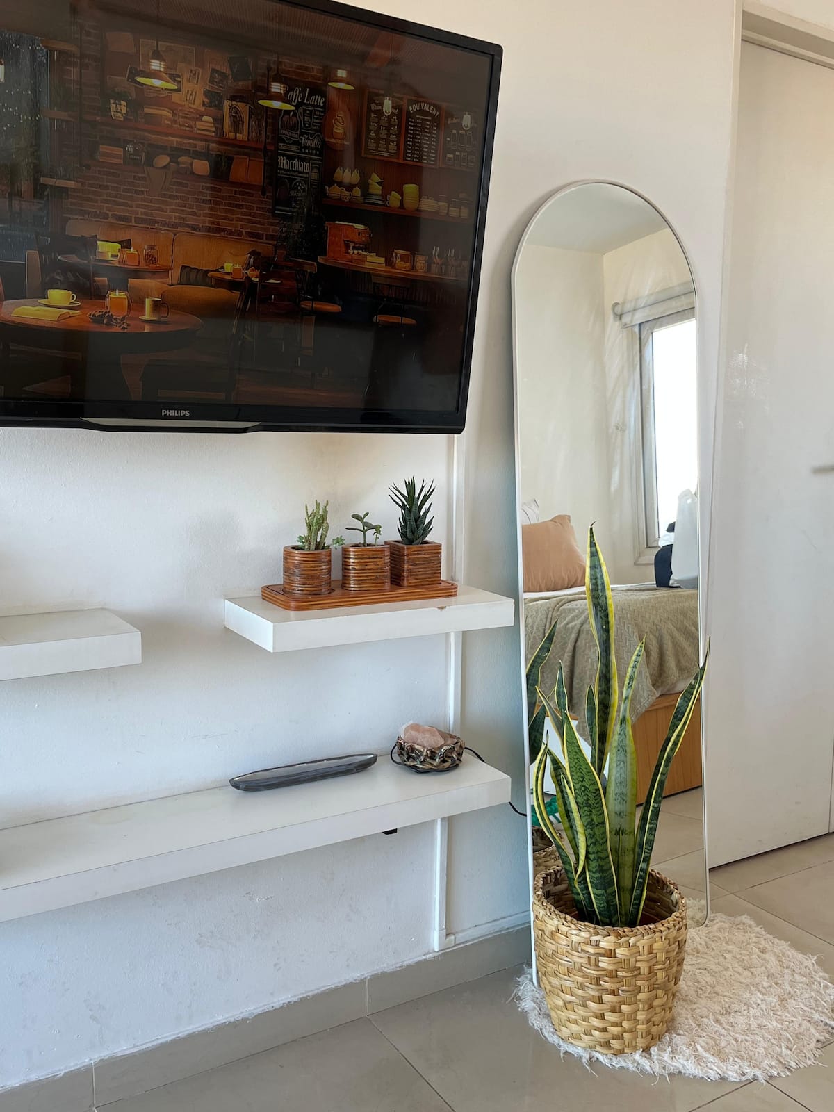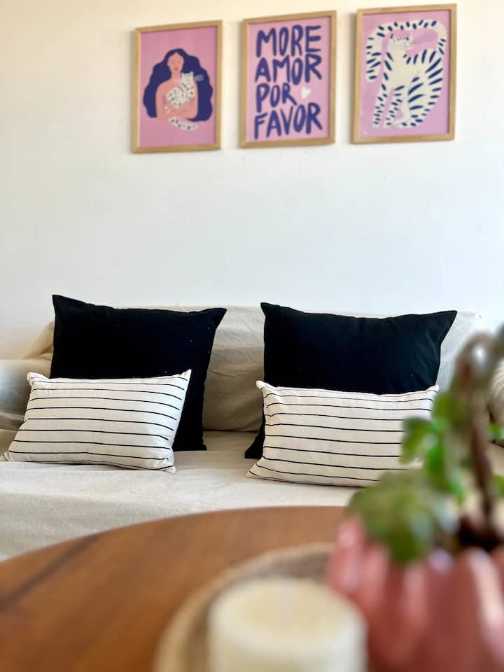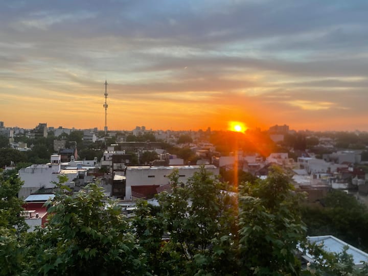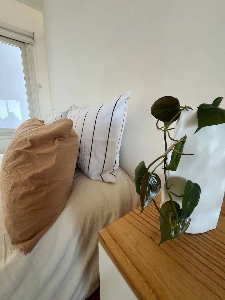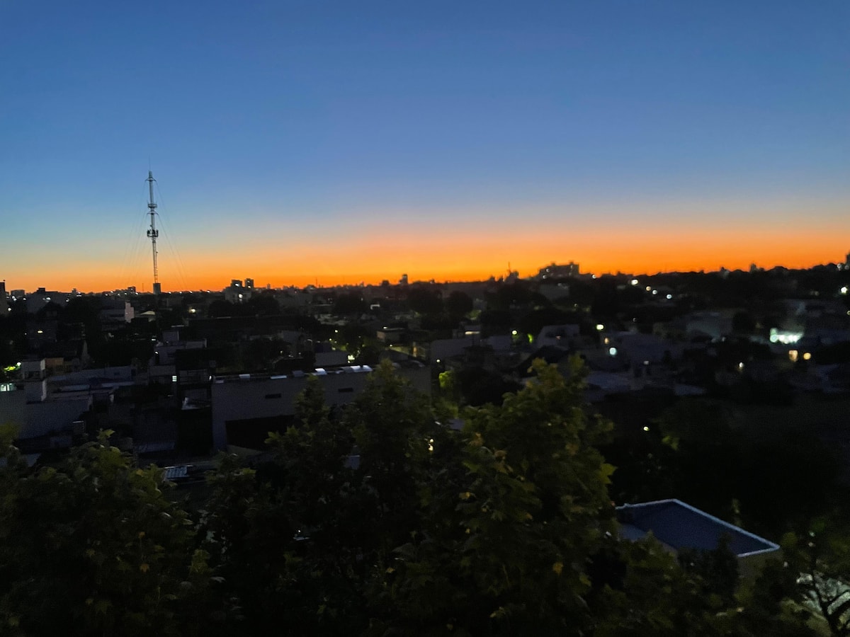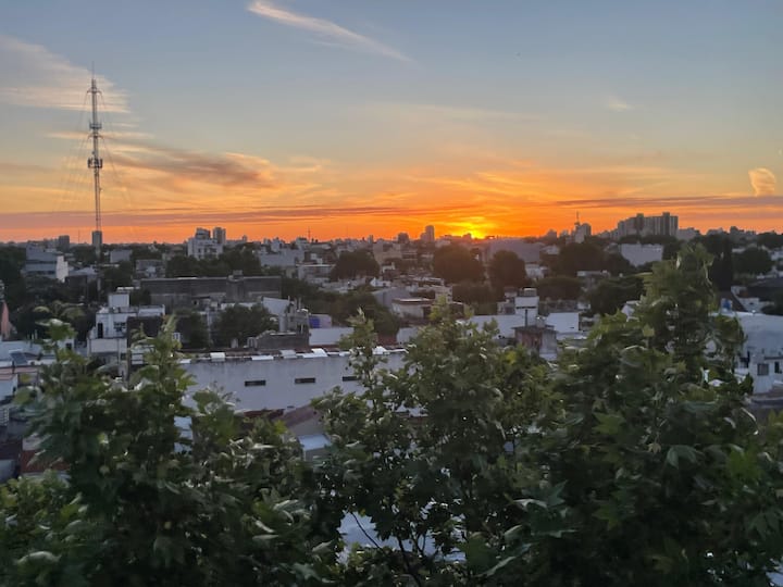 Monoambiente en Villa Santa Rita, en una zona residencial. Incluye cocina equipada y servicio con cama Queen, heladera no indicada, WiFi de 300 megabytes, Smart TV y aire frío/calor. También cuenta con pava eléctrica, tostadora y vajilla completa.