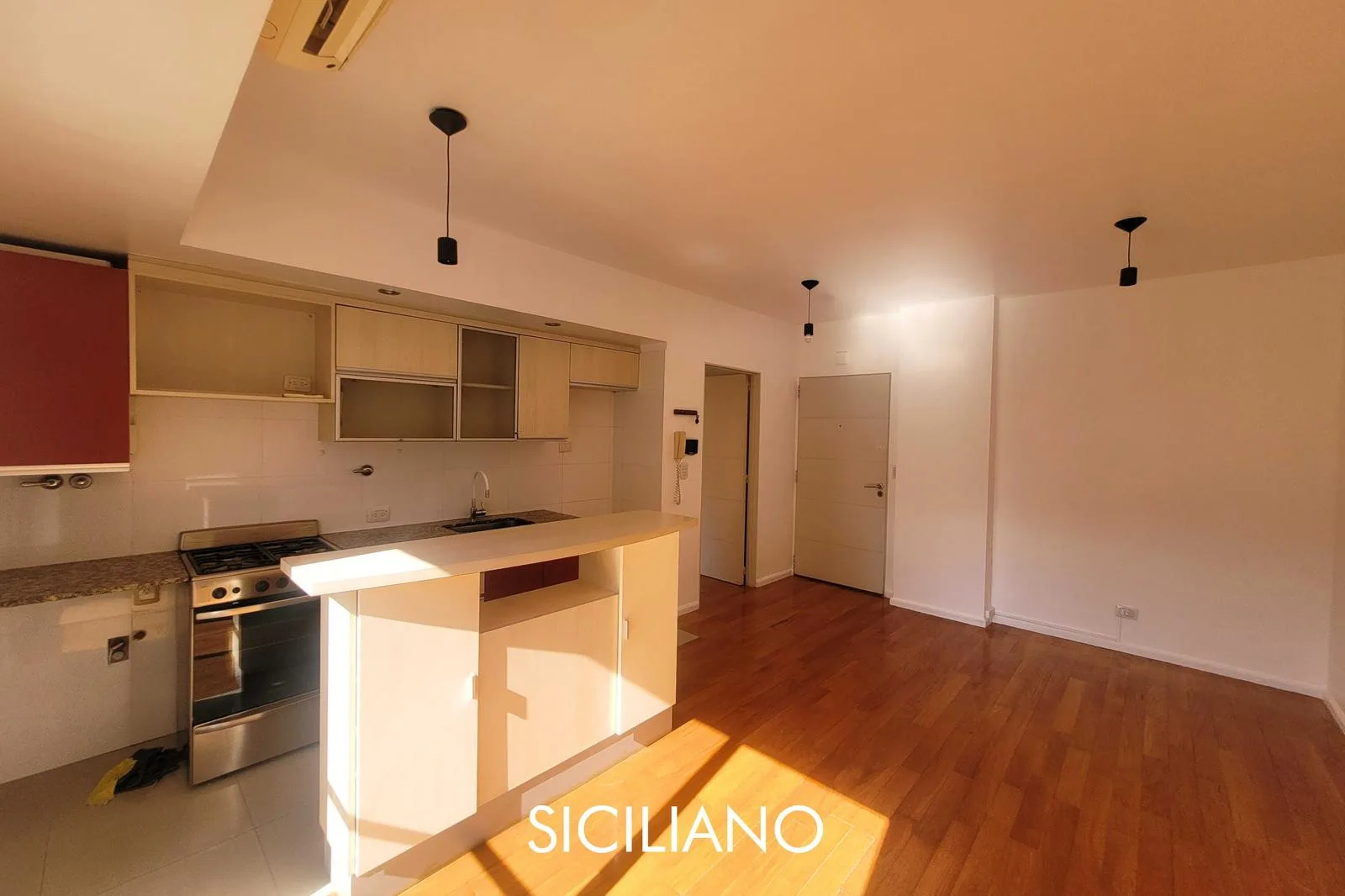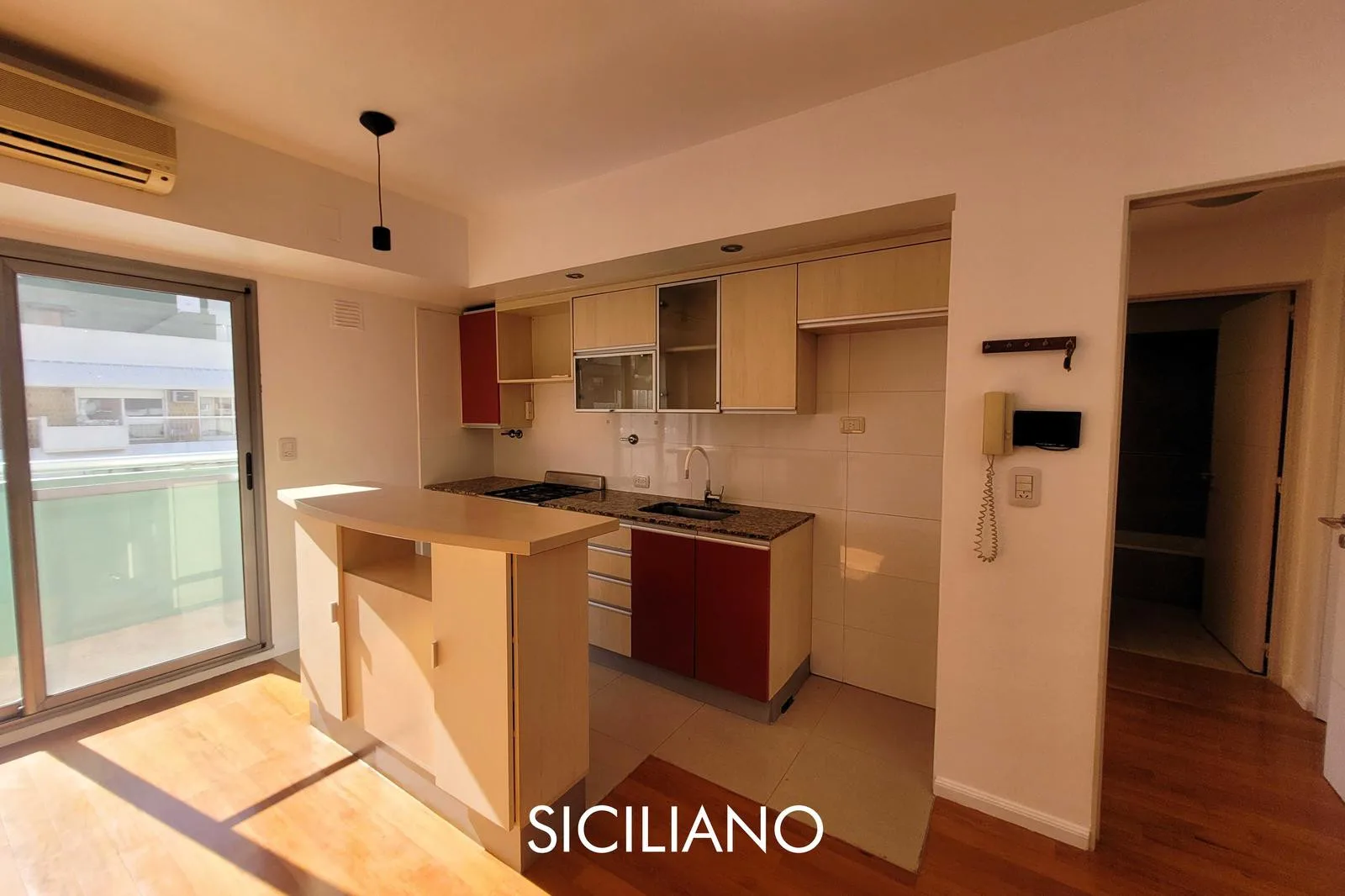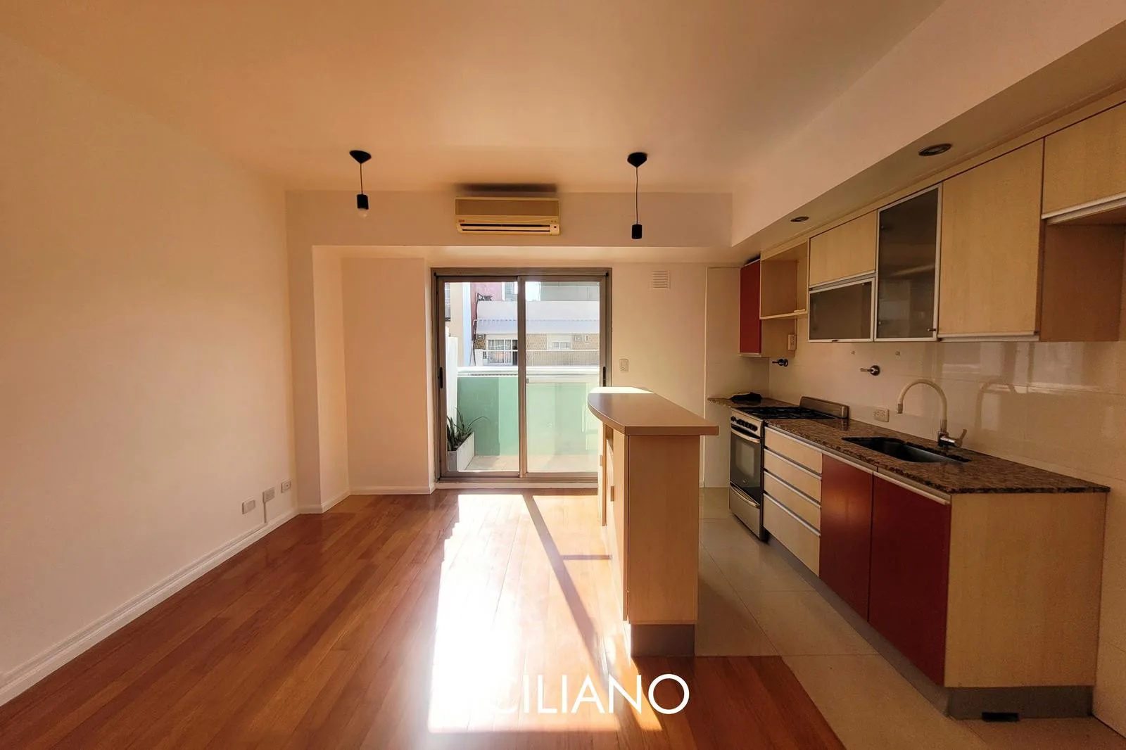 Departamento de 2 ambientes de 43.70 m² totales en el 8vo piso, al frente, con balcón corrido. Tiene cocina integrada por barra, living comedor, dormitorio con placard empotrado y baño completo con bañera. El edificio cuenta con ascensor, SUM y parrilla; expensas $90.000 (AYSA y ABL incluidos). Sobre la Av. Nahuel Huapi, entre las calles Díaz Colodrero y Pacheco.