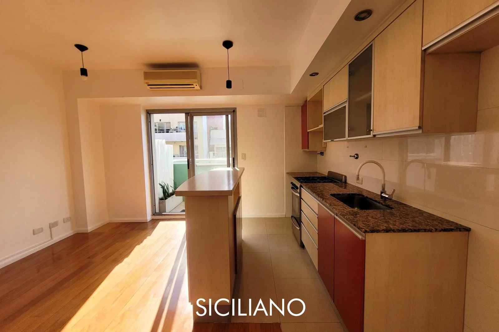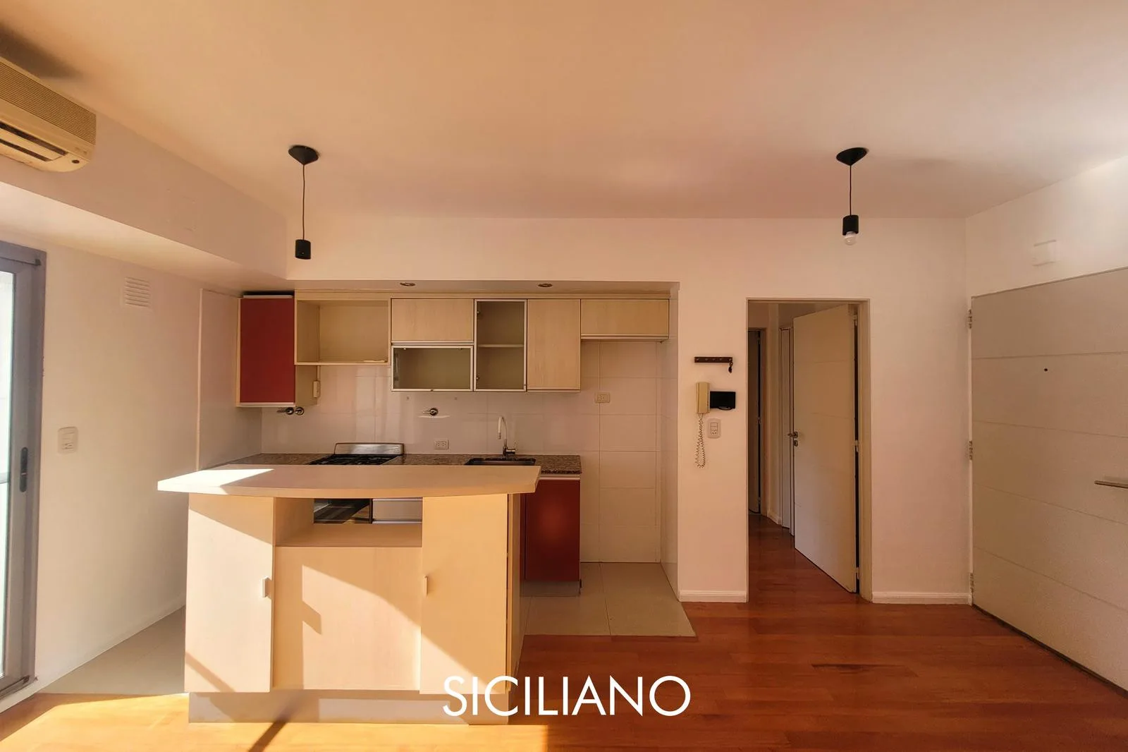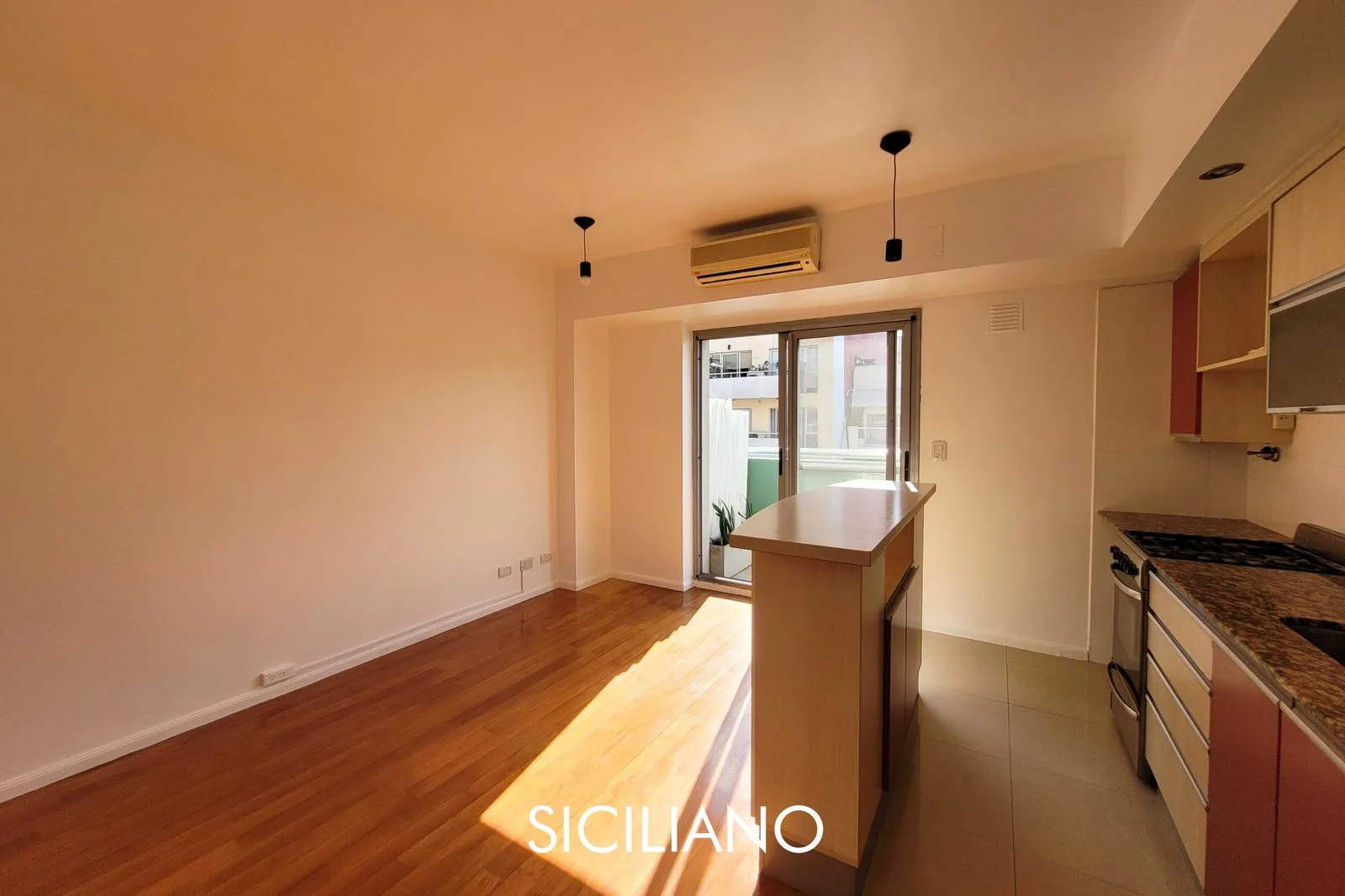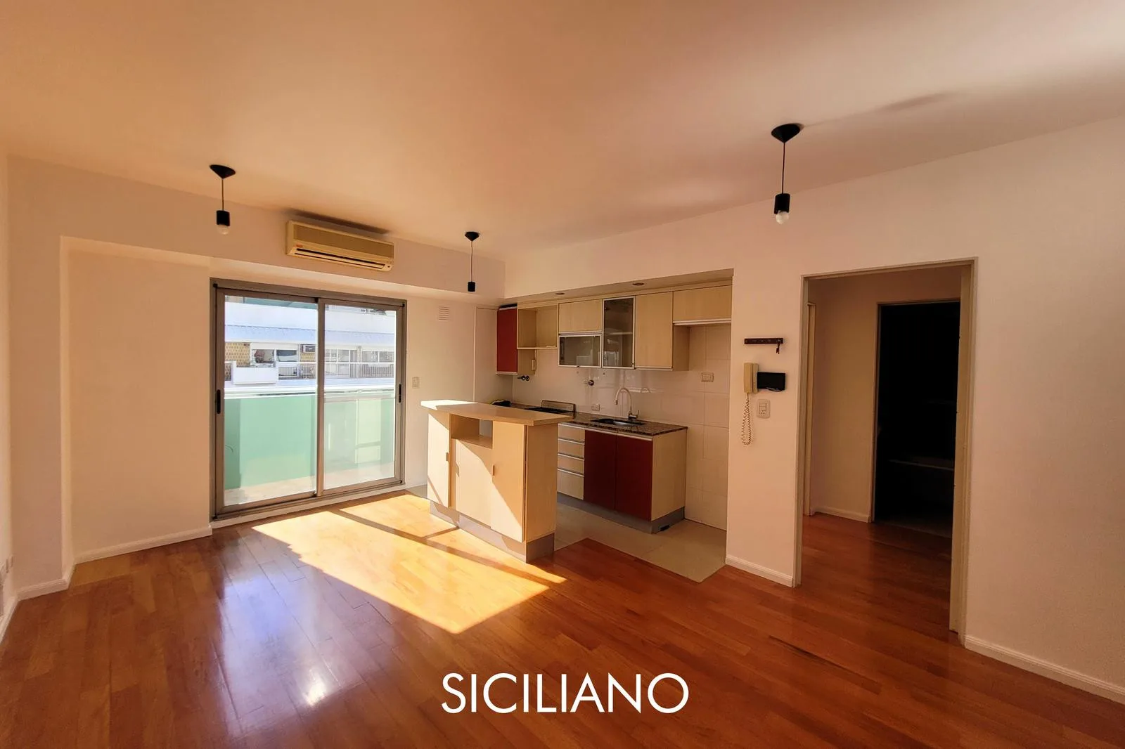 Departamento de 2 ambientes de 43.70 m² totales en el 8vo piso, al frente, con balcón corrido. Tiene cocina integrada por barra, living comedor, dormitorio con placard empotrado y baño completo con bañera. El edificio cuenta con ascensor, SUM y parrilla; expensas $90.000 (AYSA y ABL incluidos). Sobre la Av. Nahuel Huapi, entre las calles Díaz Colodrero y Pacheco.