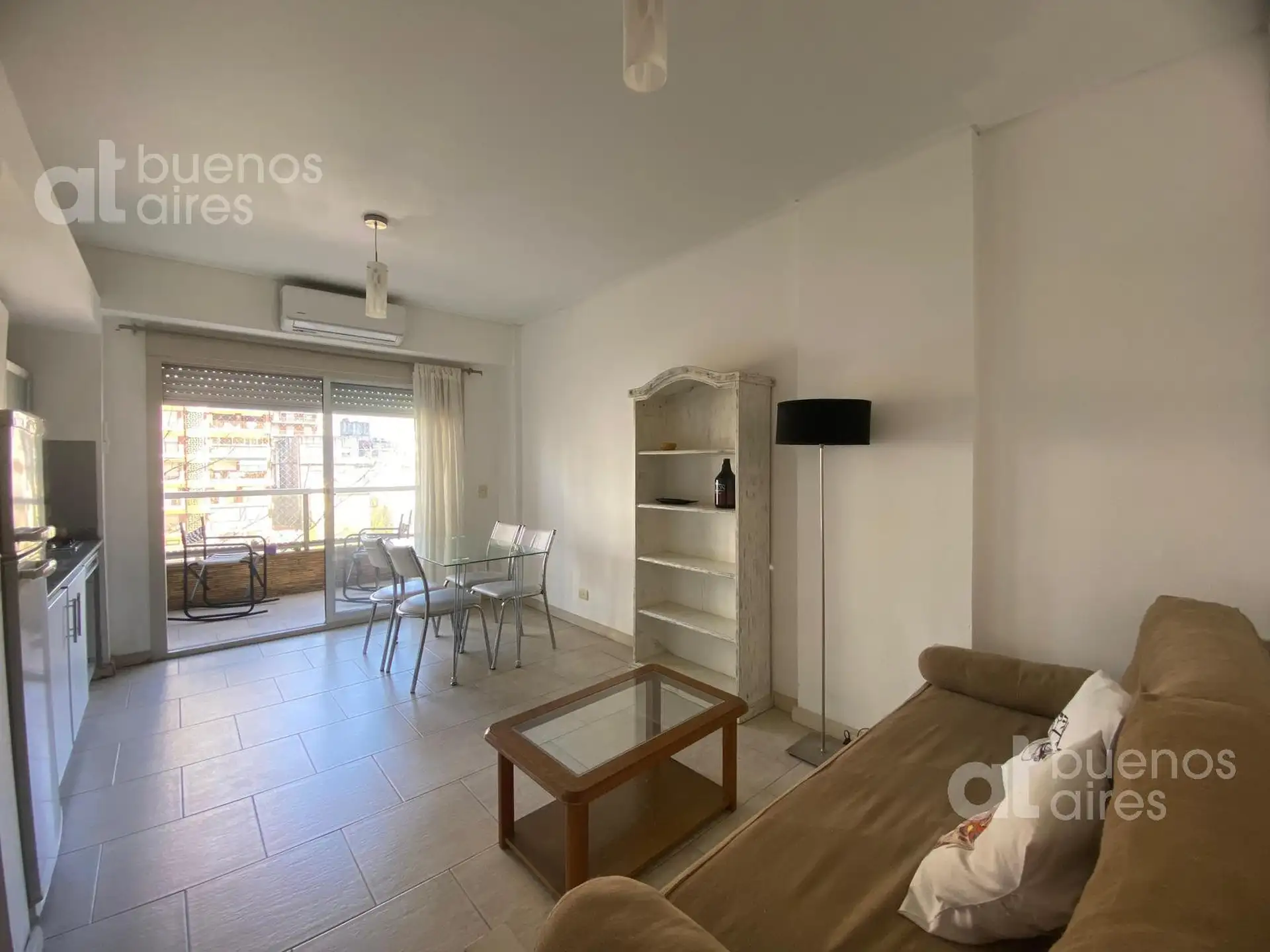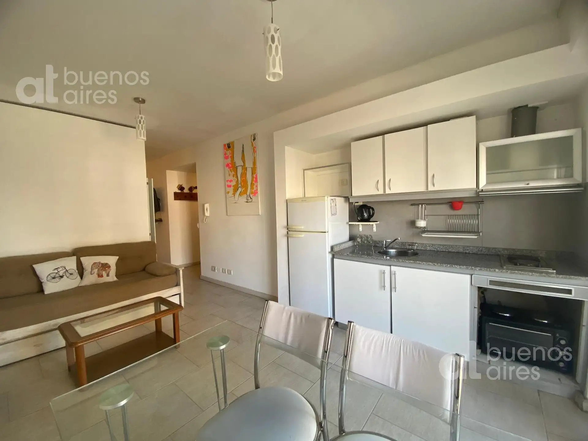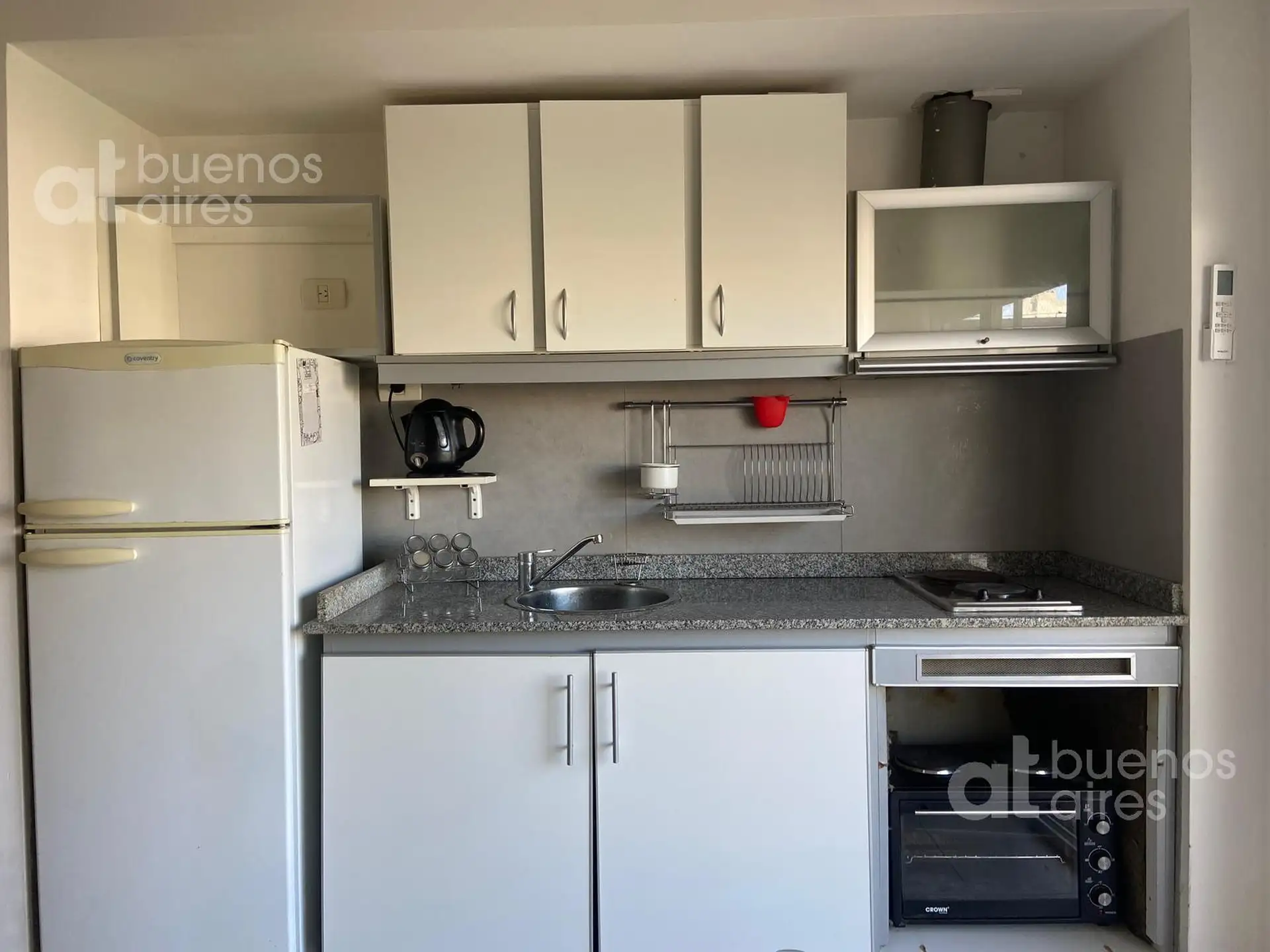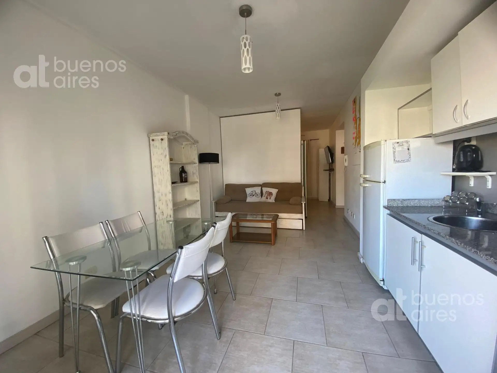 Departamento monoambiente dividido en Villa Urquiza, con balcón y cochera de cortesía. Living comedor con sillón cama y salida al balcón. Cocina integrada totalmente equipada con heladera con freezer, anafes de vitrocerámica y hornito eléctrico. Habitación con amplio armario, cama doble y smart TV de 32", más baño completo. El edificio cuenta con pileta con ducha, solarium, lavadero y gimnasio. Disponible desde 18/05/2026. El valor publicado es todo incluido, con luz e internet a cargo del inqui