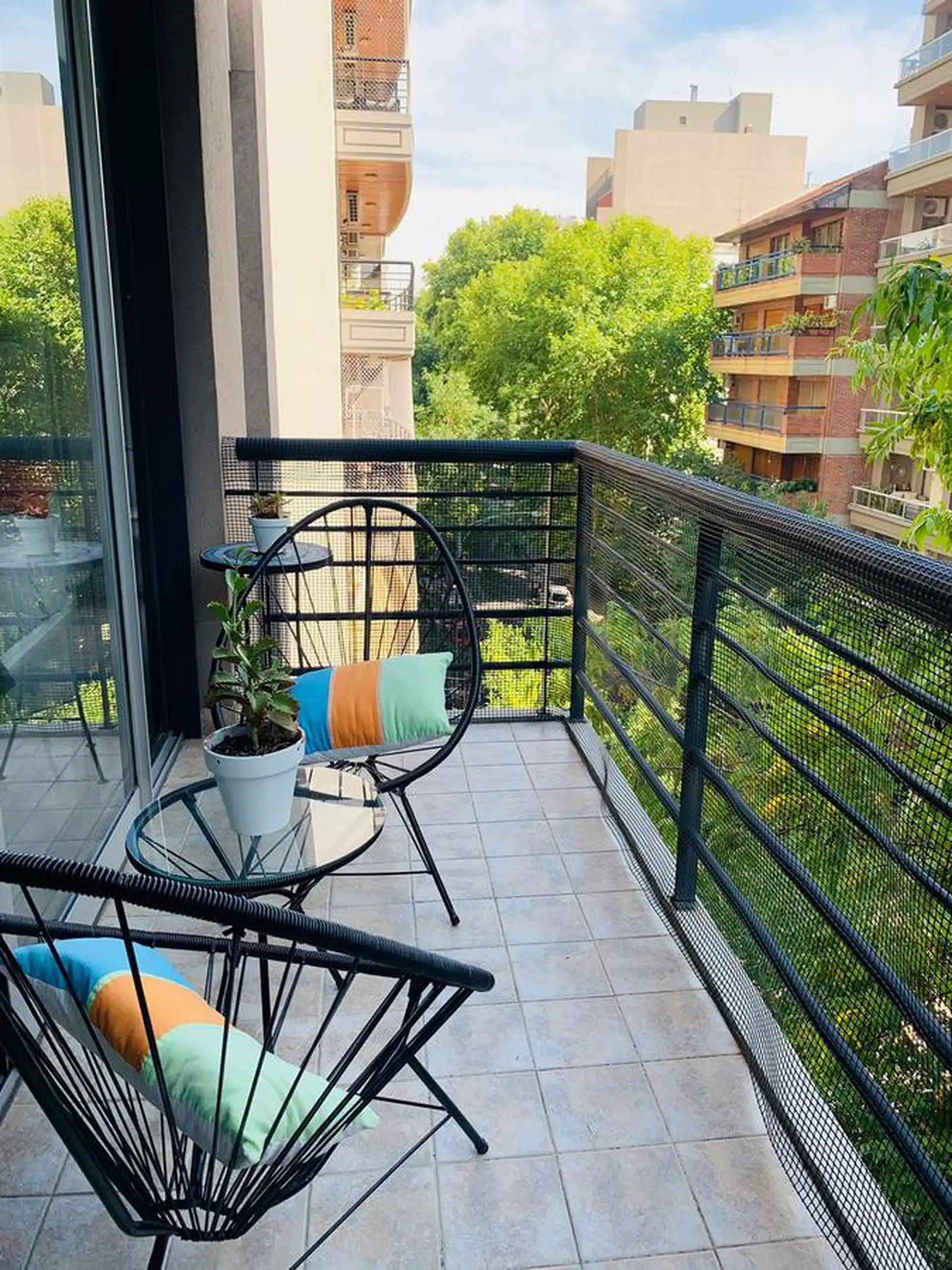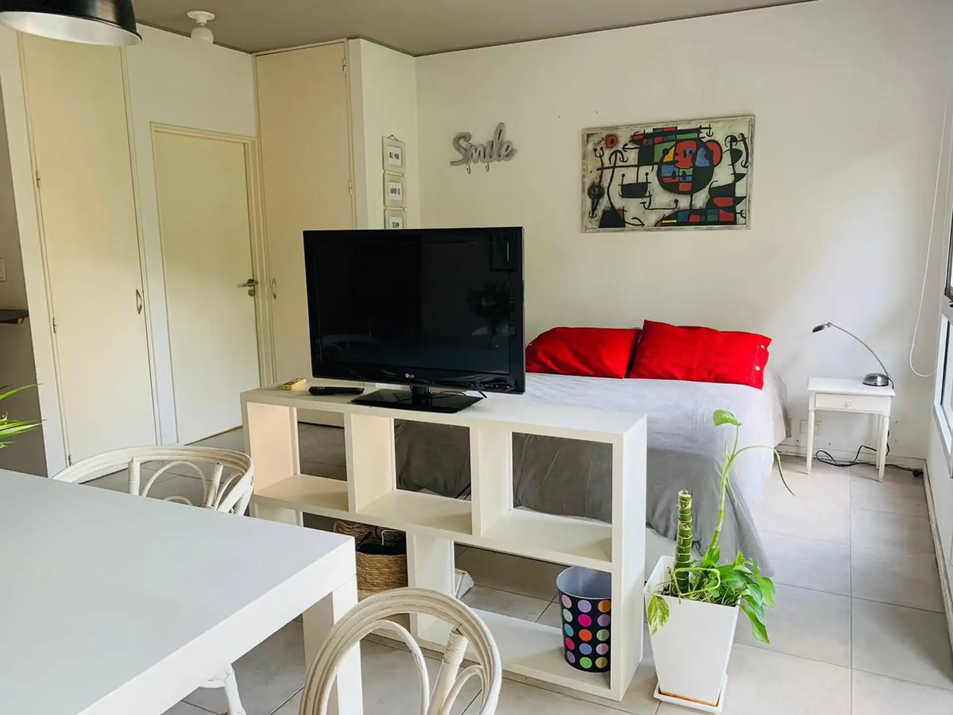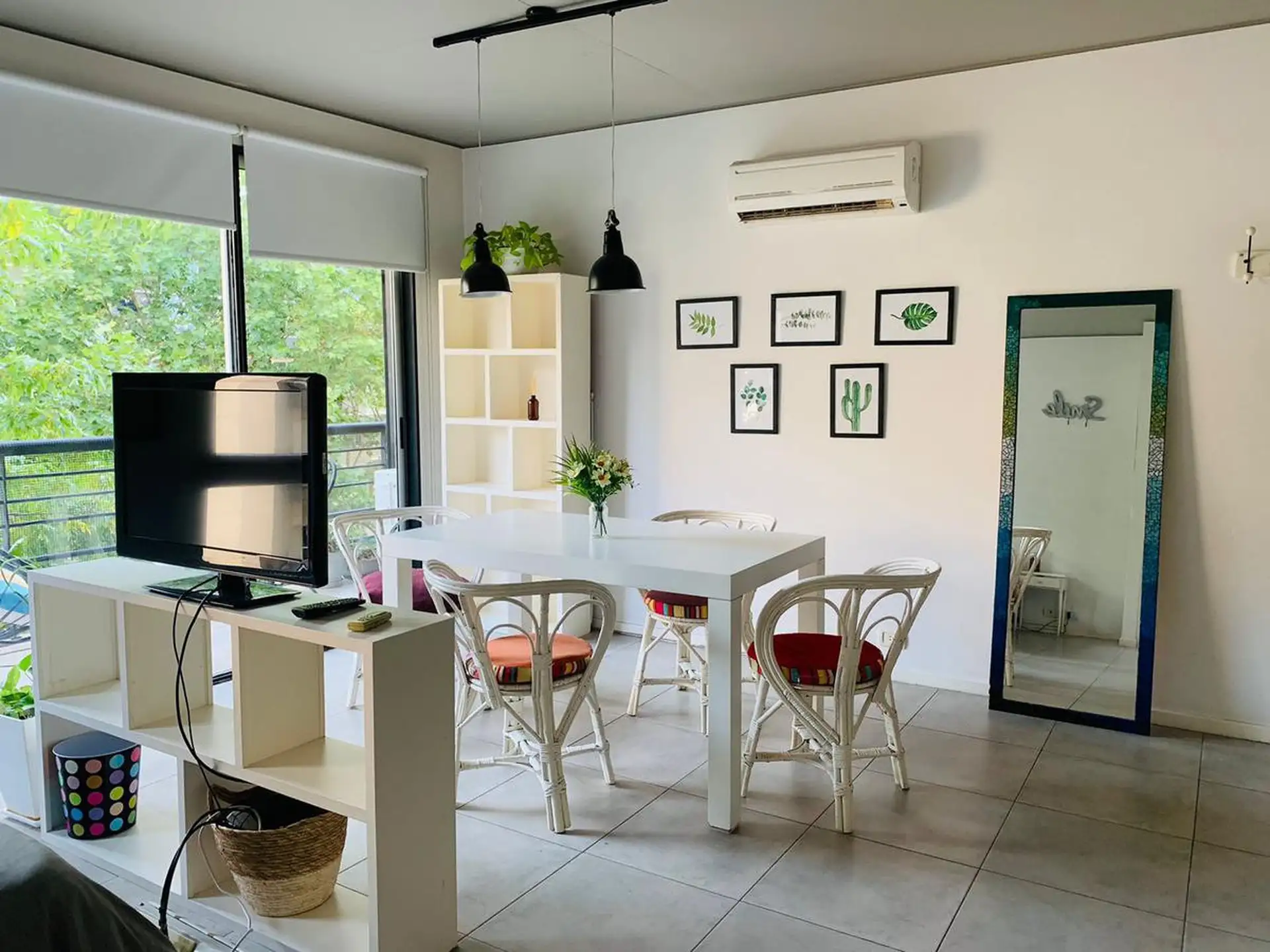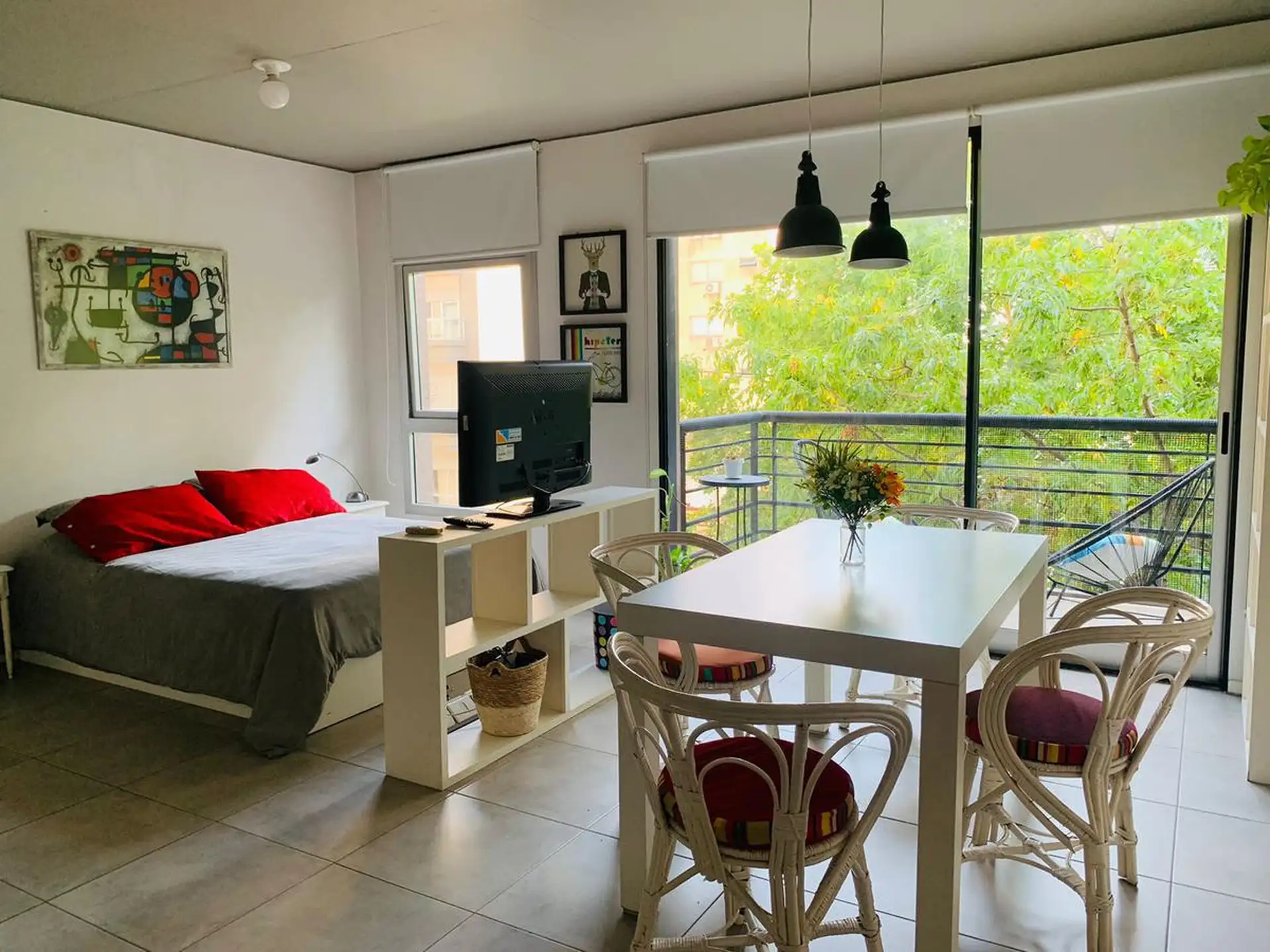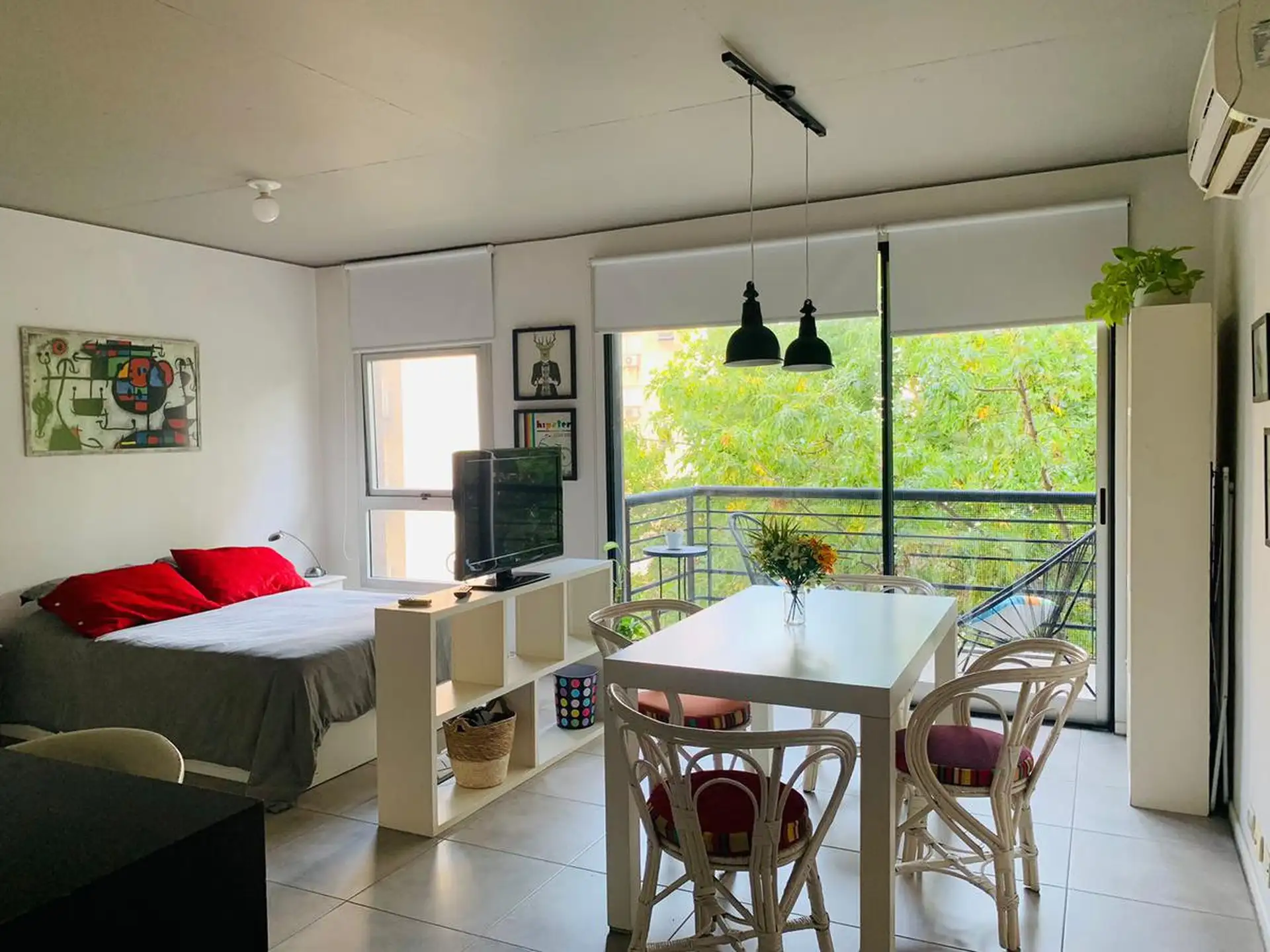 Departamento de 1 ambiente en alquiler temporario en Villa Urquiza. La unidad está equipada con mesa y sillas, mueble divisorio con TV de pantalla plana, cama doble con espacio de guardado, placard y Split frío-calor. La cocina está incorporada con desayunador y cuenta con heladera con freezer, horno eléctrico, anafe de 2 hornallas, pava eléctrica y vajilla; el baño es completo con box de ducha. El edificio dispone de cámaras de seguridad, parque, SUM, parrilla, pileta y laundry, y se ubica a 3